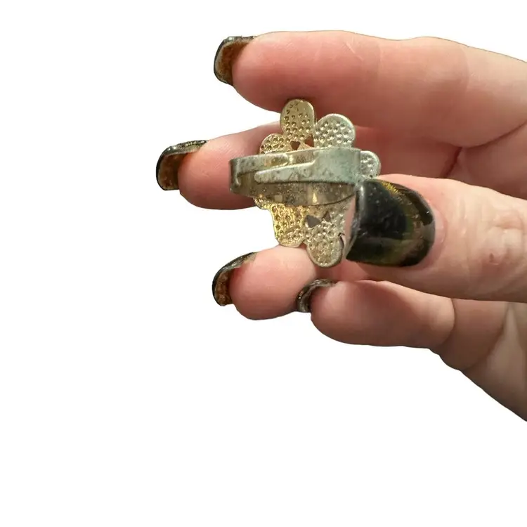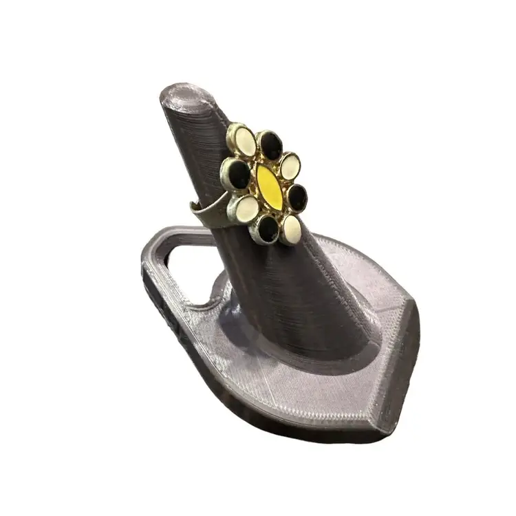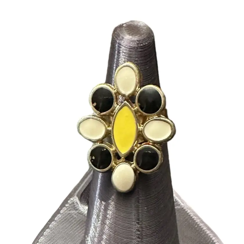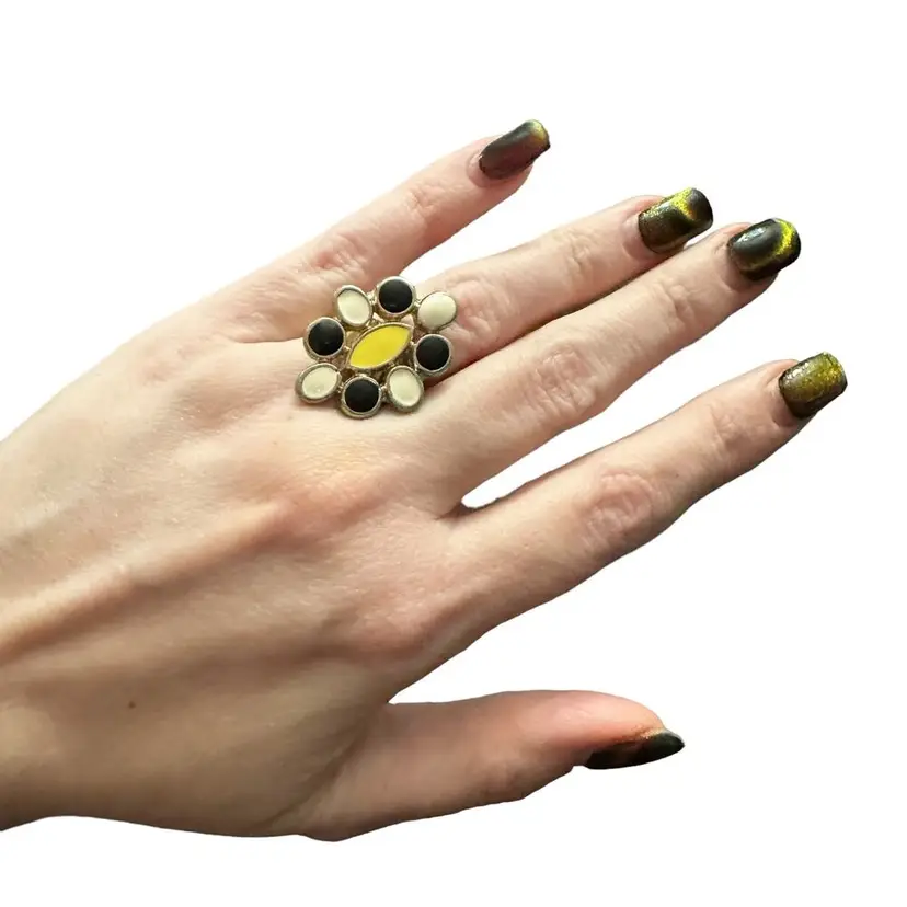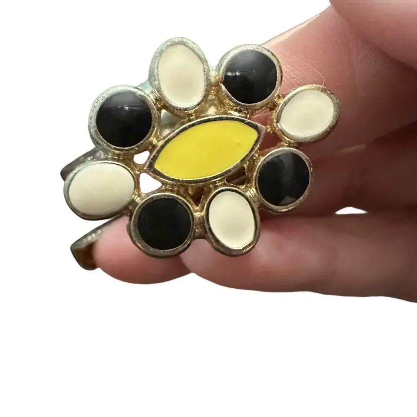 Vintage Retro Geometric Black White Yellow Adjustable Ring Size 7 And Up Retro 70s colors, ring from late 1990s Silver-toned adjustable band smallest size 7 can adjust 1-2 sizes up Acrylic and metal Groovy costume fashion jewelry