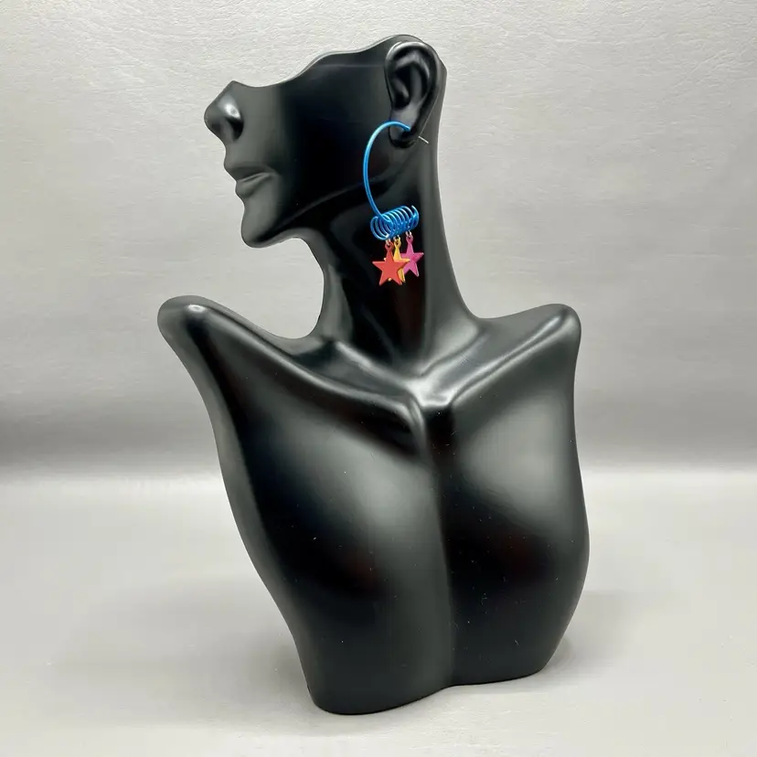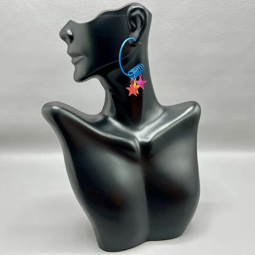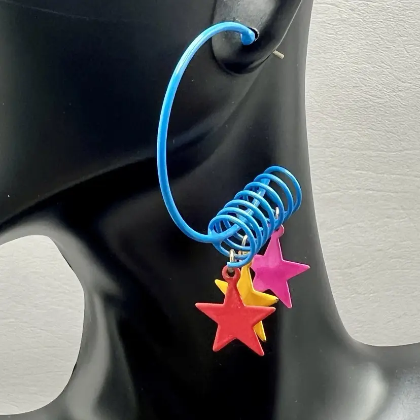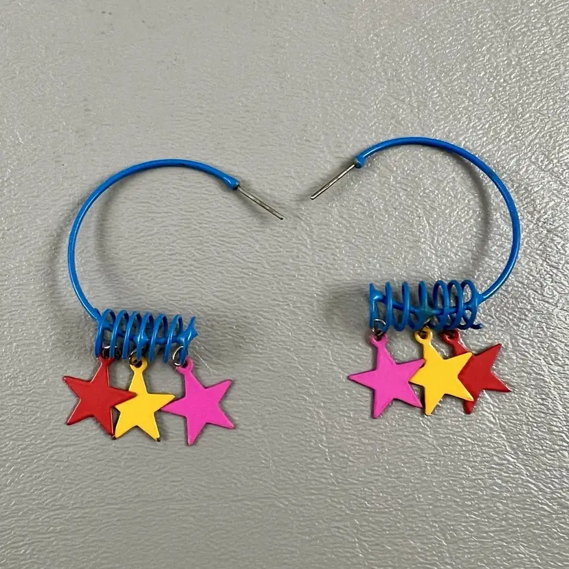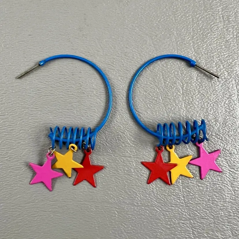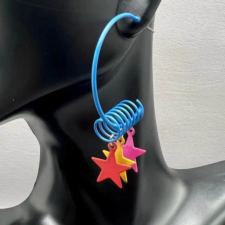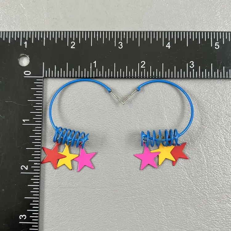Vintage Retro Hoop Earrings Star Charms Blue Spiral 1980s Colorful 1.5x2"