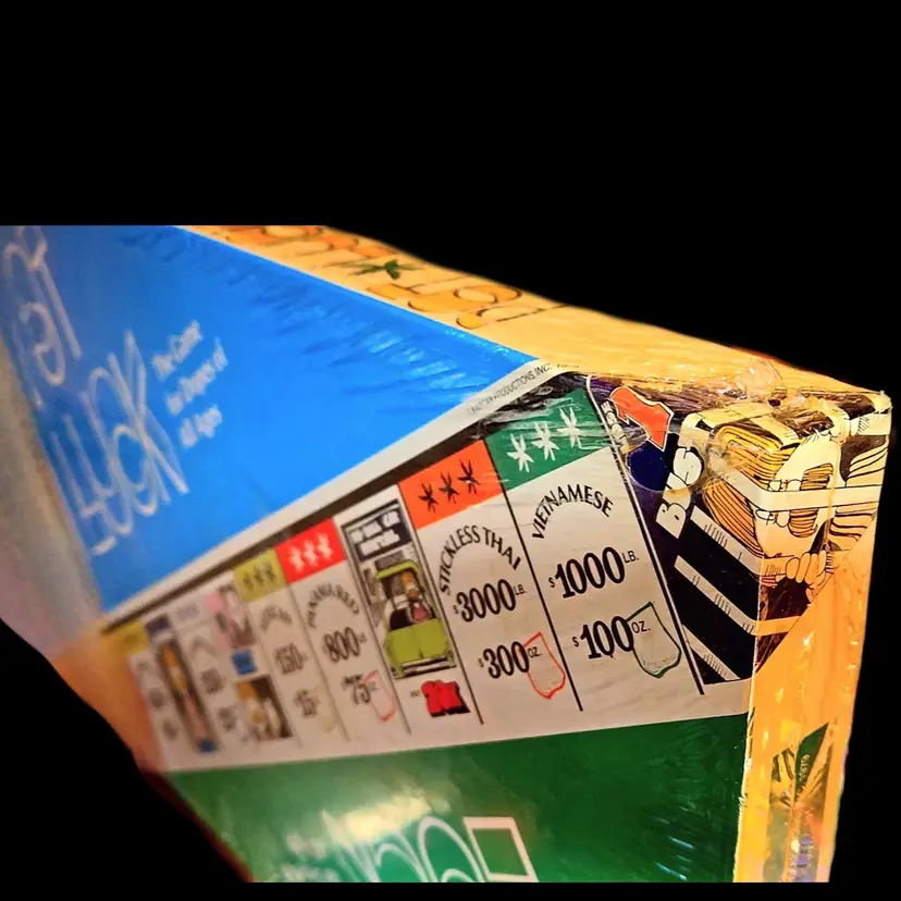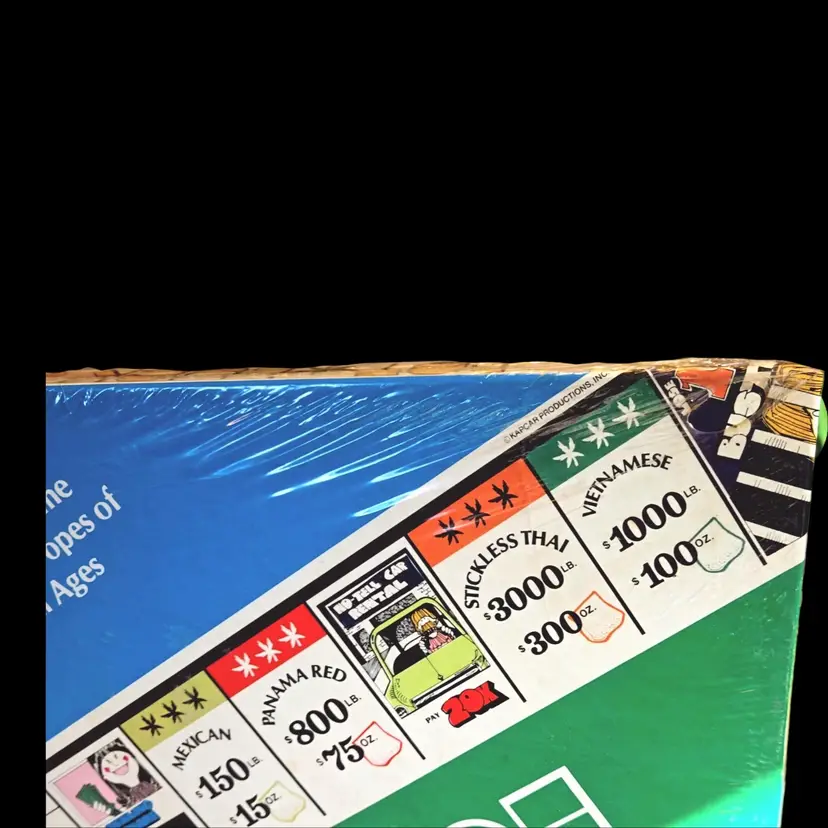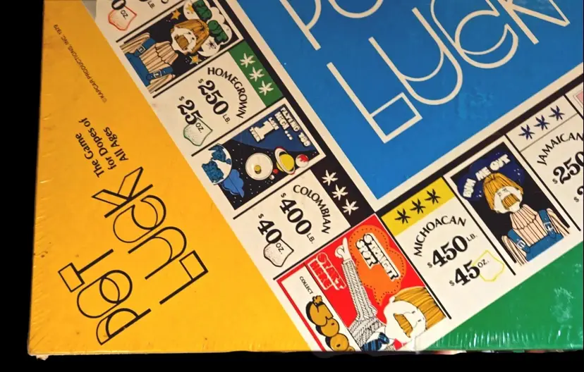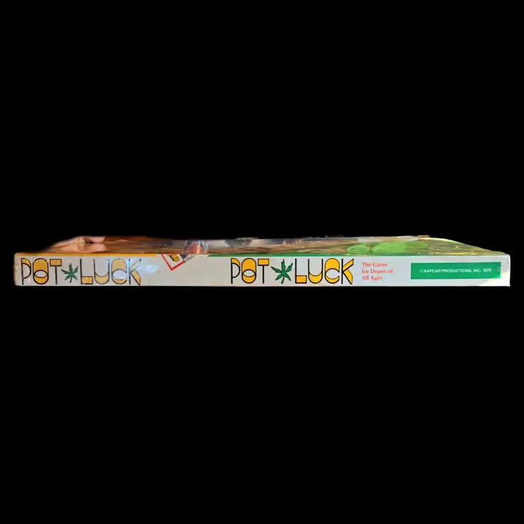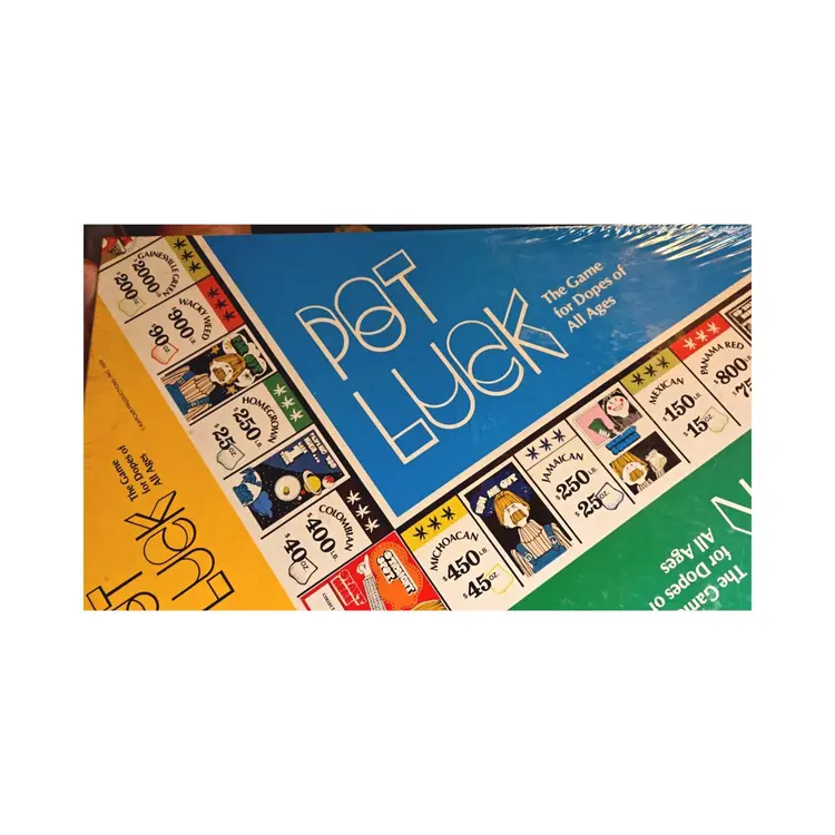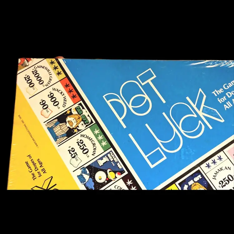 The board game, 'Pot Luck' was created in 1979 and today is a genuine collector's item. Kapcar Productions introduced a board game designed just for lovers of such amusements...This was a cannabis-based version of Monopoly with economic humor 2 to 6 players buy and sell major amounts of cannabis instead of hotels. Its creators defined it as a simple game with little content so that anyone could enjoy it without complications. Recommended, however, for those 18 and older. On the game board the "Bum Me Out" and "Far Out" cards have colorful cartoon art, but the Pot (property) cards have color photos of the different types of pot you can own! This particular game is sealed, unopened with some shelf life and just a couple of tears in the cellophane. **See pictures. Ships within 2 business days. Thank you for looking!