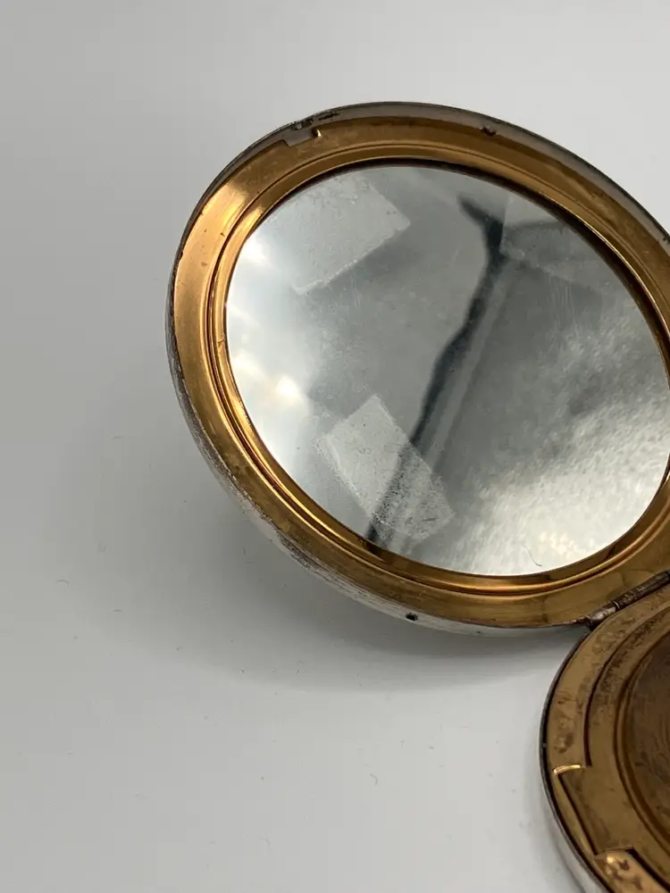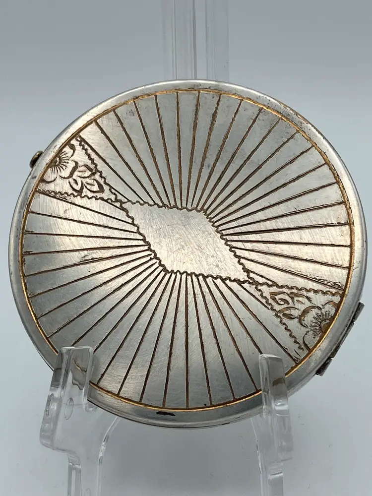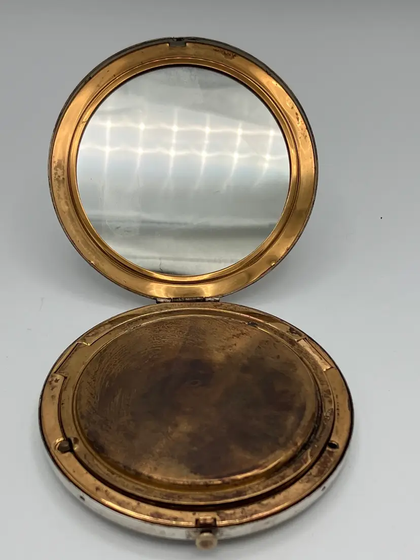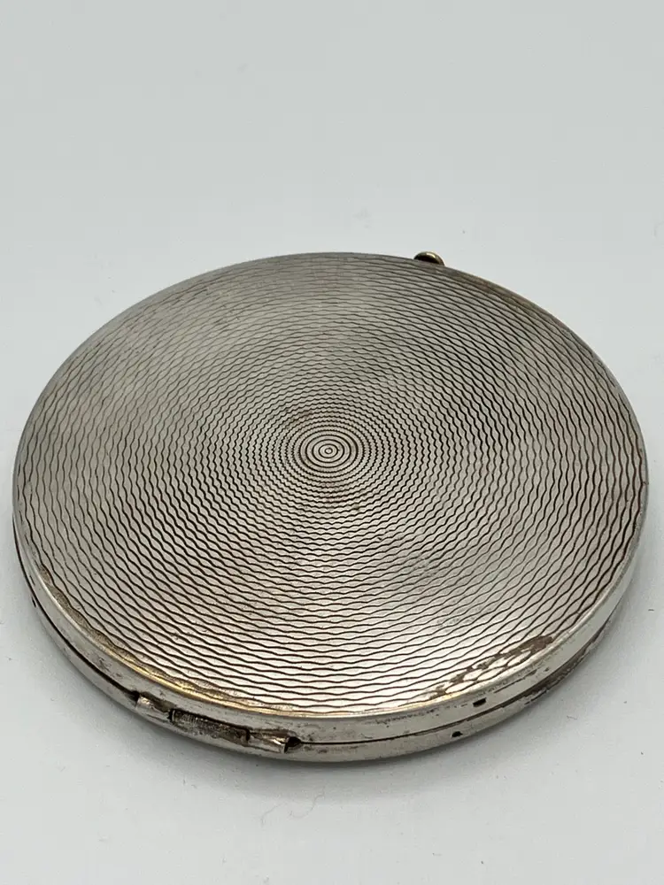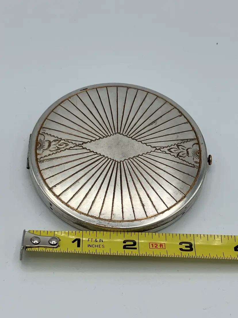 This vintage art deco style Rex Fifth Avenue Pancake Powder Compact is a gem for collectors. This compact was made in the United States and is approx 3.5 in across. The outside is sterling silver plated and the Rex Fifth Avenue mark is imprinted on the inside. The inside closure is missing the clasp but the powder shield clasp is intact. There is no actual powder in the compact. Very sturdy piece.