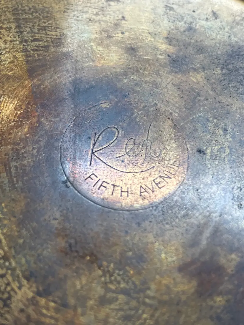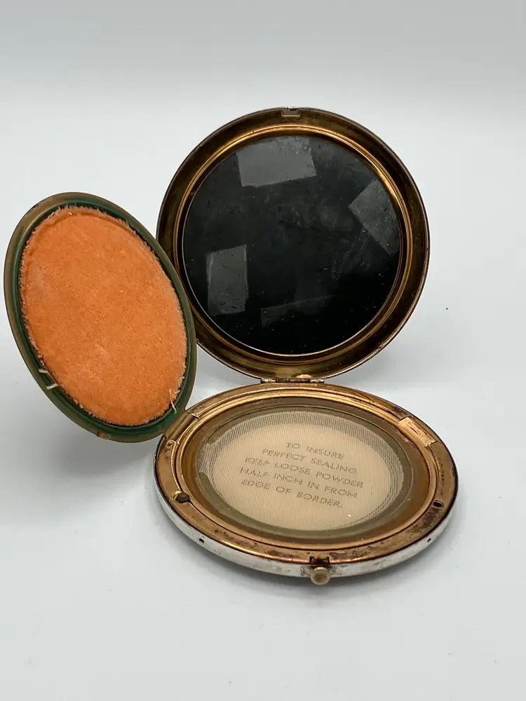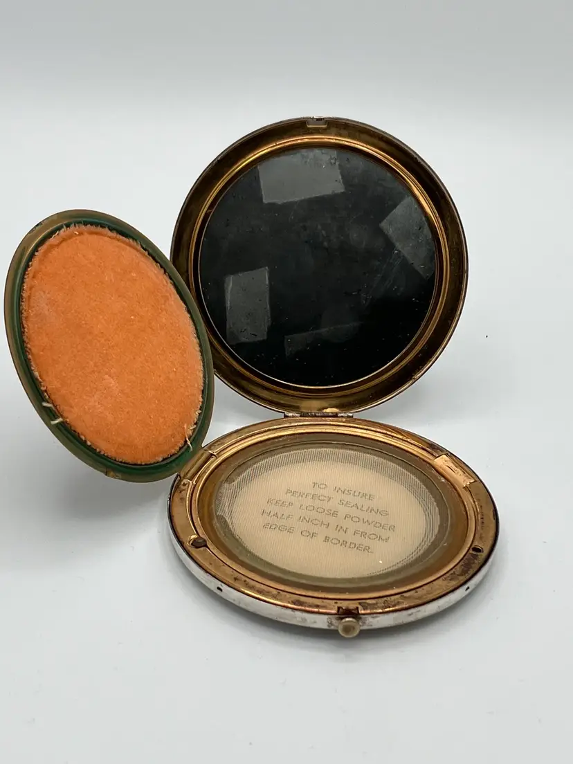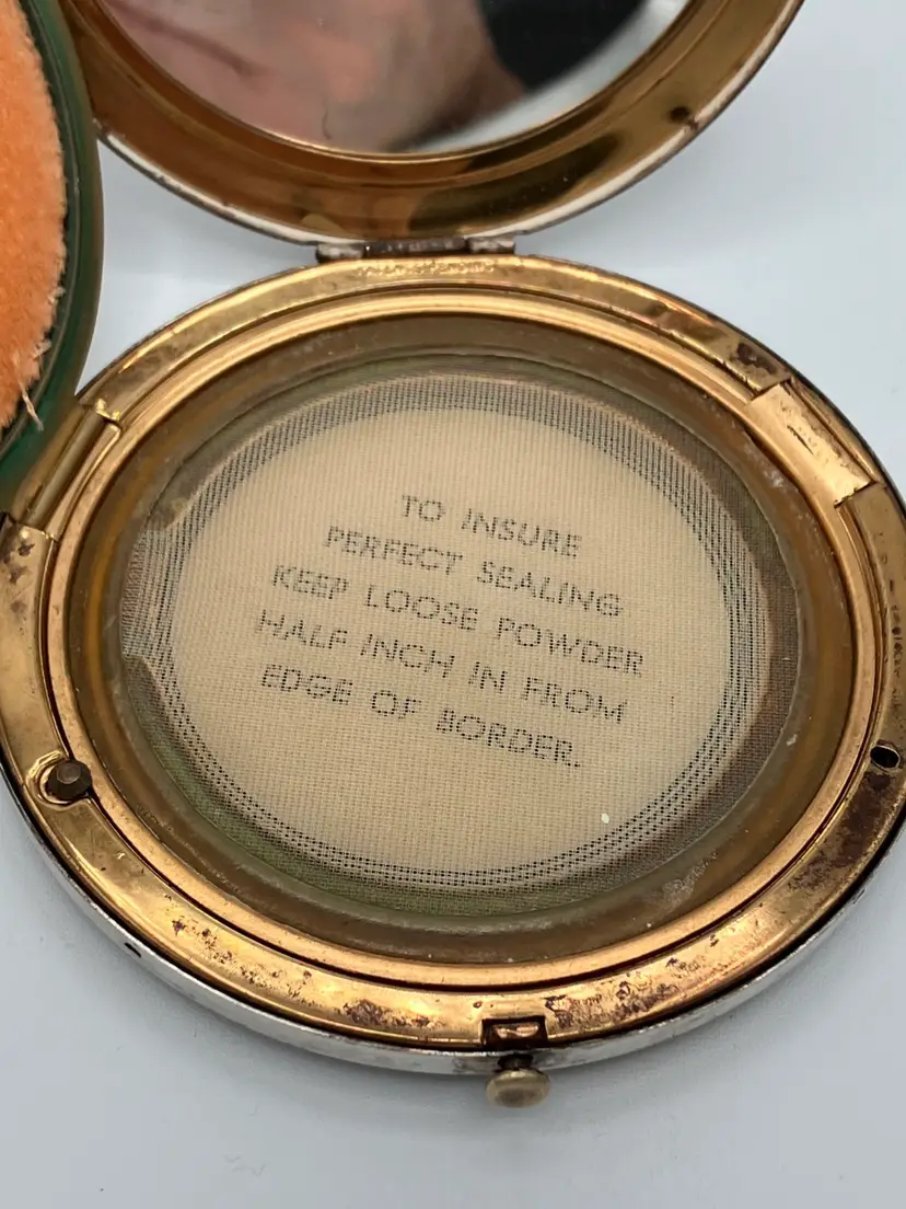 This vintage art deco style Rex Fifth Avenue Pancake Powder Compact is a gem for collectors. This compact was made in the United States and is approx 3.5 in across. The outside is sterling silver plated and the Rex Fifth Avenue mark is imprinted on the inside. The inside closure is missing the clasp but the powder shield clasp is intact. There is no actual powder in the compact. Very sturdy piece.