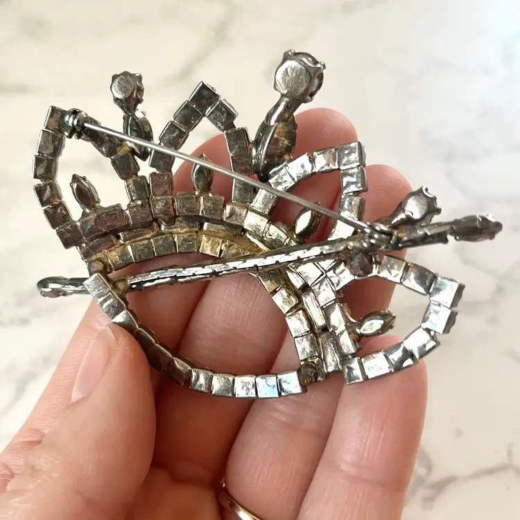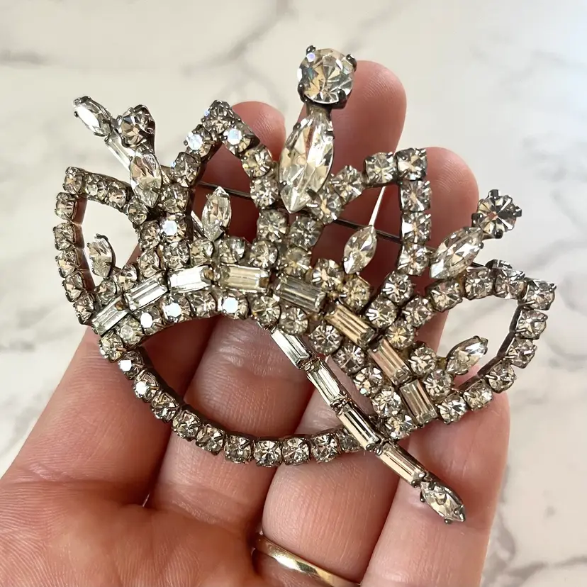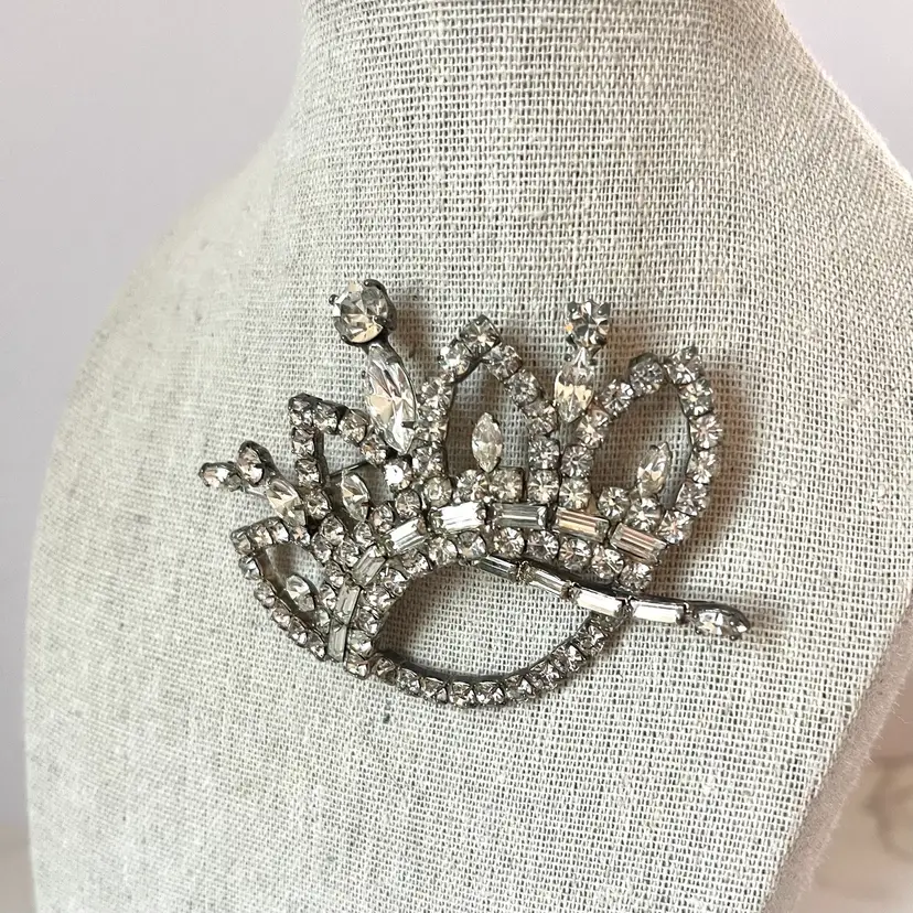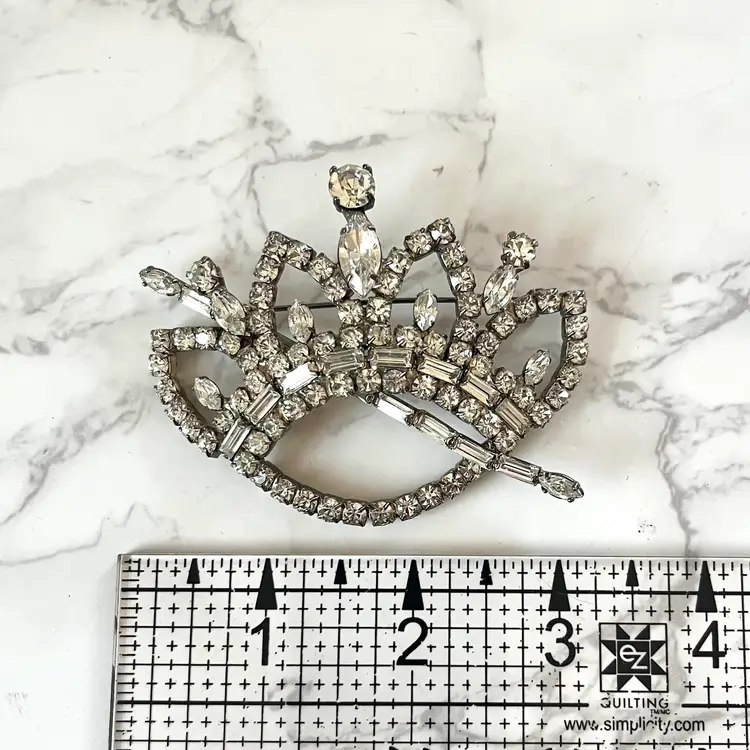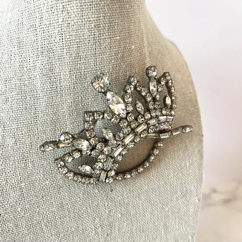 This vintage brooch is in excellent condition. No dead or missing stones. It measures about 3 inches in length. Really unique and sparkly!
