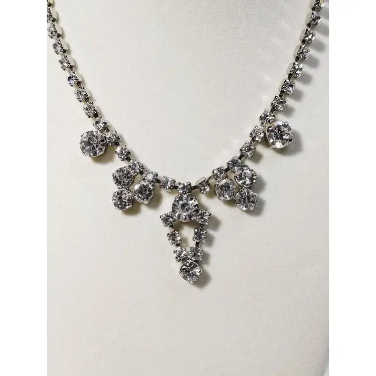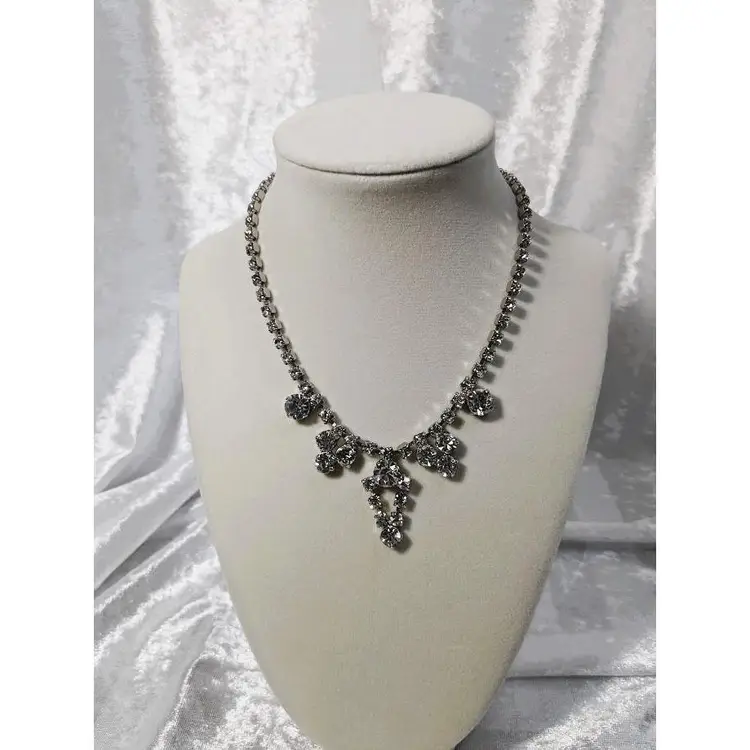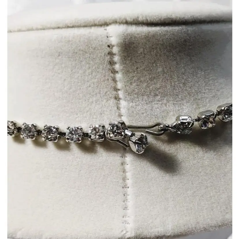 Add a touch of vintage glamour to your evening with this dazzling rhinestone choker necklace. Perfect for special occasions, this piece features a classic design with sparkling stones that catch the light beautifully. The necklace is adjustable to ensure a comfortable fit. Each stone is facetted and securely attached.