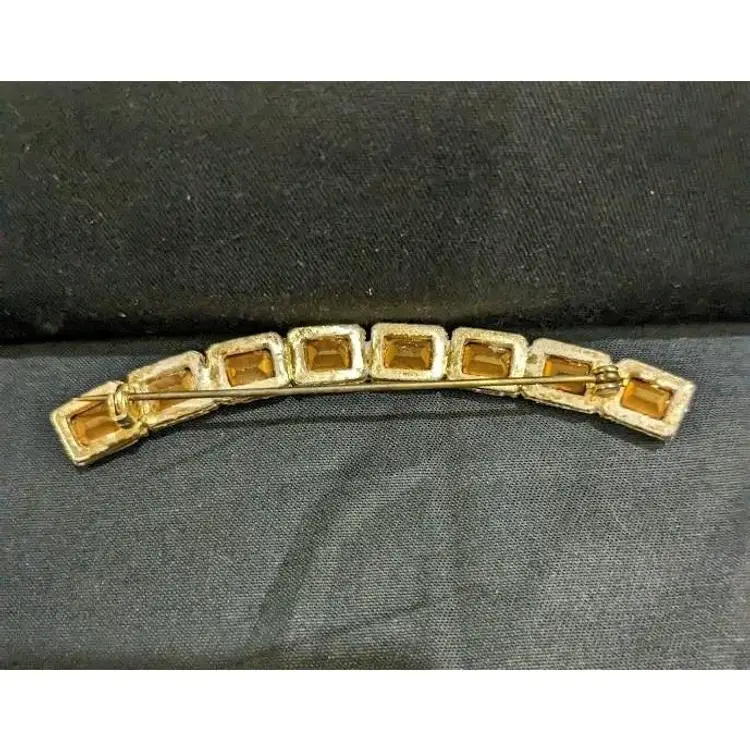 I've never seen anything like it!! It's an beautiful vintage curved bar brooch. It features 8 facetted emerald cut clear crystal stones with gold foil back set in a gold tone metal. It's approximately 4 1/2 inches long and each of the 8 stones is 3/8" x 1/4". It has no markings and I couldn't find anything similar. It's truly a unique piece!