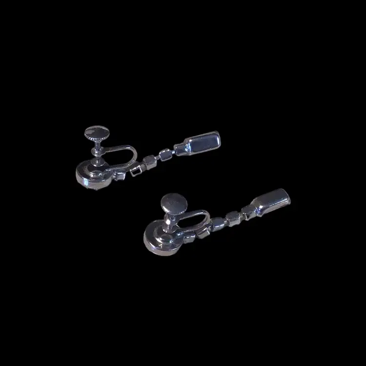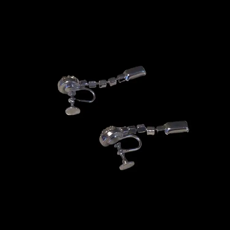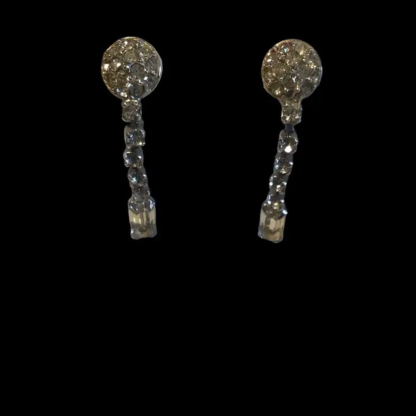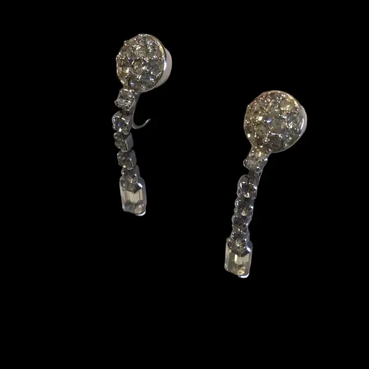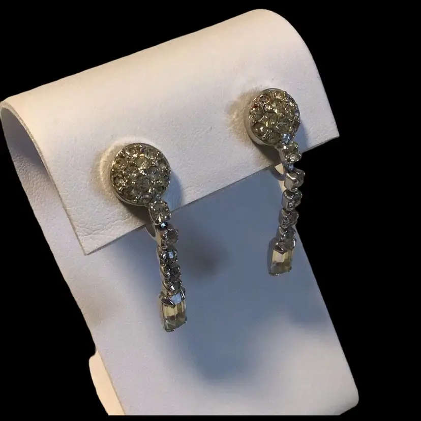 Clear rhinestone pave & prong set, baguette dangle 1 3/4" long screw back. #164