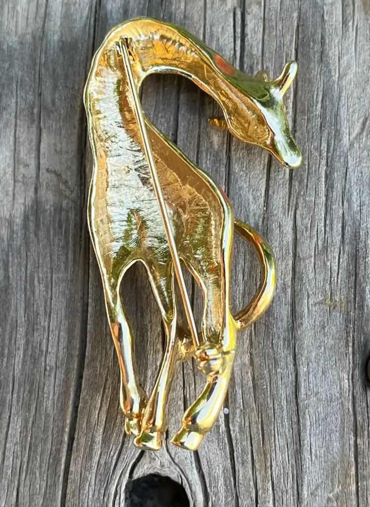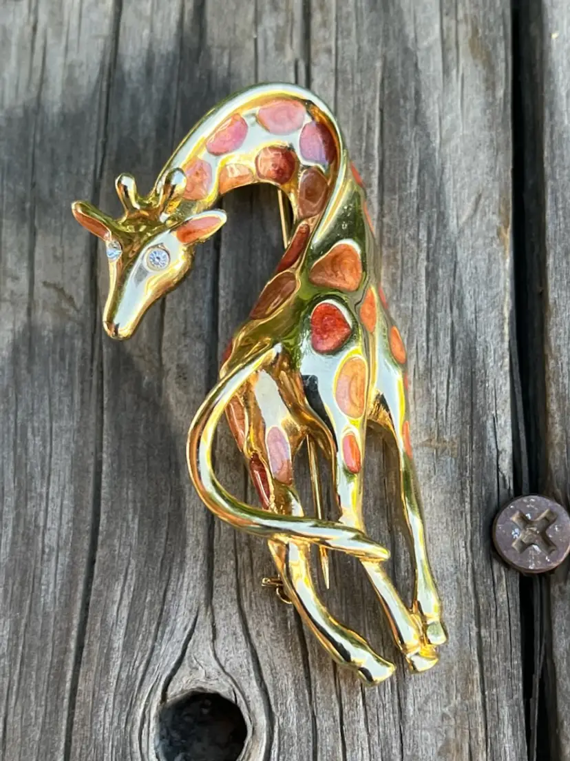 A beautiful vintage giraffe pin! Rhinestone eyes. Enamel looks like Goldstone. Orange swirl with gold highlights. 2 1/2 inches tall and 1 1/4 inches wide. Great condition. Clasp holds tight.