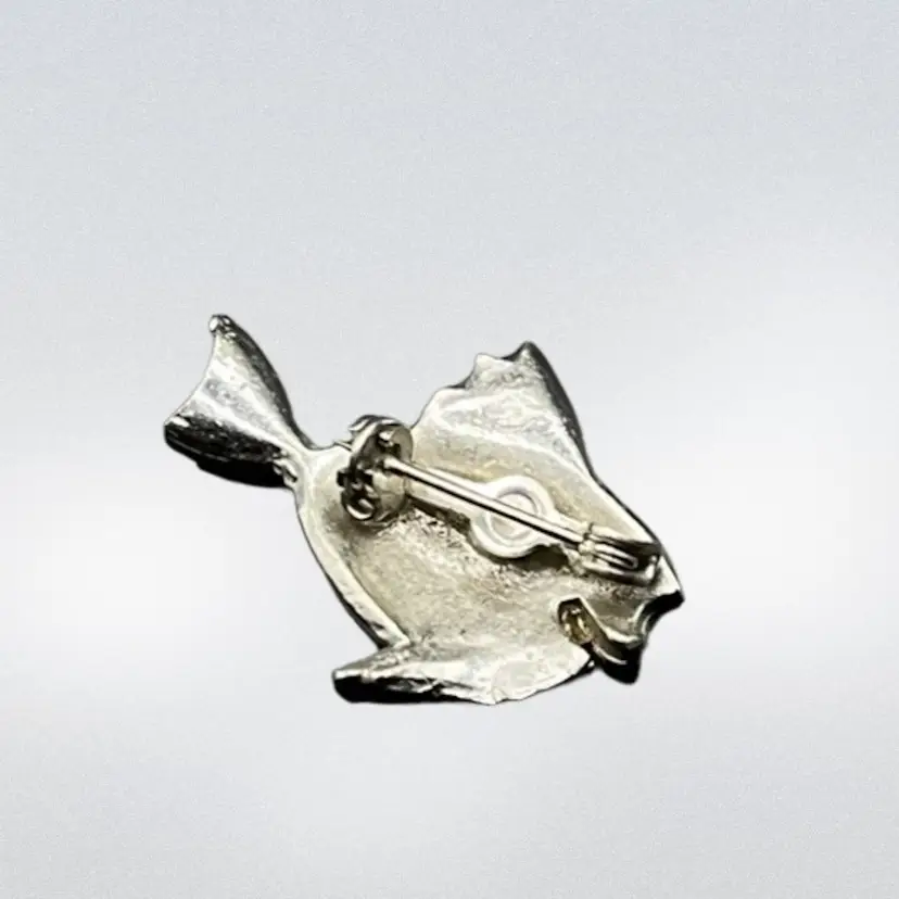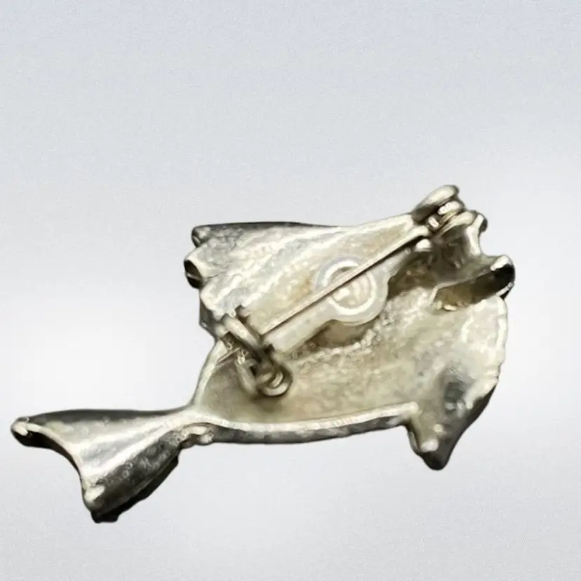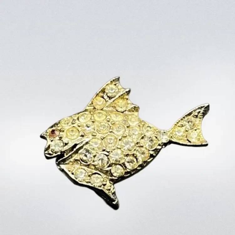 Petite brooch, measures 1.25” wide and 1” tall. Good vintage condition, unmarked, uncleaned. Clear stones throughout with an amber colored eye. No stones missing.