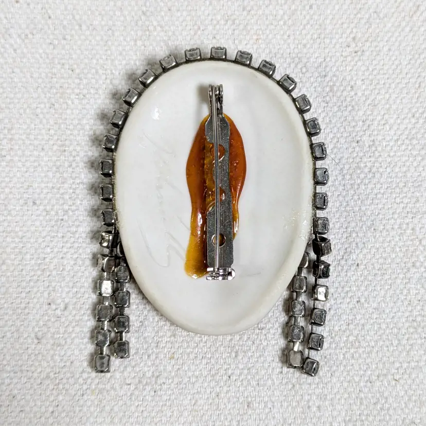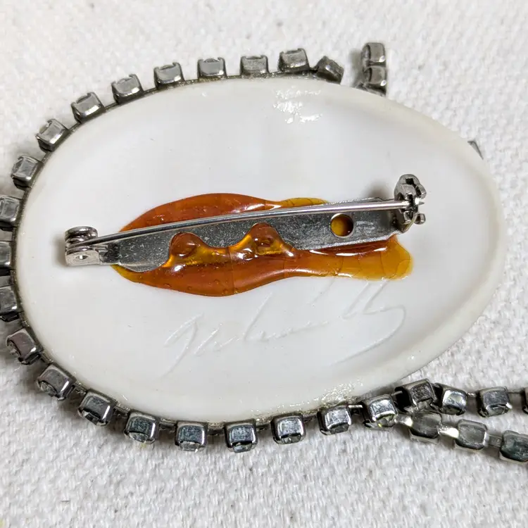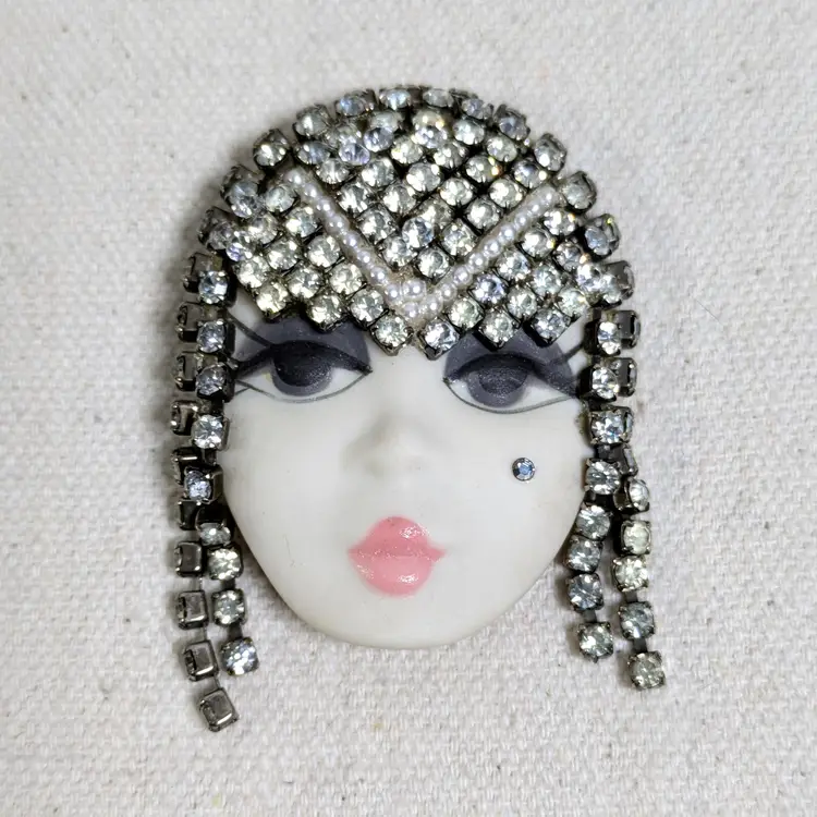Charming vintage brooch featuring a flapper face adorned with sparkling rhinestones and faux pearls. Perfect for adding a touch of 1920s glamour to any outfit. Signed on the back.