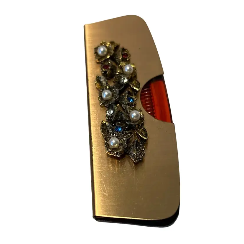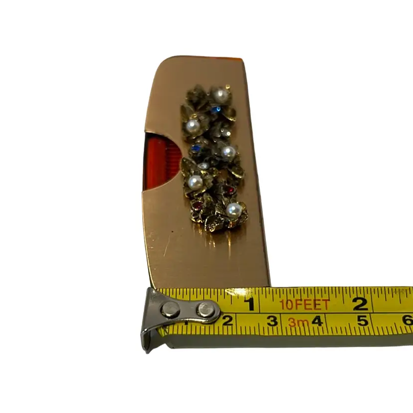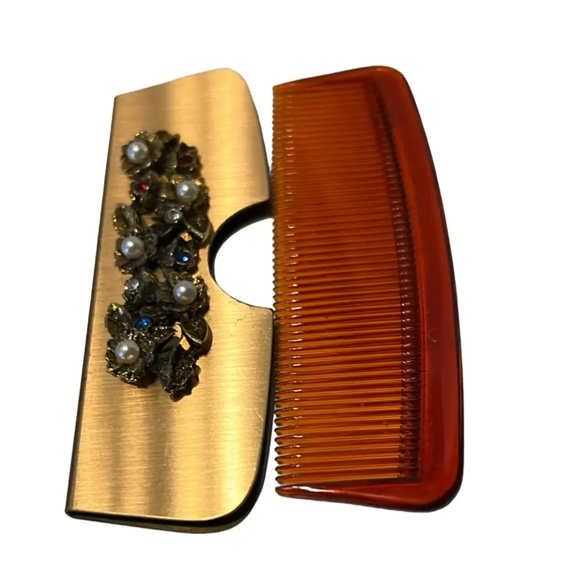 This handbag comb is in very good shape it is adorn with flowers that showcase faux pearls, sapphires and rubies. There are a quite of few surface marks from its years, but overall it is in splendid condition. Please look at the accompanying photos for condition and exact measurements.