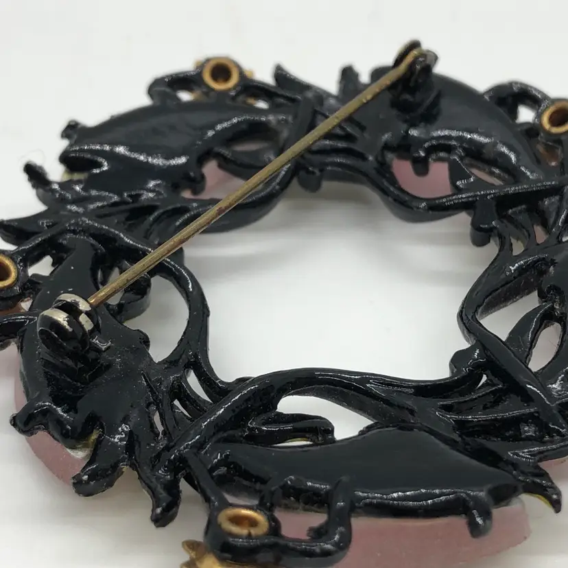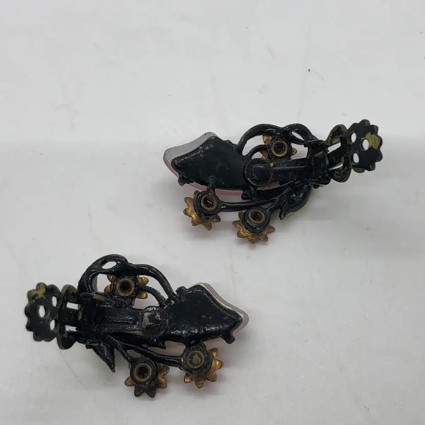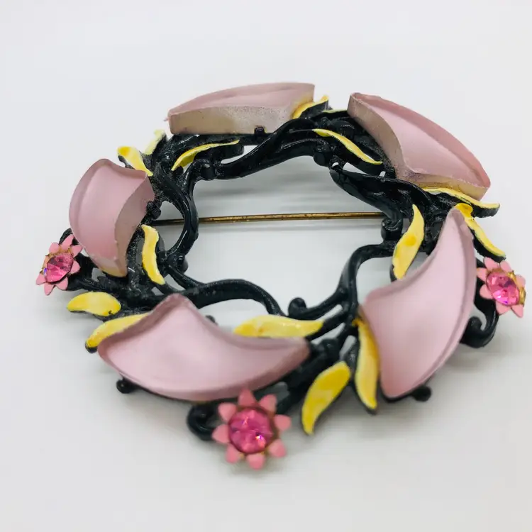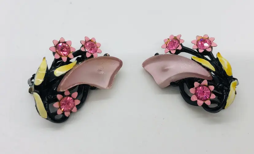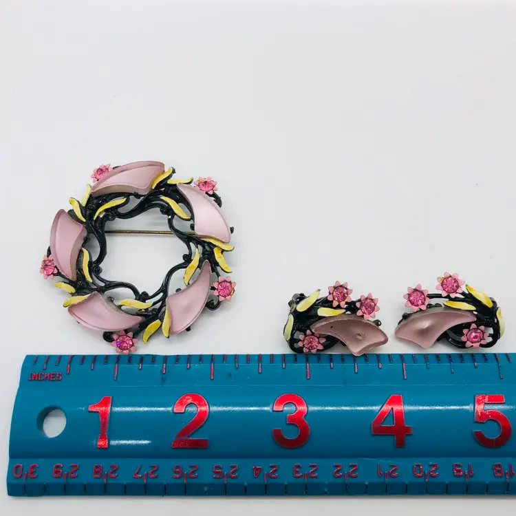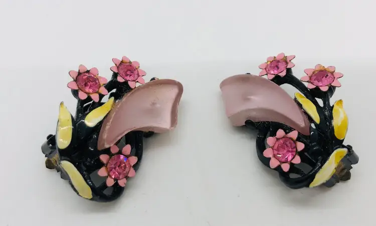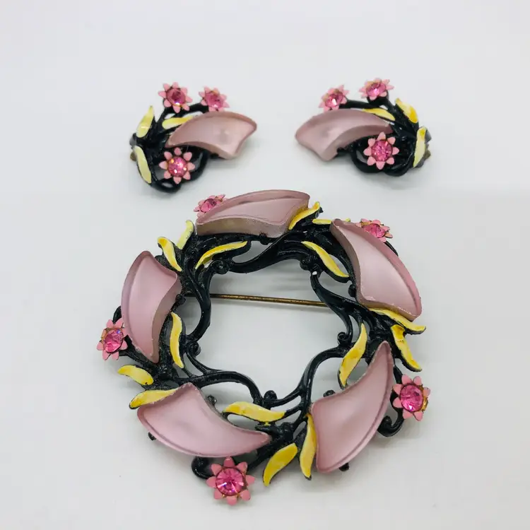 This Beautiful Brooch and Earring set is full of color. Set on a black enamel background are pink Rhinestone flowers and yellow leaves. It comes with clip on matching earrings. All in great working order. There is very slight black enamel loss due to natural age. Please check photos. Thank you.
