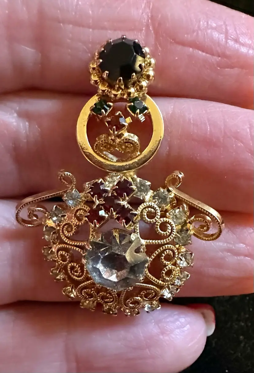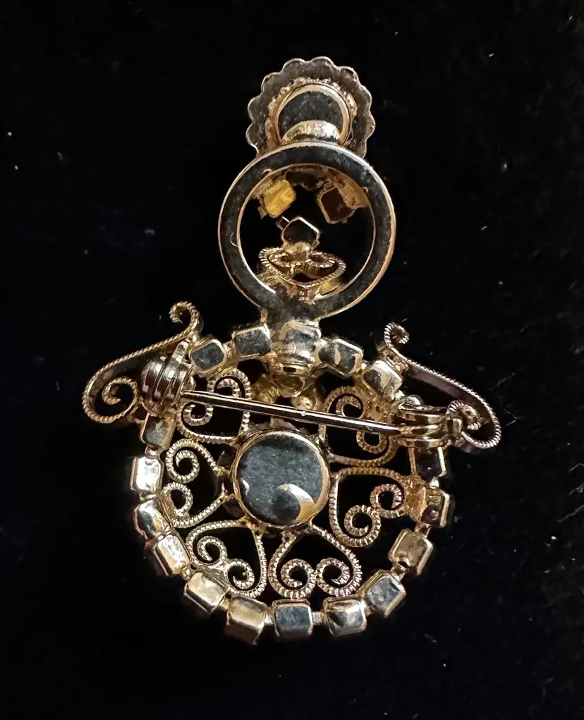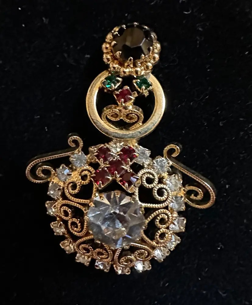 Very cute vintage snowman pin is gold tone with scroll work and prong set rhinestones. It is 1 5/8” x 1.25”. Very good condition.