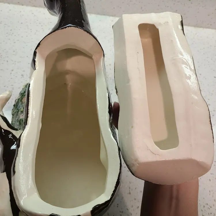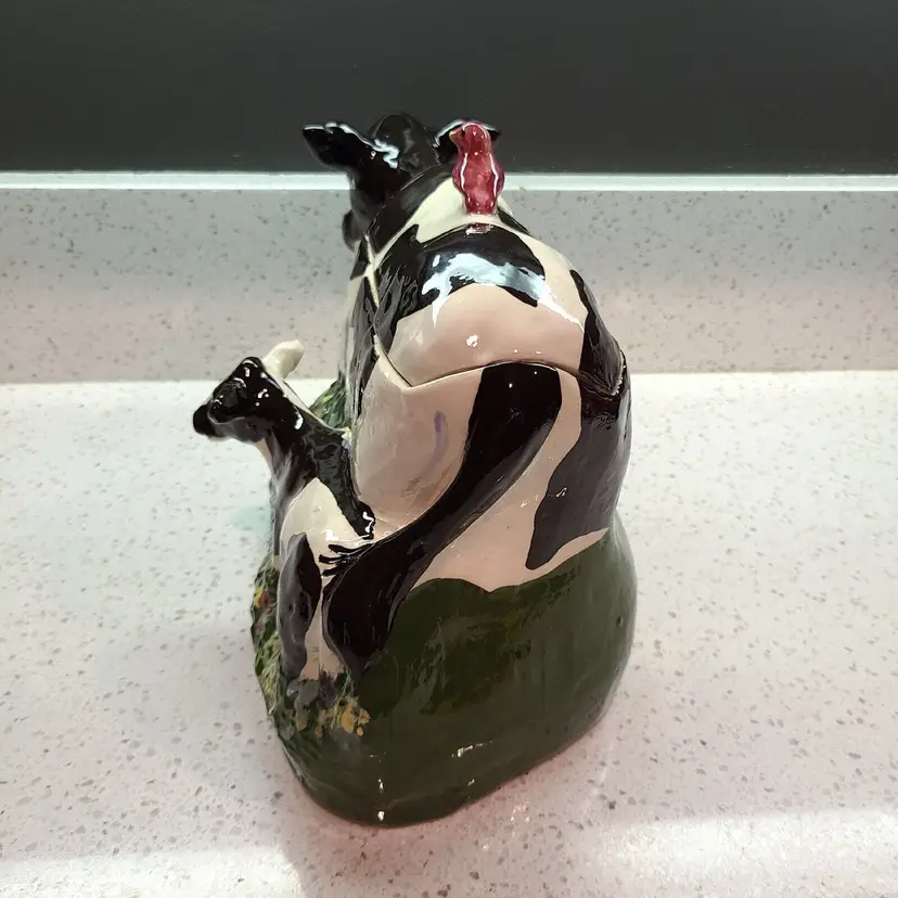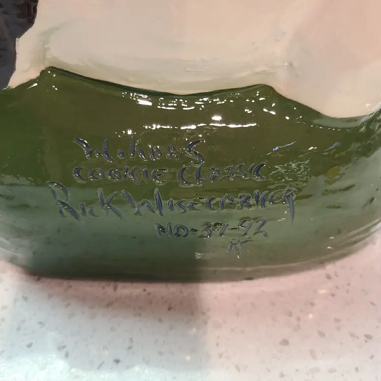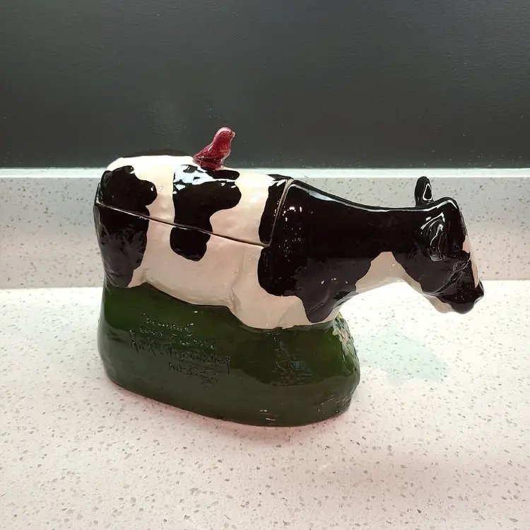 This listing is for a hard to find Rick Wisecarver handcrafted cookie jar. Features a mother cow and her calf strolling through grass with a red bird on the back. Marked "Wihoa's Cookie Classic Rick Wisecarver No. 37 1992". No chips, cracks, or crazing. Measures about 9.25" tall and 14" long.