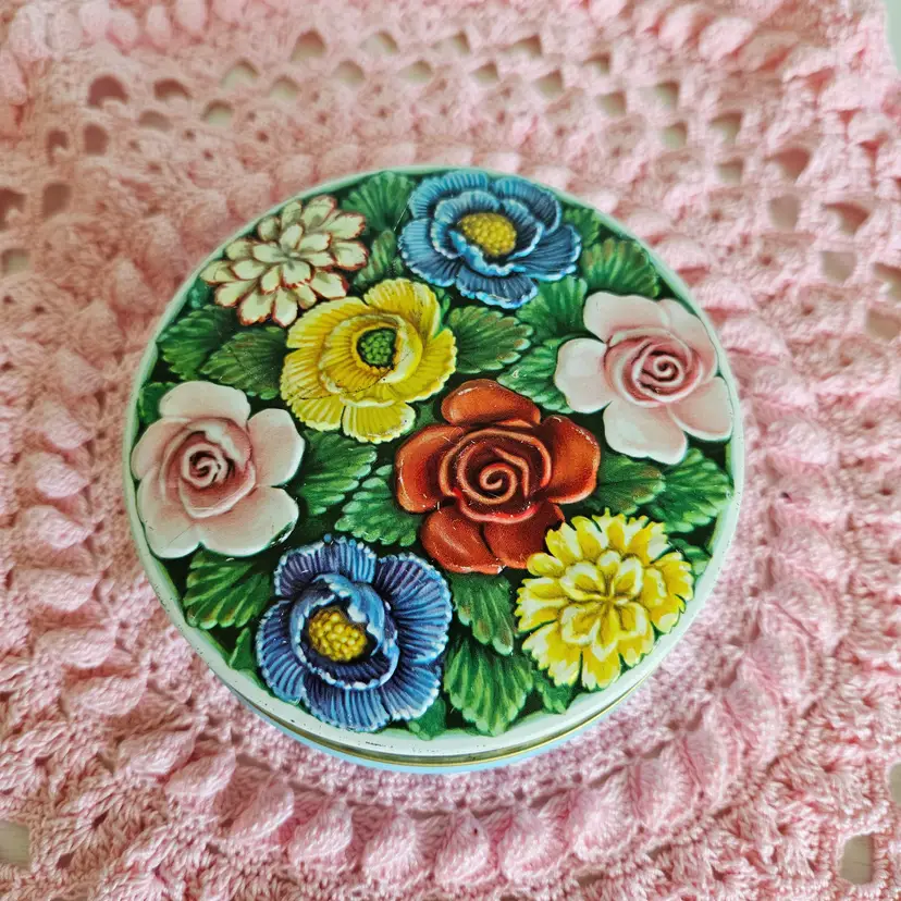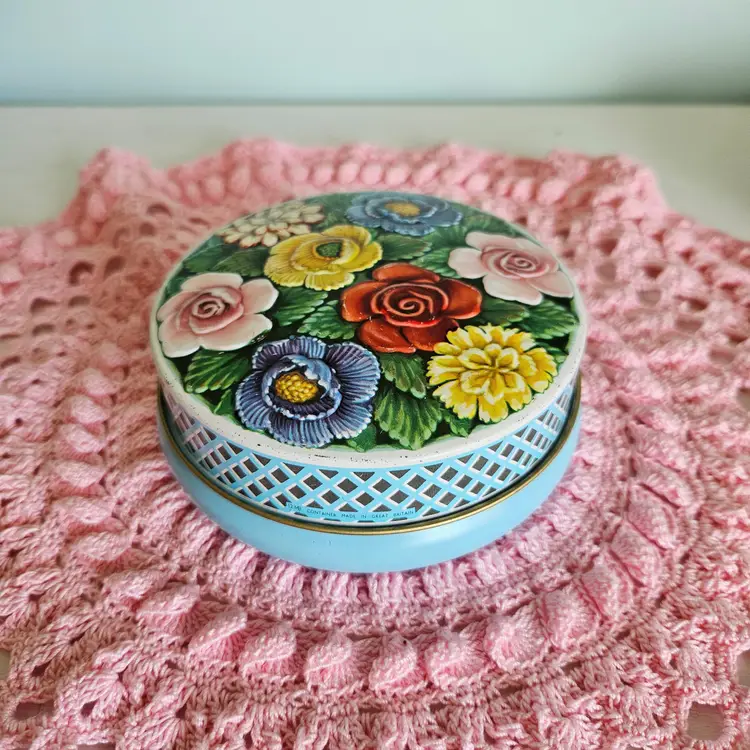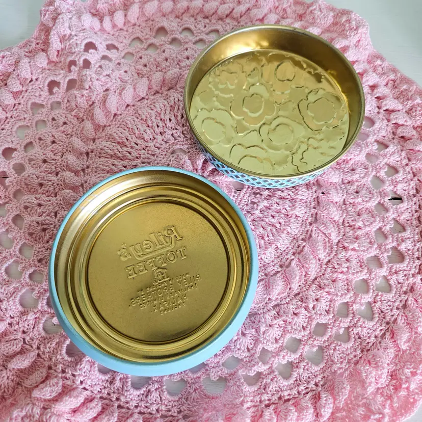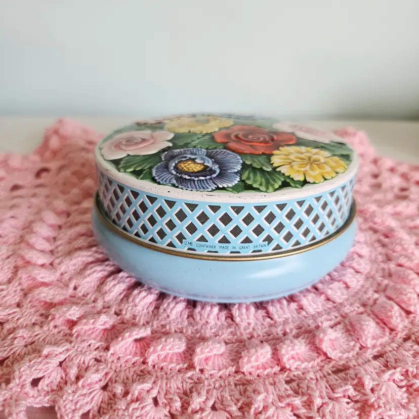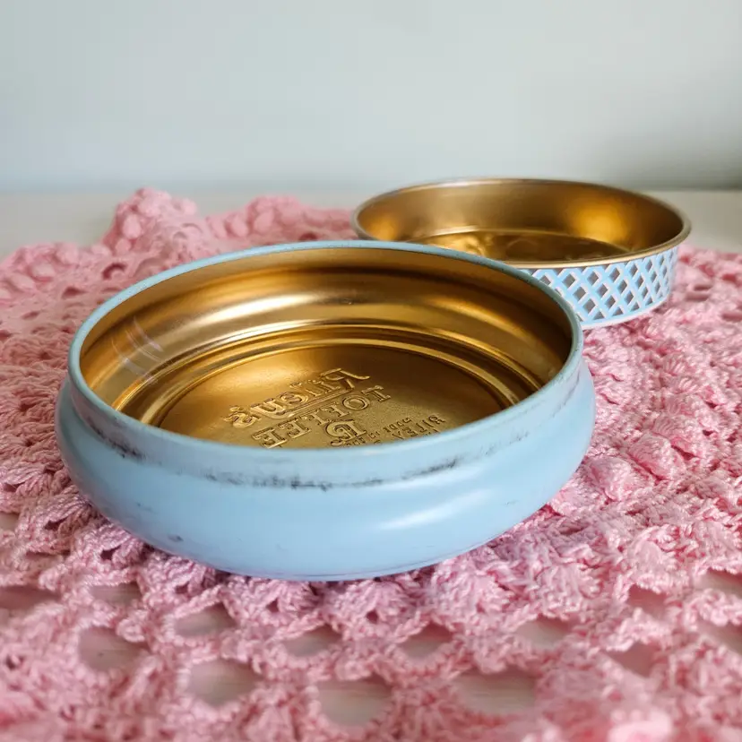 Beautiful robin egg blue Riley's Toffee Tin made Halifax, England. Has some paint loss and scratches if you look up close but not noticeable from far. And some wear along the rims of the bottom.
