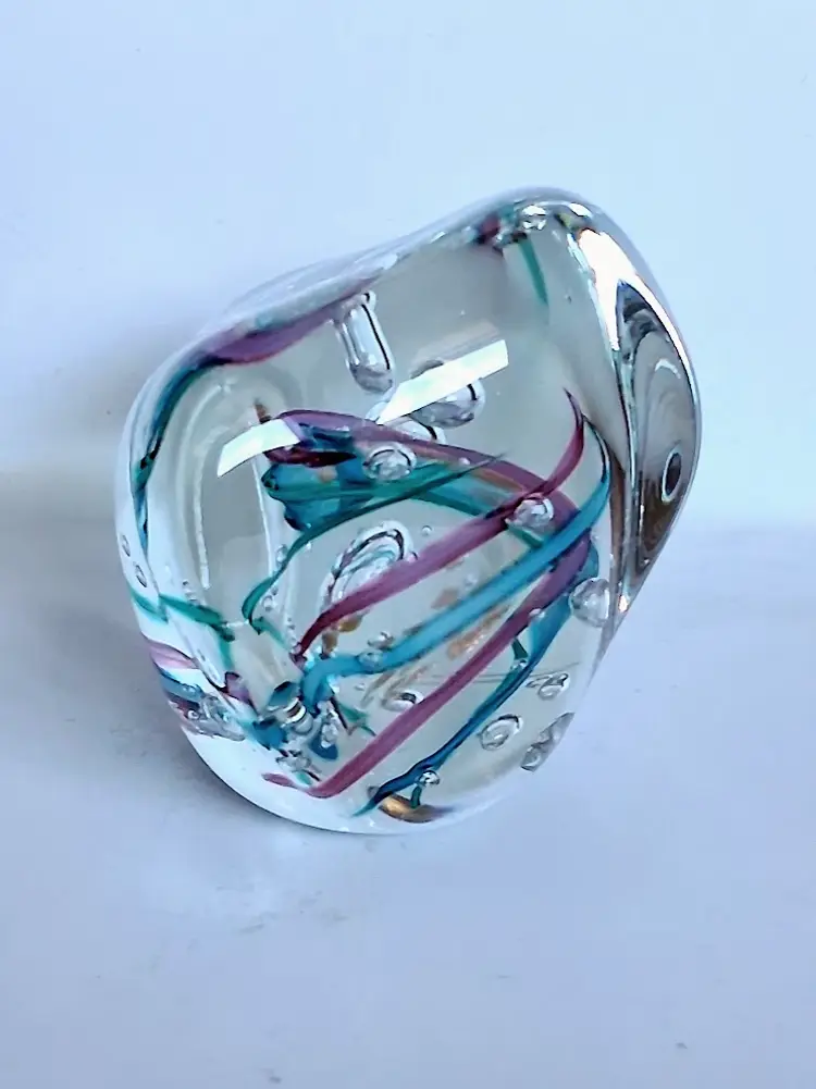 GORGEOUS!!! Vintage, SIgned Robert L. Hamon Irregular Shaped Handblown Glass Paperweight, Multi-Colored Swirls and Controlled Bubbles. Measures approx.: 2.75" at highest and 2.9" at widest areas. GREAT COND!!