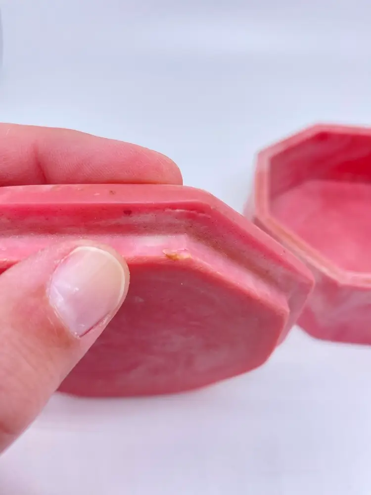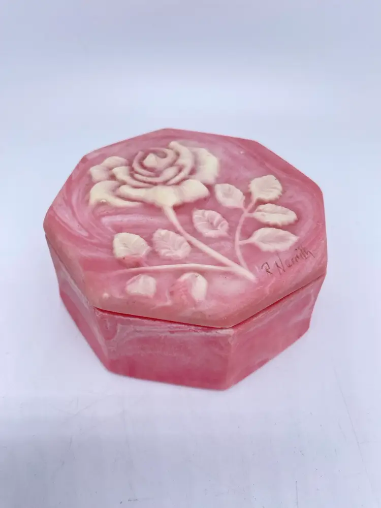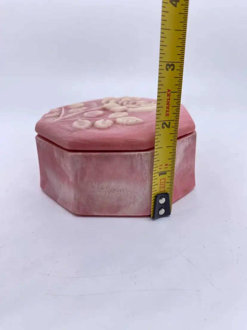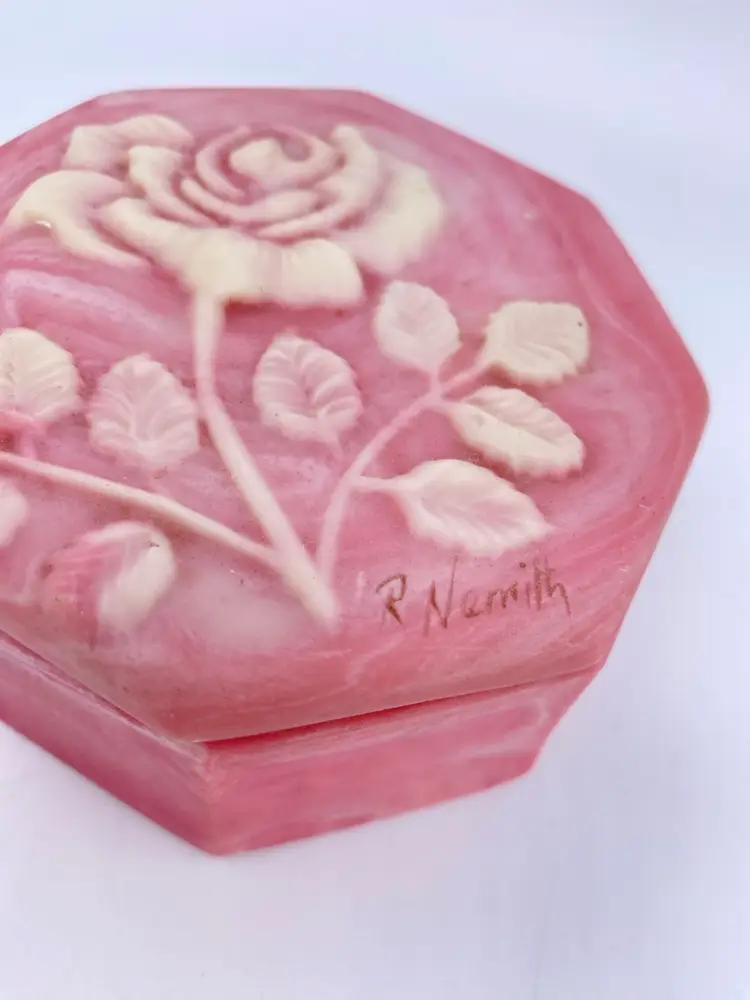Vintage soapstone pink rose trinket box by Robert Nemith. Signed on lid. Has a couple of dings