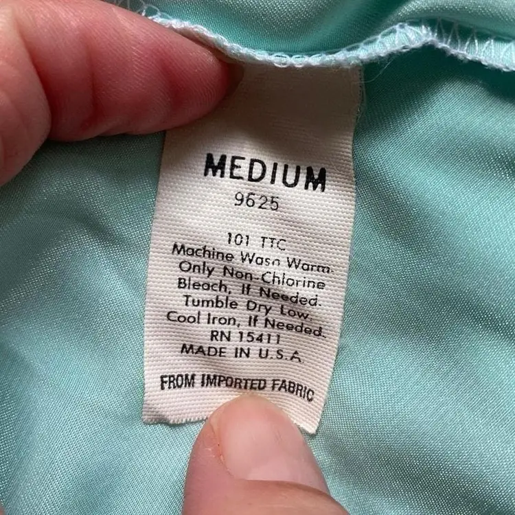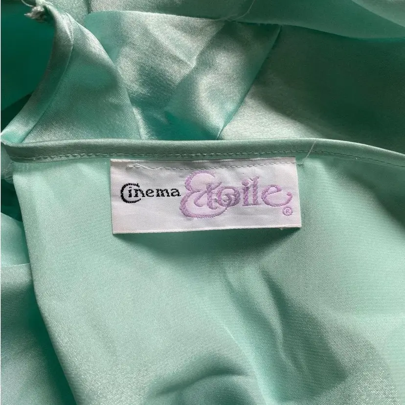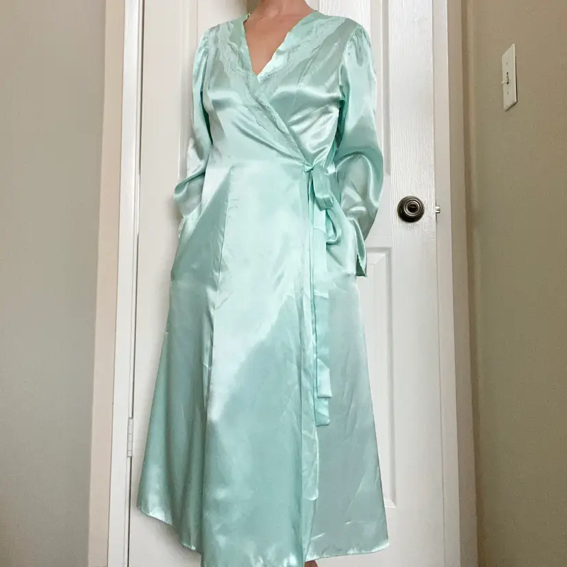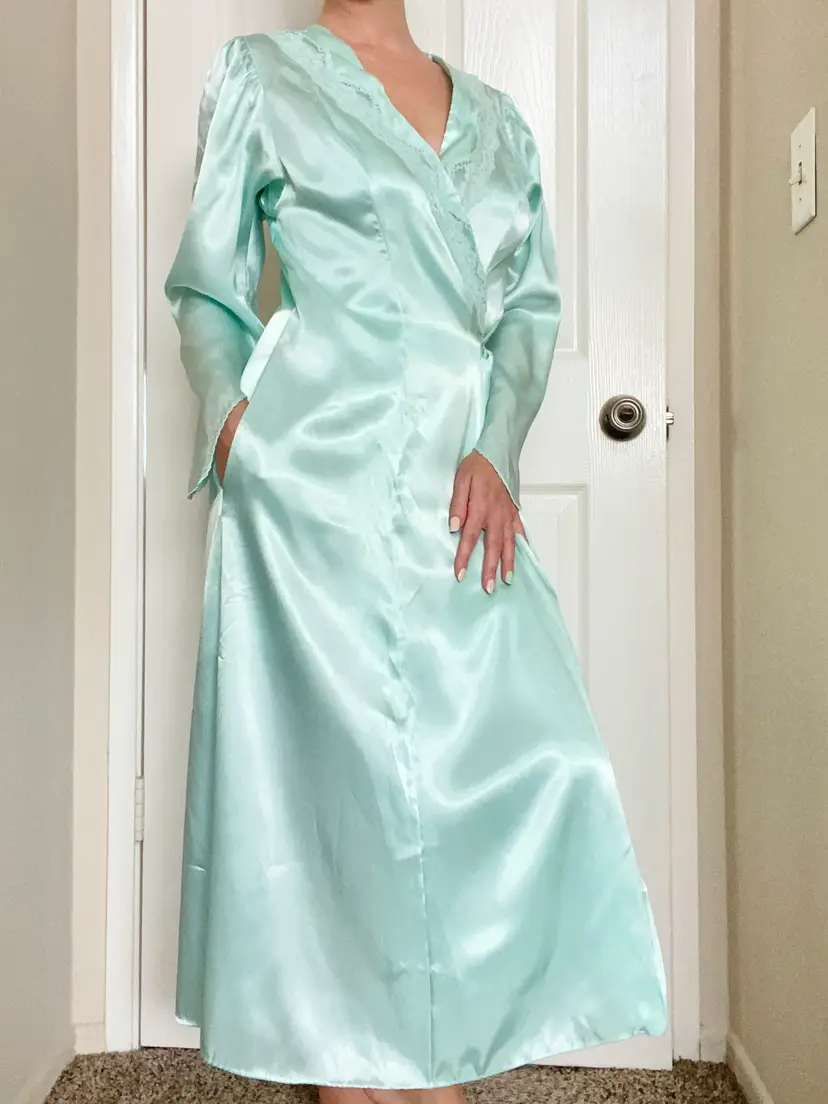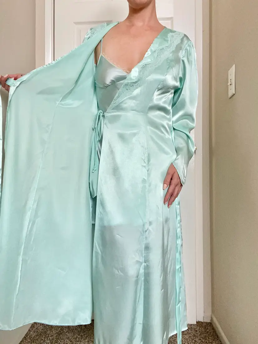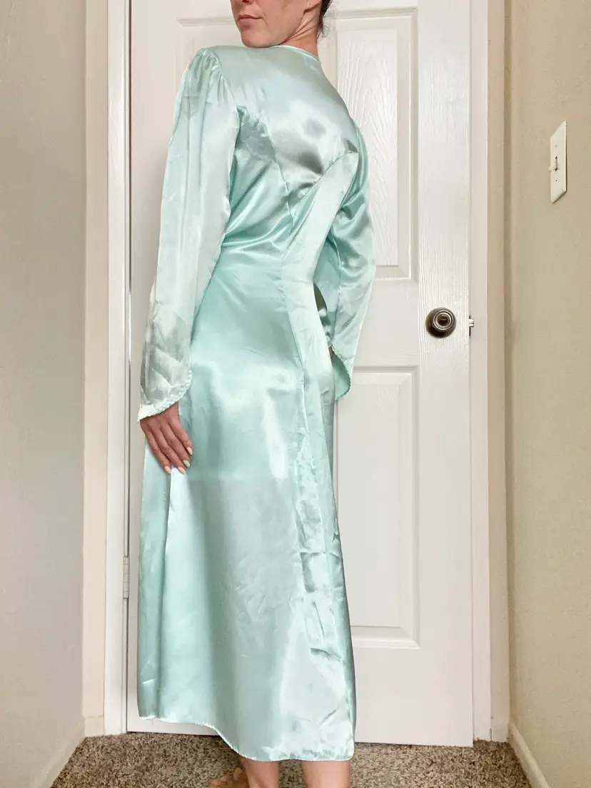 Vintage Cinema Etoile label robin’s egg blue satin robe with tailored bodice and lace chest detail. The sleeve cuffs come to a point. Thin and silk-like. Excellent condition. Tagged size M, True to size. Bust up to 38” Length 48”