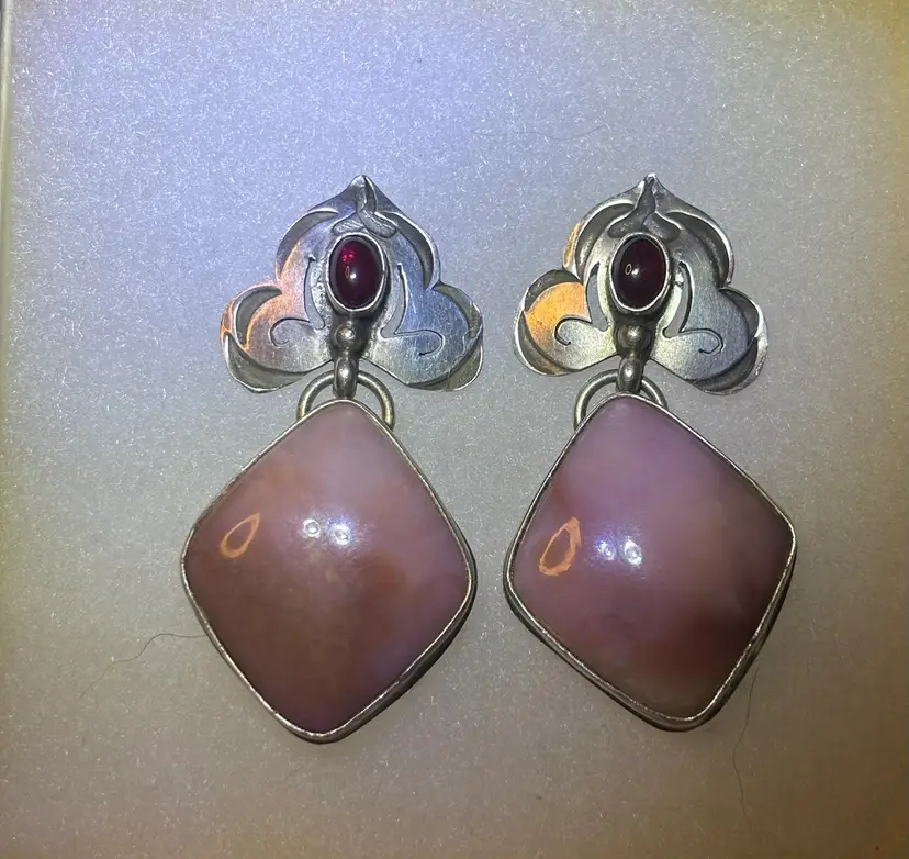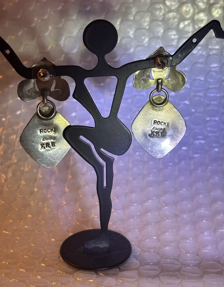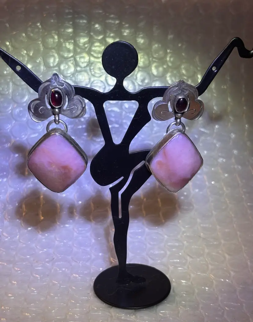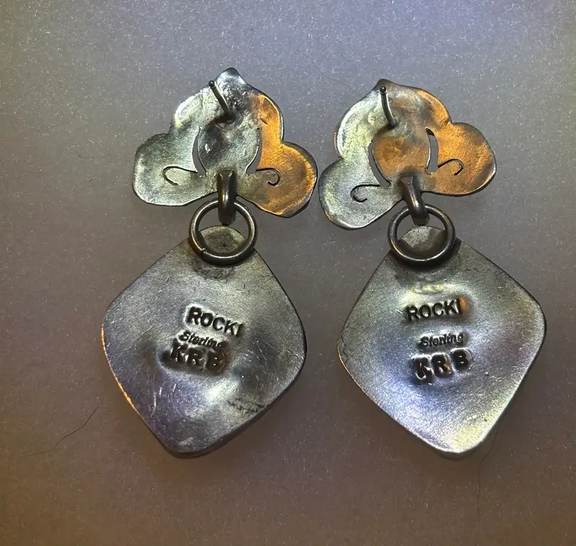 These Rocki earrings are so pretty! Very feminine with the soft pink Rhodochrosite and deep red Garnets. All stones have been tested on my Presidium Gem Tester. I’ve also tested the silver. The earrings are signed on the backs, Rocki Gorman. If you don’t know the artist, look her up. She’s fabulous! Beautiful southwestern design! They measure 2 1/4 inch long, and 1 inch wide.