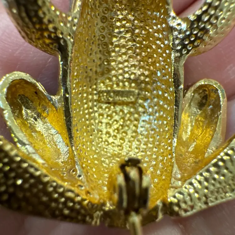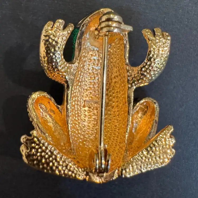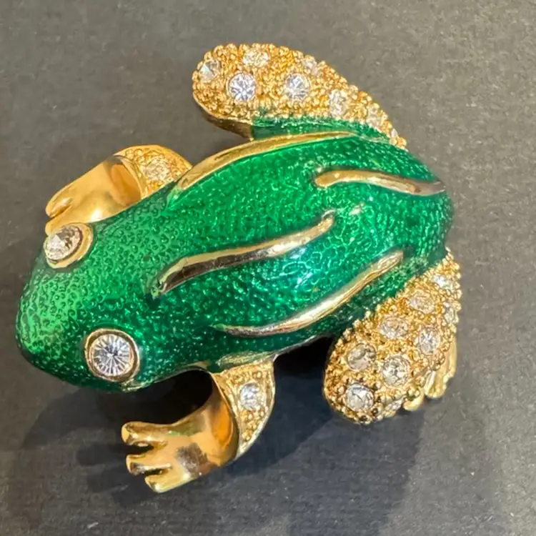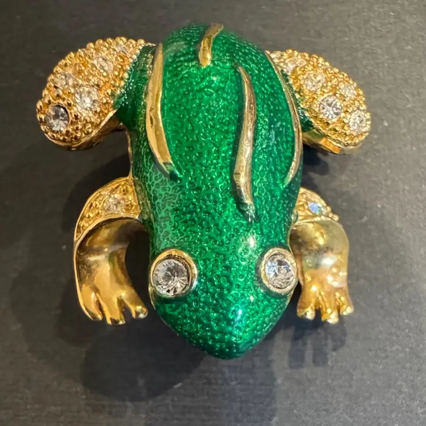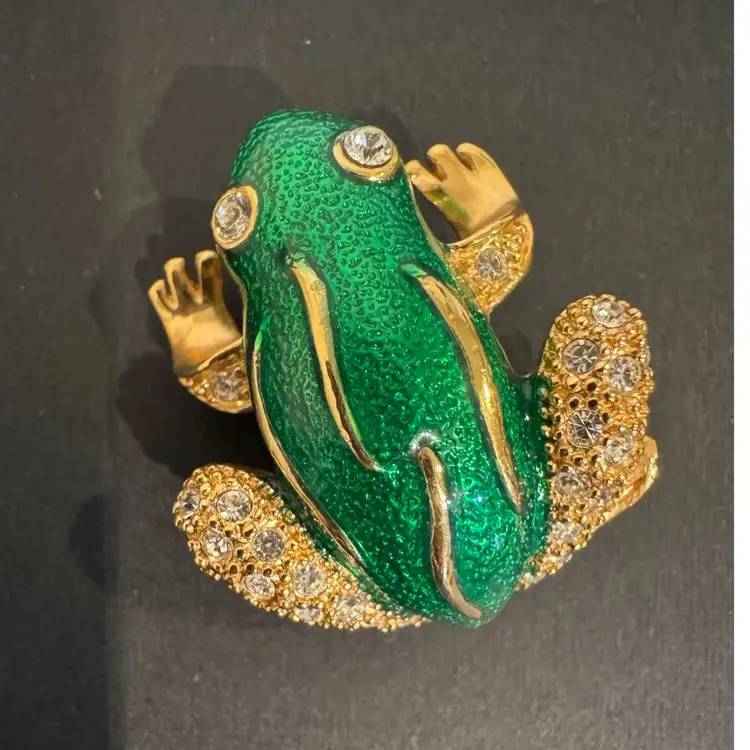 Adorable vintage Roman frog brooch. Green enamel with gold tone and rhinestones. No missing stones. Measures about an inch long.