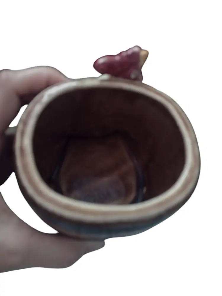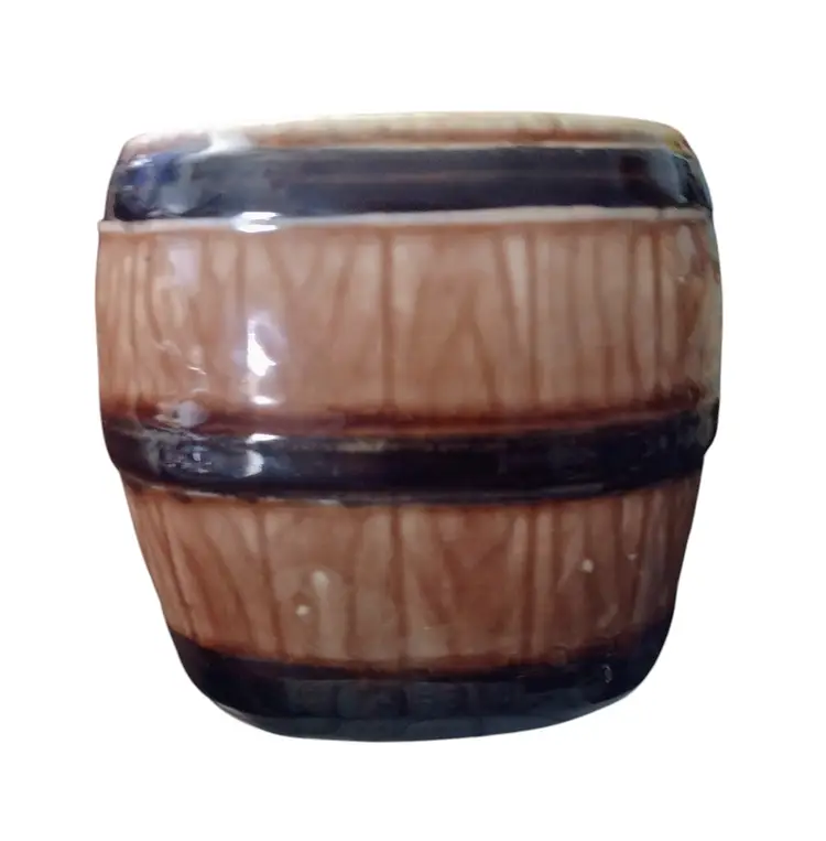 This is a very cute vintage pottery planter that is fairly thick with a colorful barnyard chicken/rooster standing in front of a barrel. Planter measures 4.25" tall x 4.25" long x 4" wide.