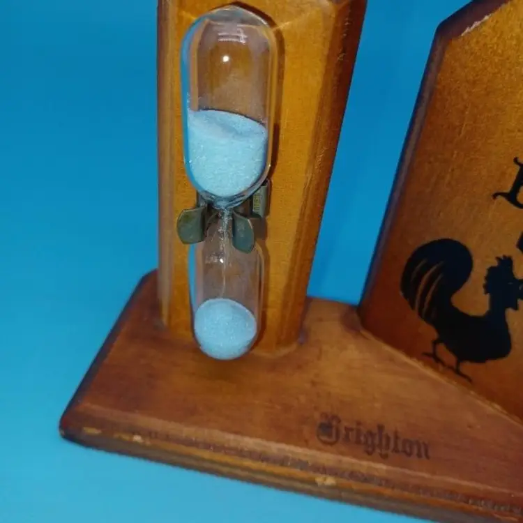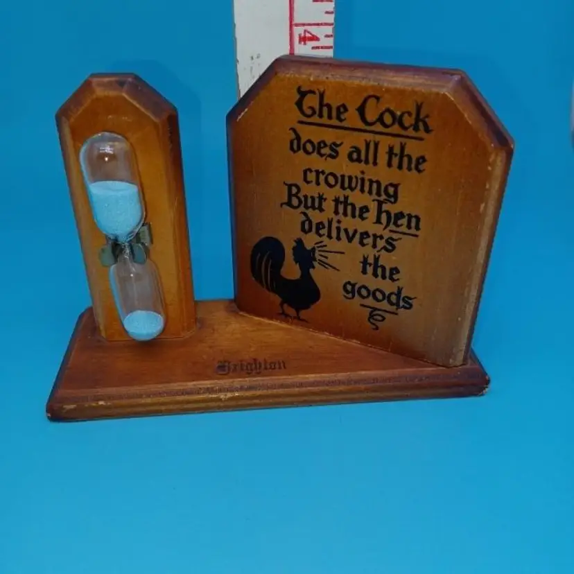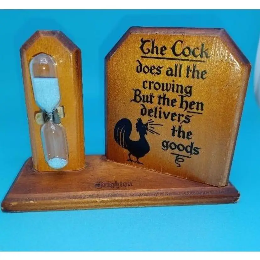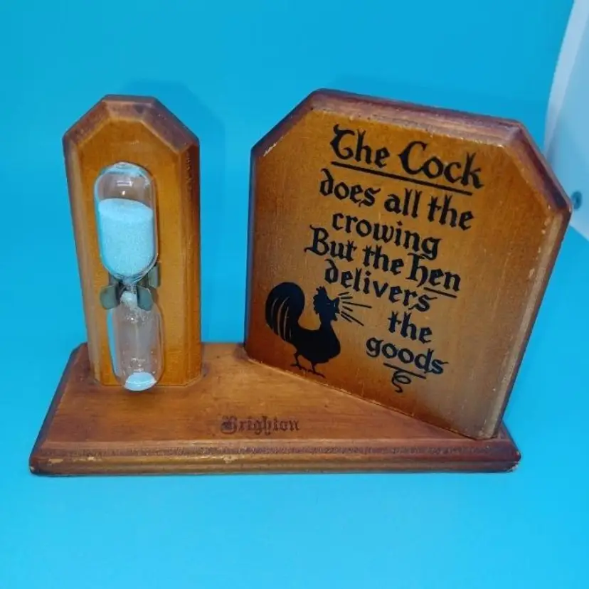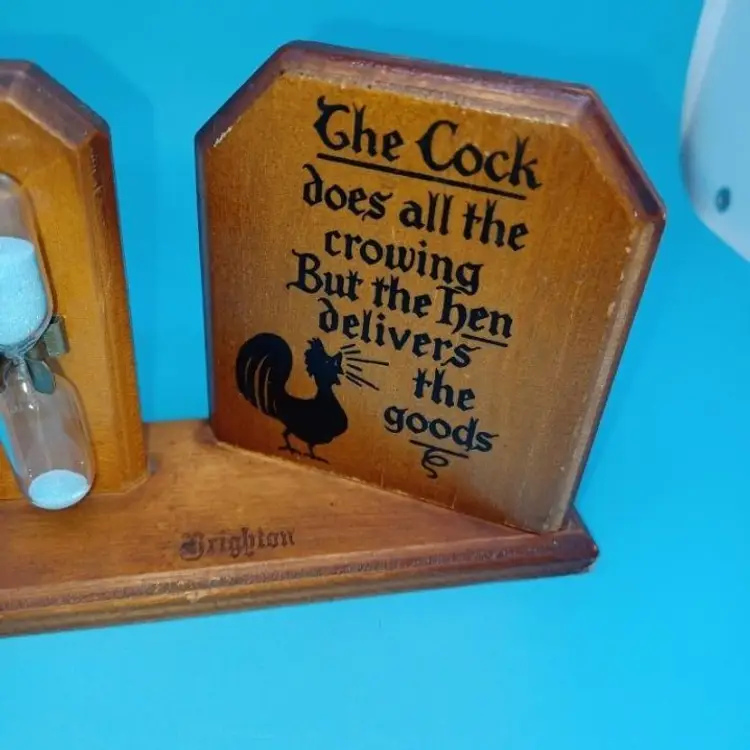 Vintage rooster wooden egg timer this 1950s egg timer says "the c*ck does all the crowing but the hen delivers all the goods" In good vintage condition does have patina from sitting in someone's kitchen for decades I did not have any more Murphy's Oil Soap or orange oil but it should be able to be cleaned up a little better the Blue Sand egg timer is approximately 3 mins Please see all pictures as they're the best description all items from a smoke-free home with pets experienced fragile shipper Please take a look at my other items for sale