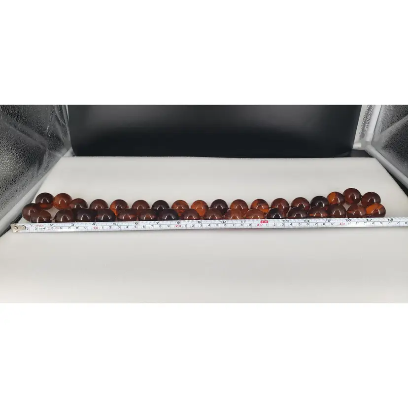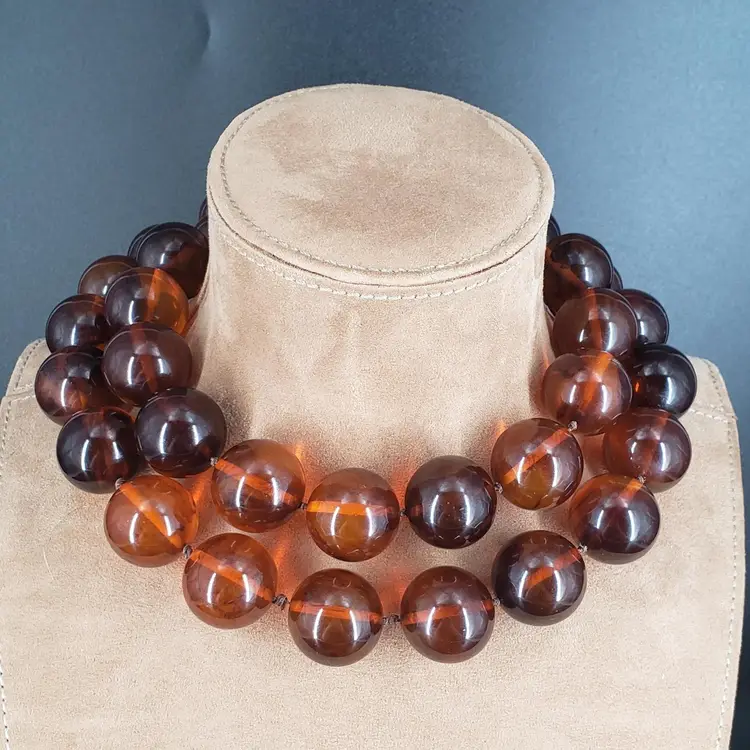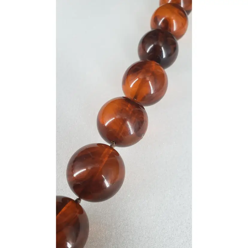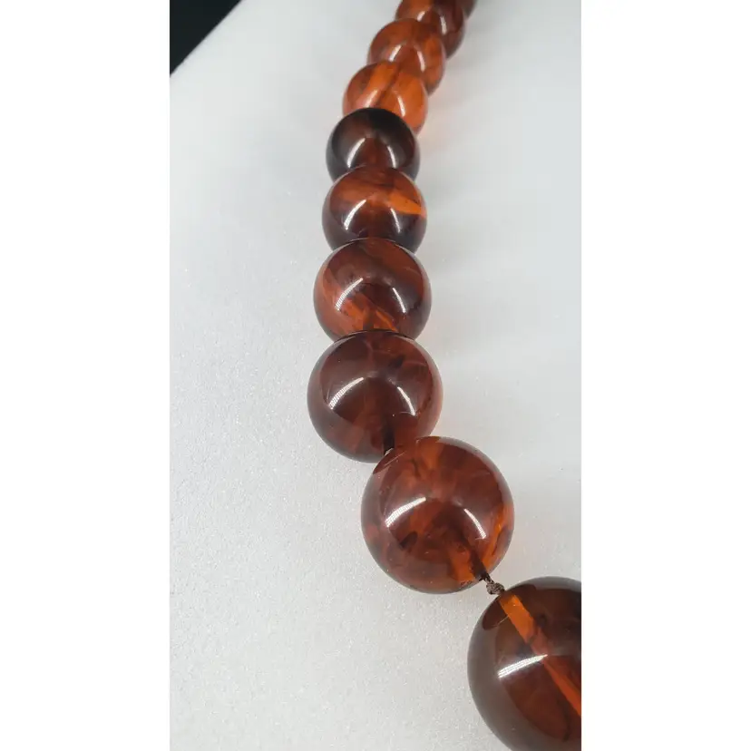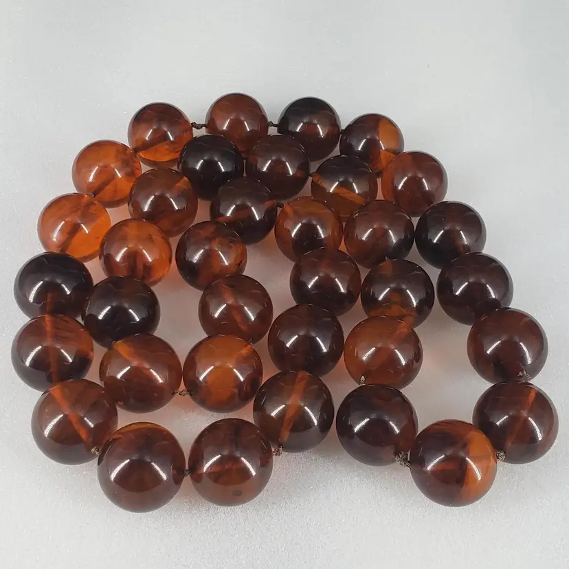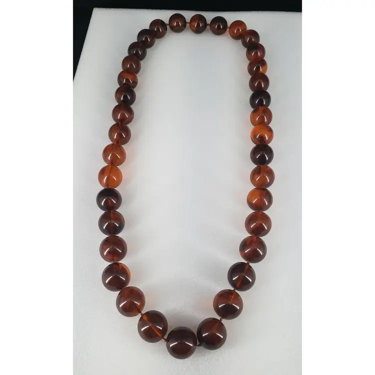 This vintage necklace boasts a beautiful root beer color and is made of Bakelite material. The necklace features round beads with a diameter of 1 inch and a total length of 36 inches. The closure is absent, making it easy to slip on and off, and the chain type is ball/bead. This necklace is a perfect addition to any Bakelite collection and can be worn on any occasion.