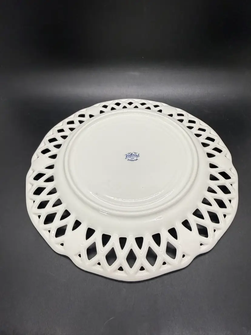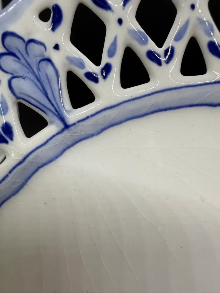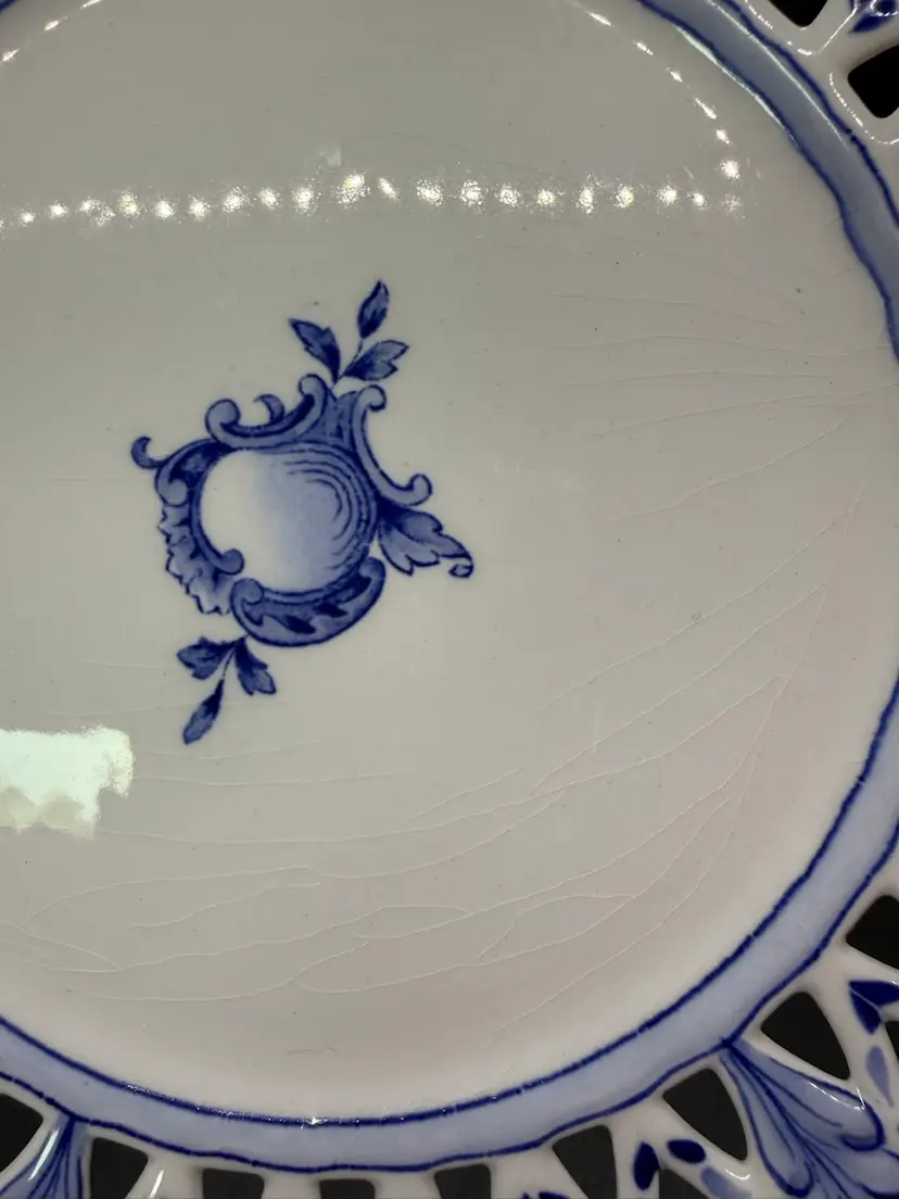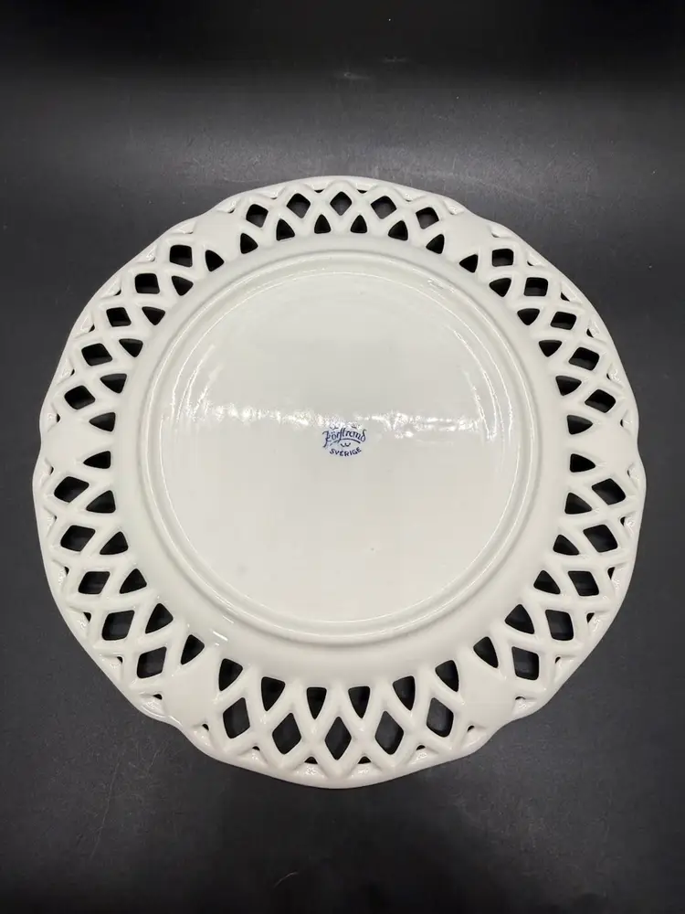 Vintage Rorstrand Sweden Reticulated Plate Blue and White Porcelain with Fruit Motif and Floral Design. The mark dates production of this plate from 1943-1950. It's a reproduction of a design from 1743-1760. No chips or cracks. Crazing to the glaze all over. One small dark spot/ smudge on front. Please see pictures.