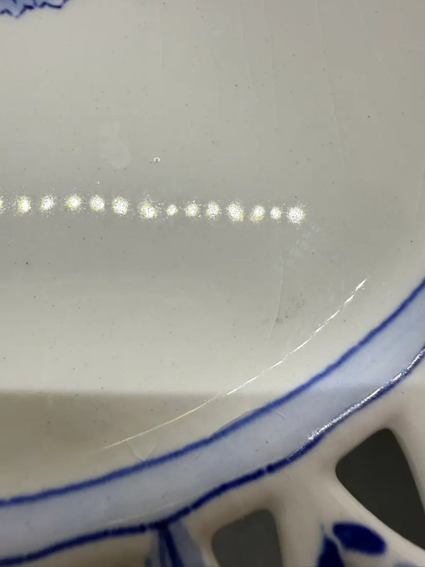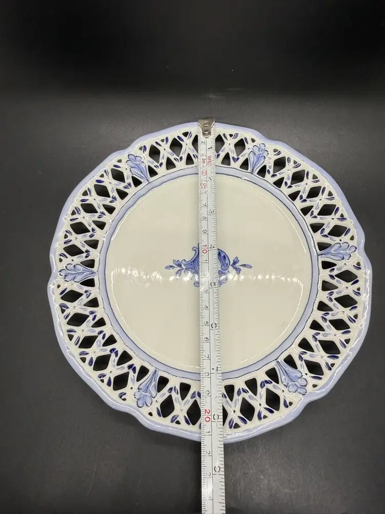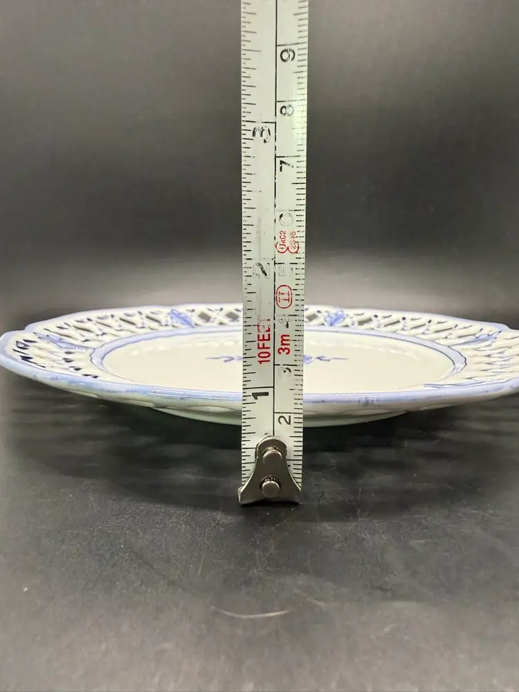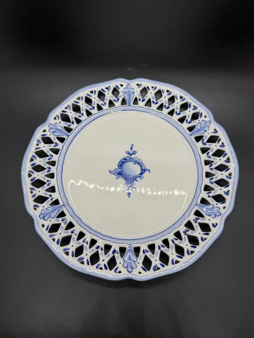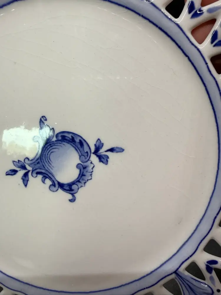 Vintage Rorstrand Sweden Reticulated Plate Blue and White Porcelain with Fruit Motif and Floral Design. The mark dates production of this plate from 1943-1950. It's a reproduction of a design from 1743-1760. No chips or cracks. Crazing to the glaze all over. One small dark spot/ smudge on front. Please see pictures.