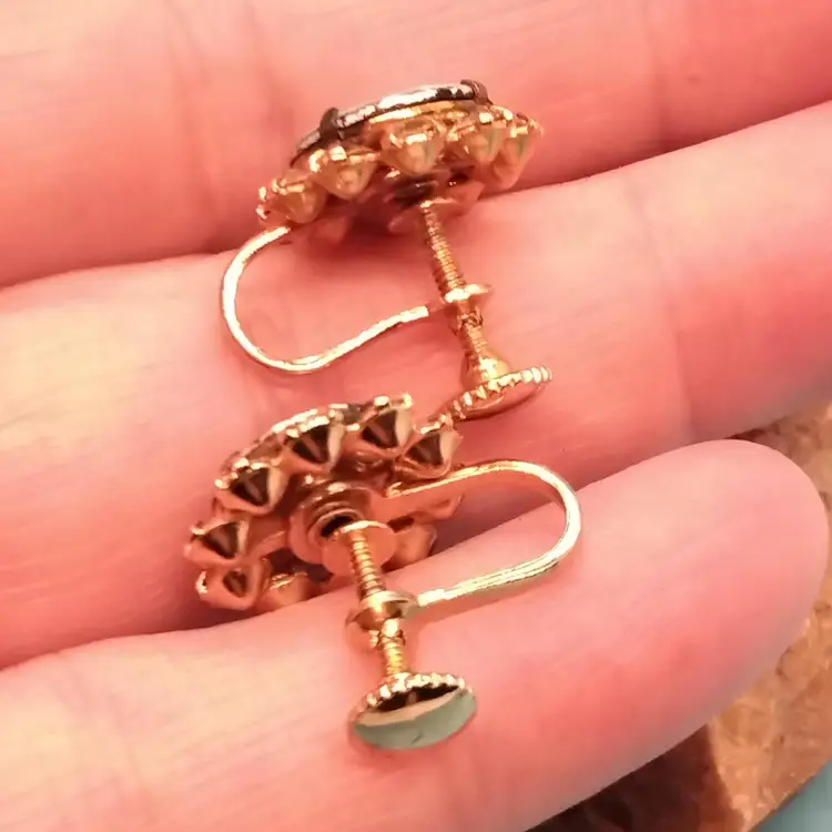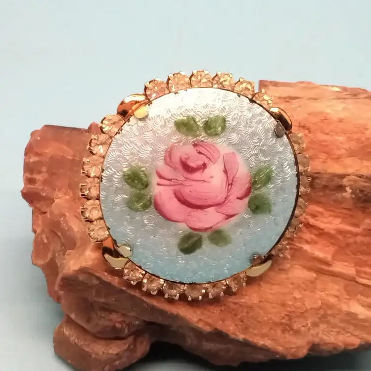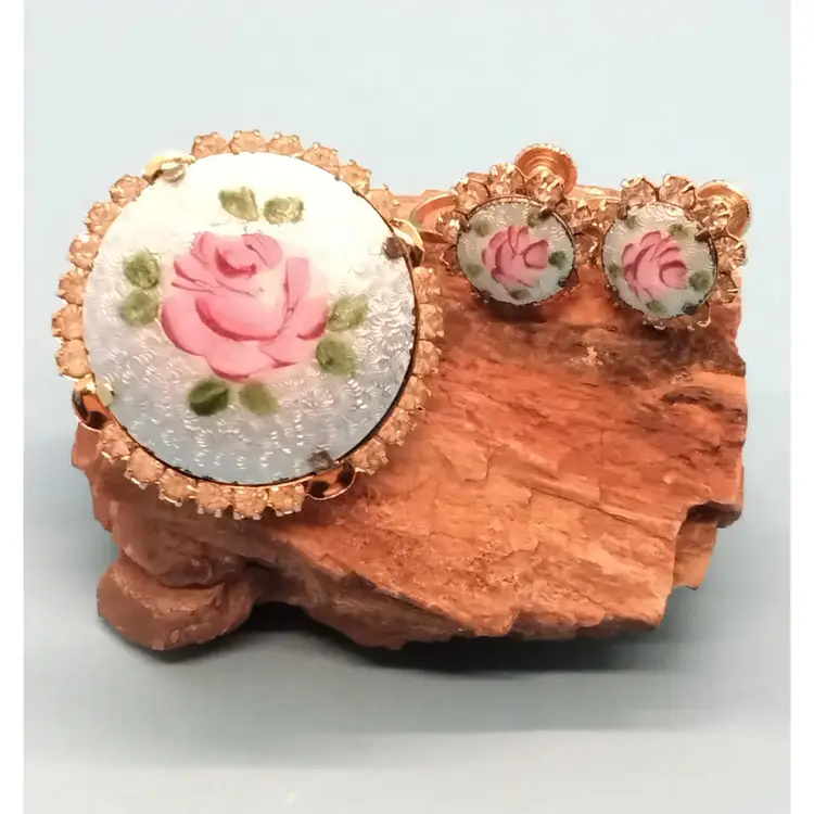 This charming vintage set includes a brooch and matching earrings, each featuring a delicate hand-painted rose design. The brooch and earrings are framed with citrine rhinestones, adding sparkle and a touch of elegance to any outfit. Perfect for collectors or as a thoughtful gift.