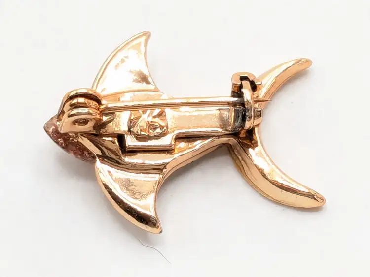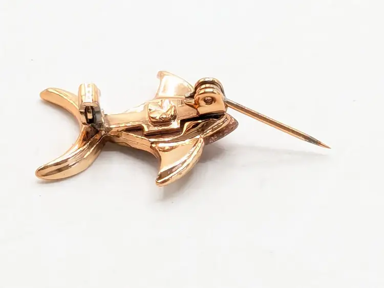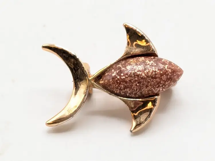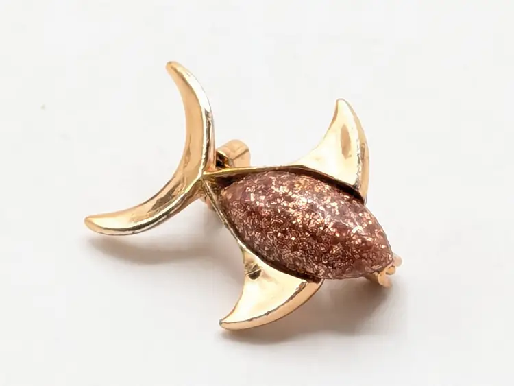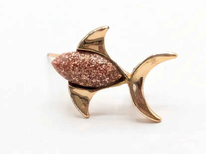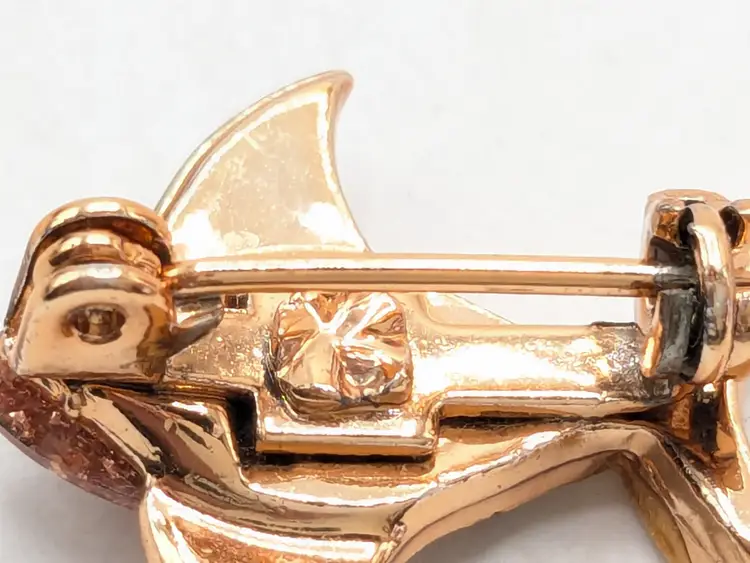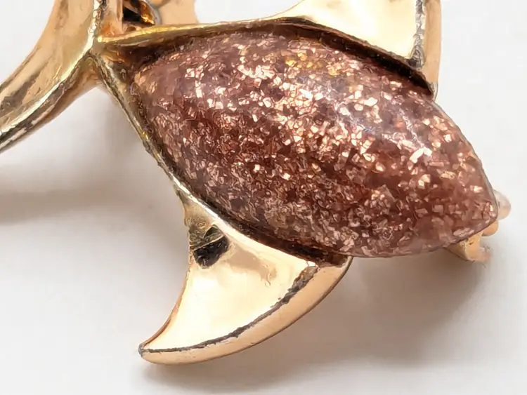 Good condition. Rose gold tone is bright and shiny with no color loss. Features a sparkling pinkish enamel glitter body. Measures 3/4" in height and 1" length. wen