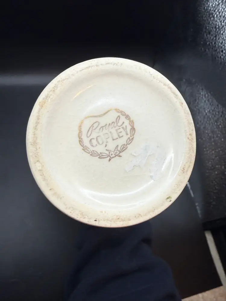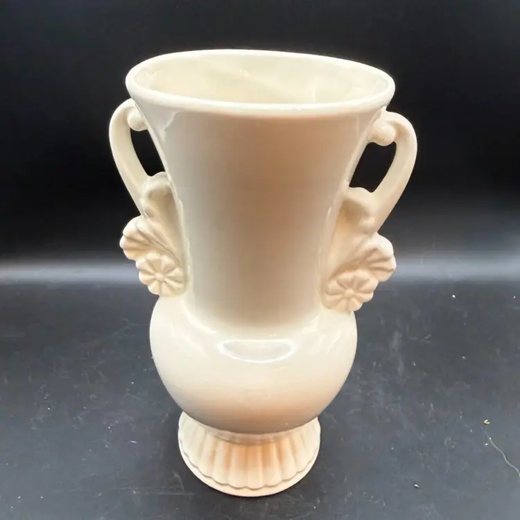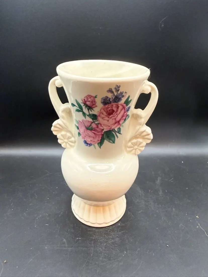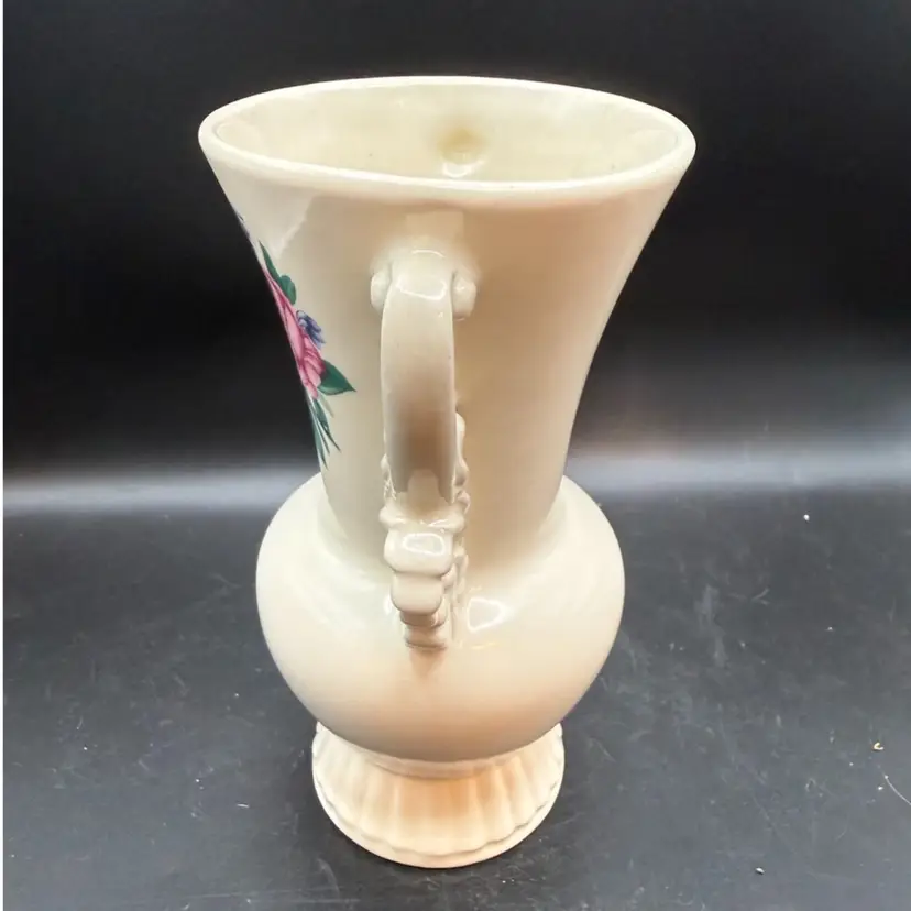 Royal Copley pottery was a line produced by the Cope, Pennsylvania, based Spaulding China Company, which operated from the 1940s to the 1960s. This particular vase, with its cream glaze and hand-painted rose motif, is characteristic of Royal Copley's output. The double handles and fluted base add to its decorative appeal, while the floral design was a common theme for the brand.