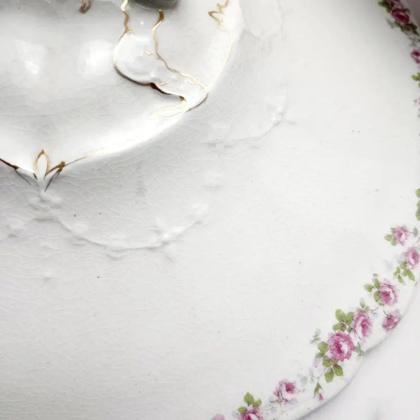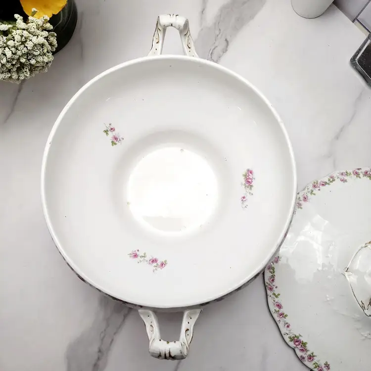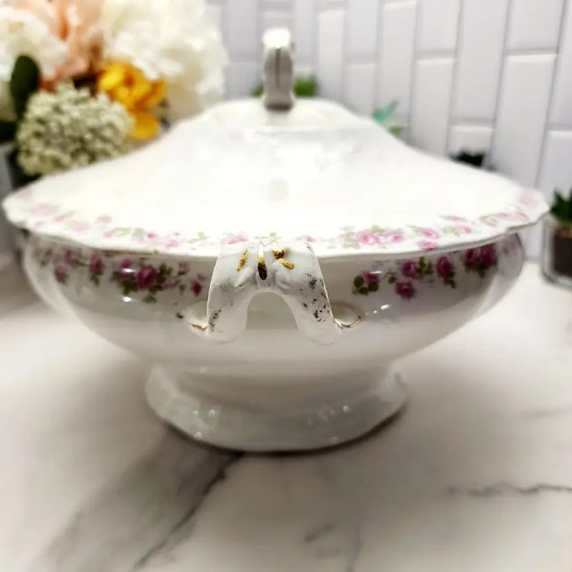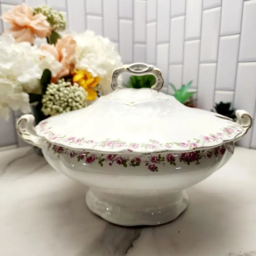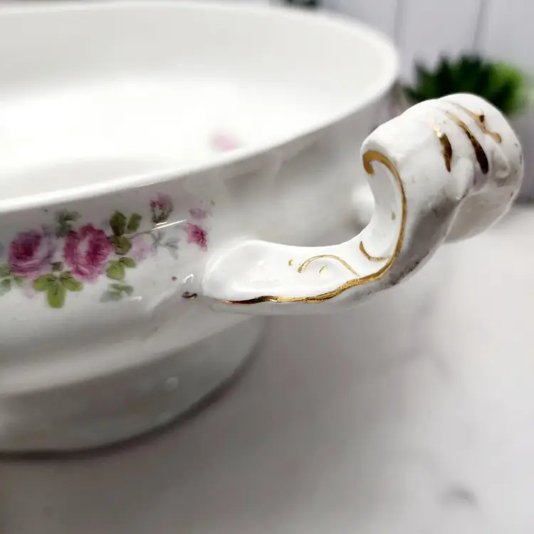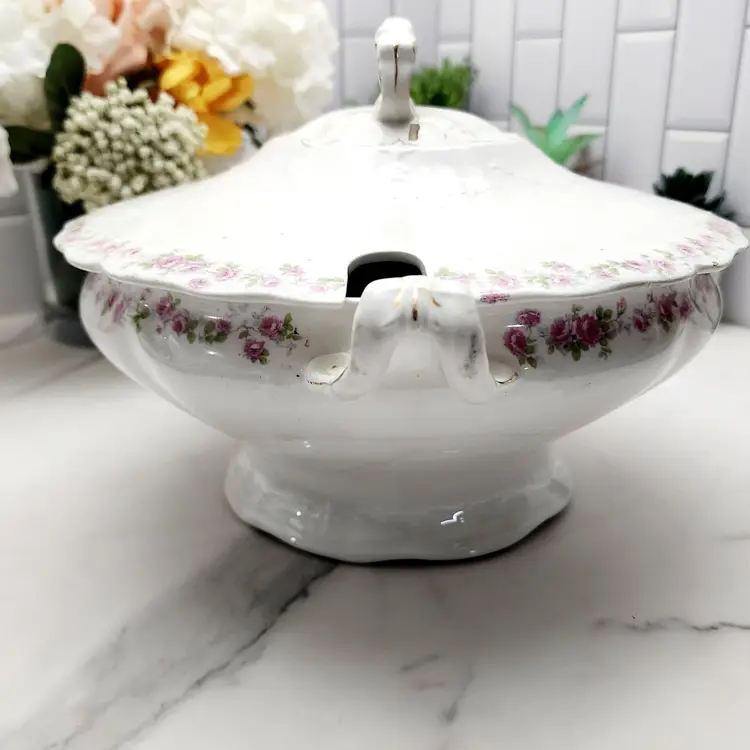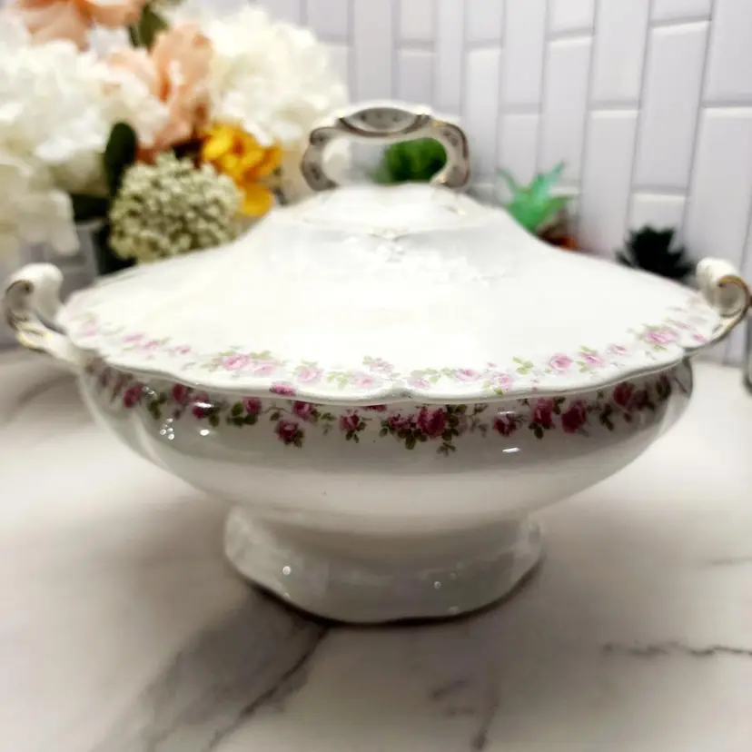 Vintage Soup Tureen with Lid. Decorated with Pink Roses with green leaves around the Rim And Center, Scalloped & Gold Trim. Pattern: MAD95 Made by: Maddock, John & Sons. England.