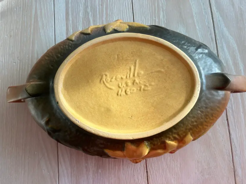 This vintage Roseville Art Pottery Clematis large oval console bowl is a beautiful addition to any home decor. Made of high-quality terracotta, the bowl features a timeless vintage design with a floral pattern that adds a touch of elegance to any room. The oval shape and art pottery production style make it a unique and eye-catching piece that is sure to be a conversation starter in any space. Perfect for displaying fruits, nuts, or potpourri, this console bowl is both functional and stylish.
