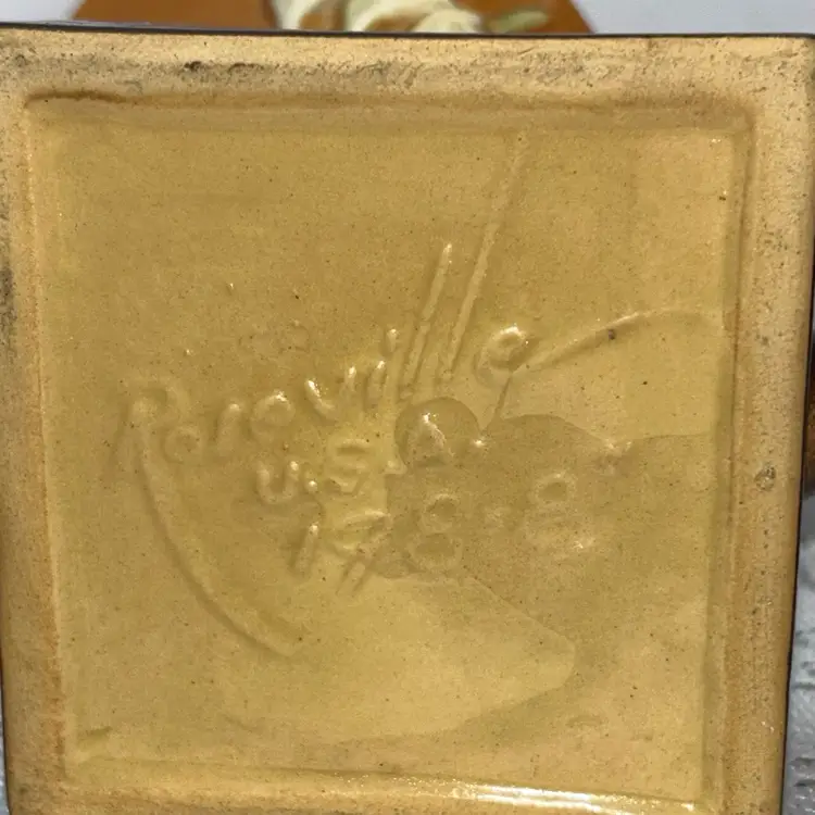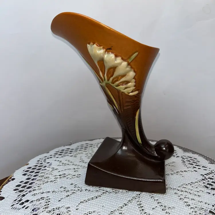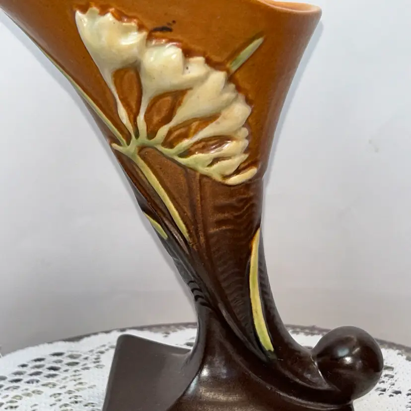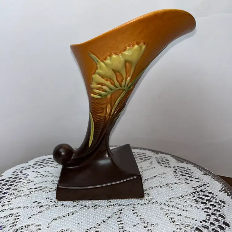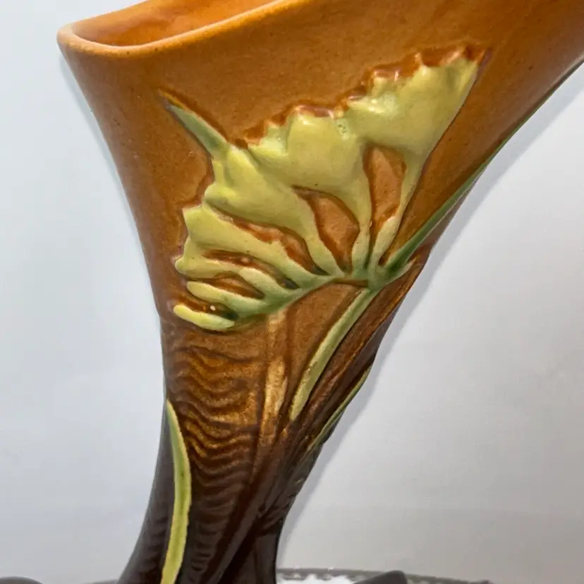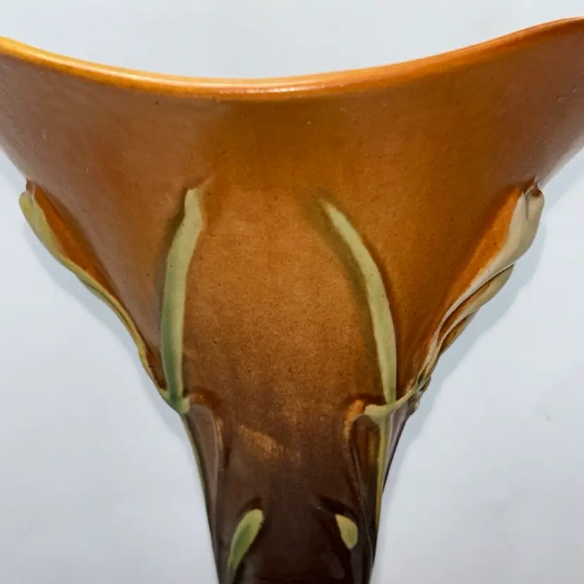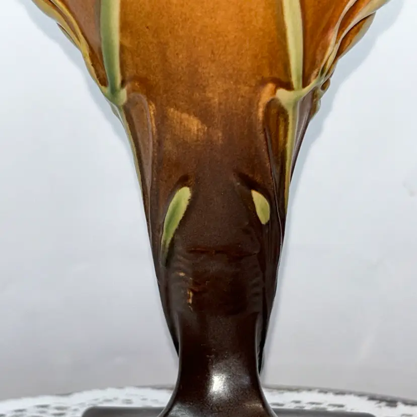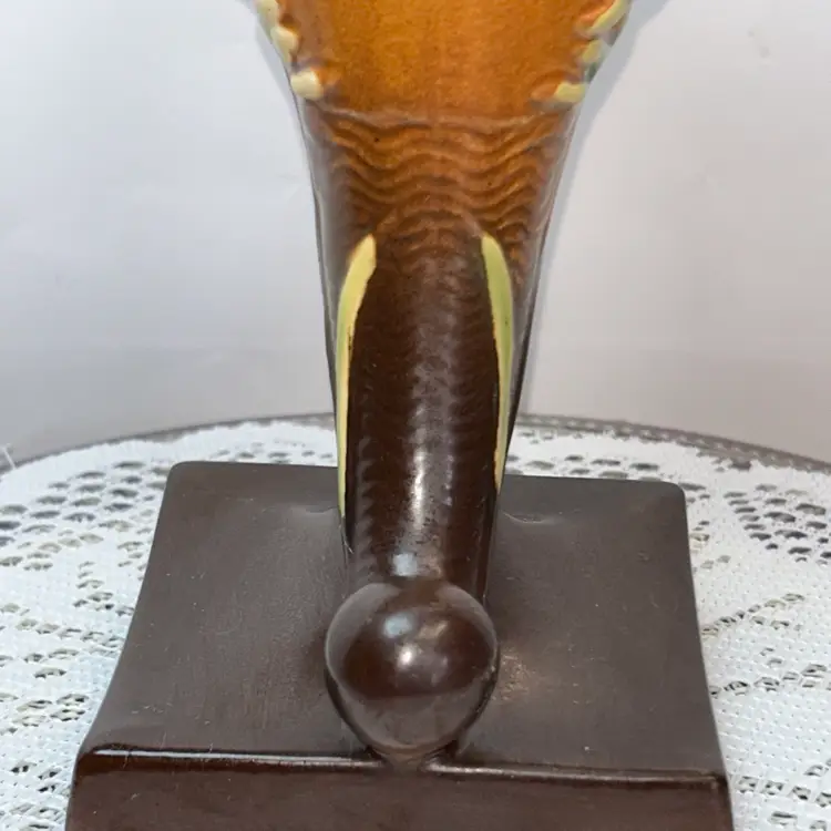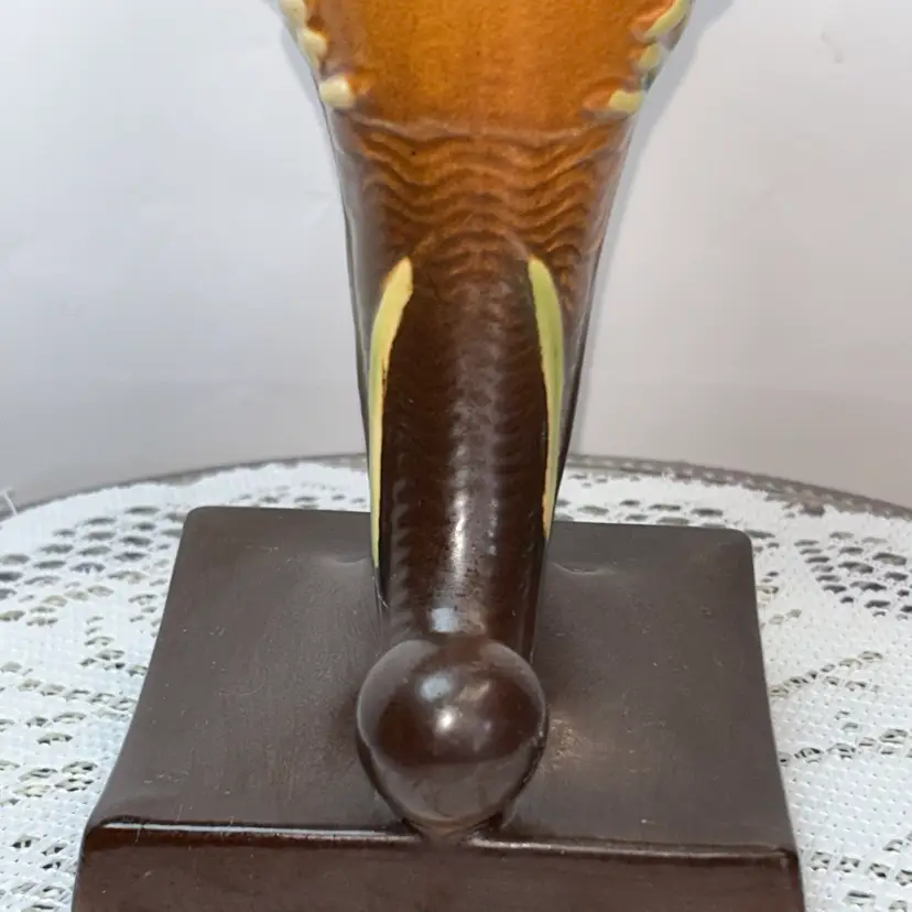 This is the 1946 version in Tangerine and Autumn Brown. It is 8” tall, 5 wide across the top, base is 4” wide. Excellent condition. No issues at all. Two available.