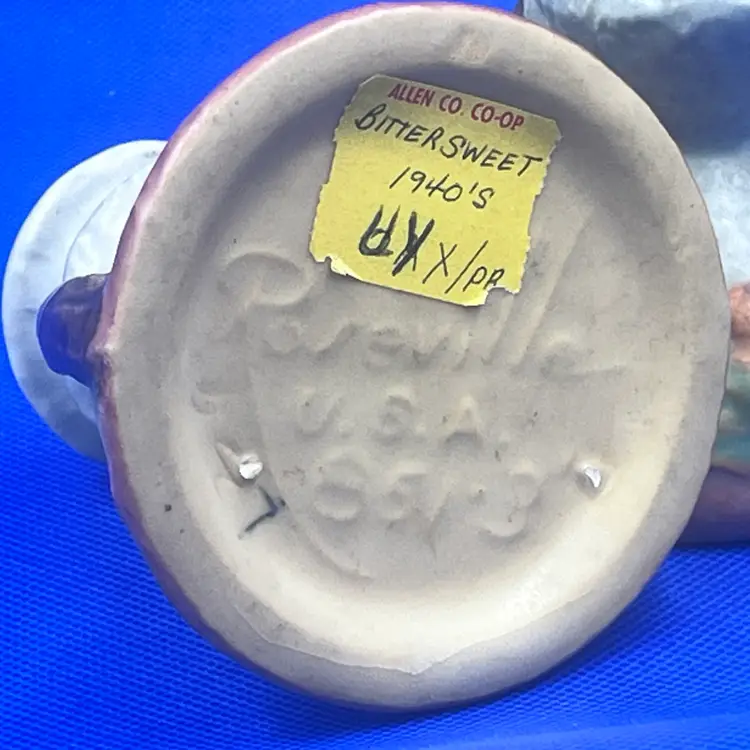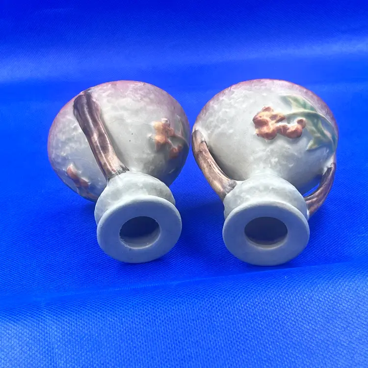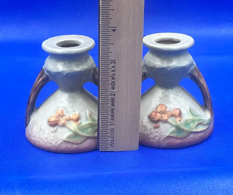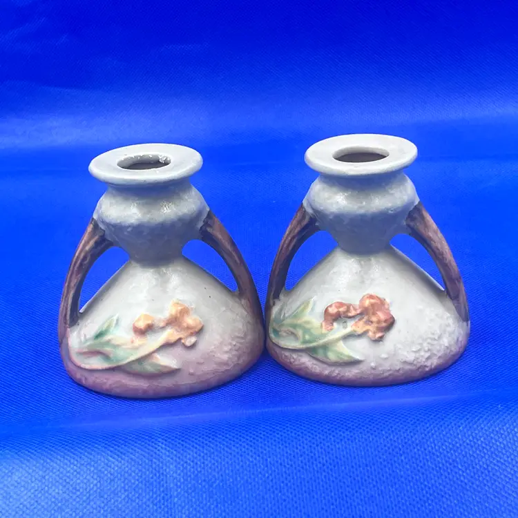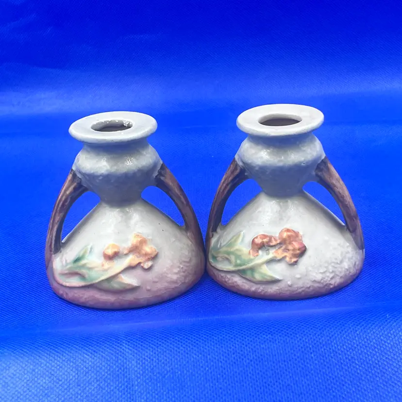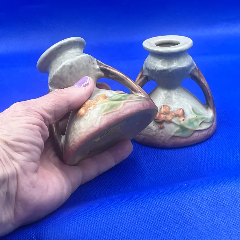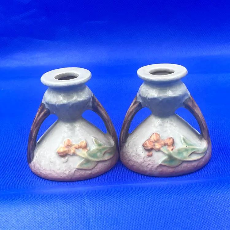 Here is a very nice pair of vintage Roseville Pottery candle holders in the Bittersweet pattern, shape #851-3. Features raised orange berries and leaves with a soft matter glaze. A lovely addition to any art pottery collection. Marked Roseville USA odn the base. Very good vintage condition. No chips or cracks