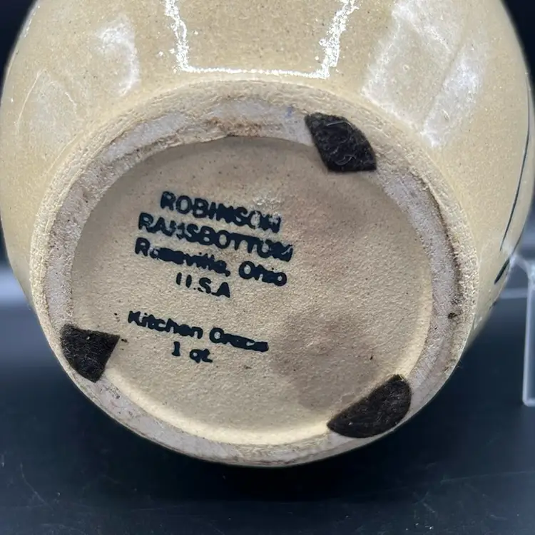 This item is a vintage Robinson Rands bottom pottery 1 quart crock. It has a blue sponge wear with a wheat design. Is manufactured in Roseville, Ohio USA. It stands 5 1/2 inches tall and just over 5 inches across there are no chips or cracks.