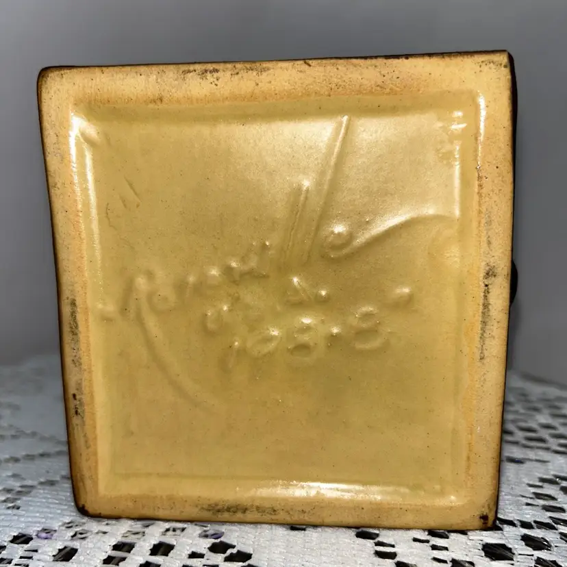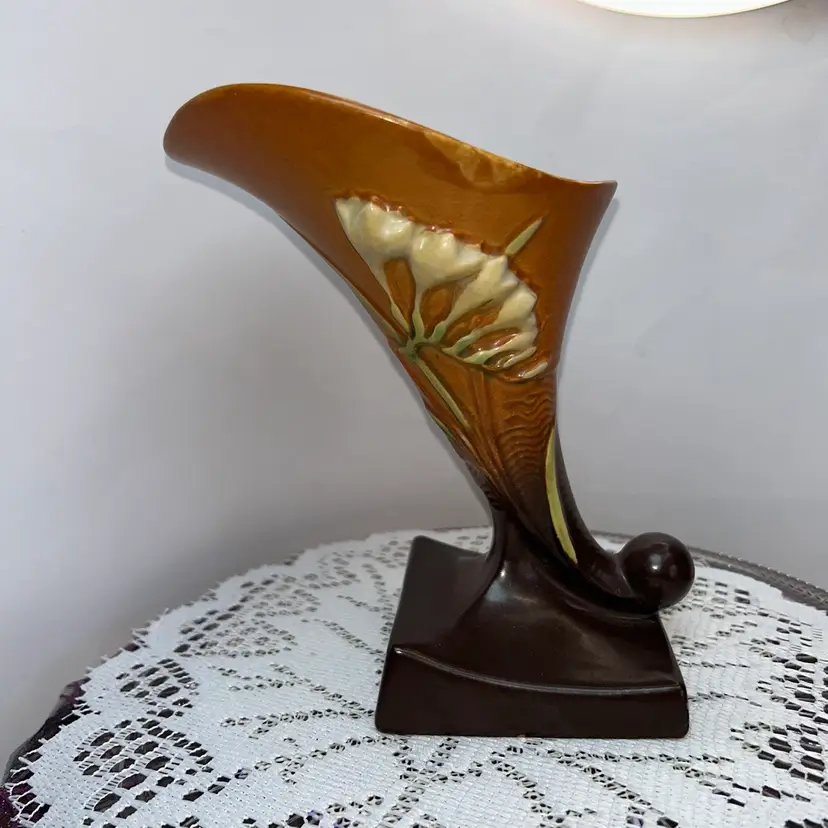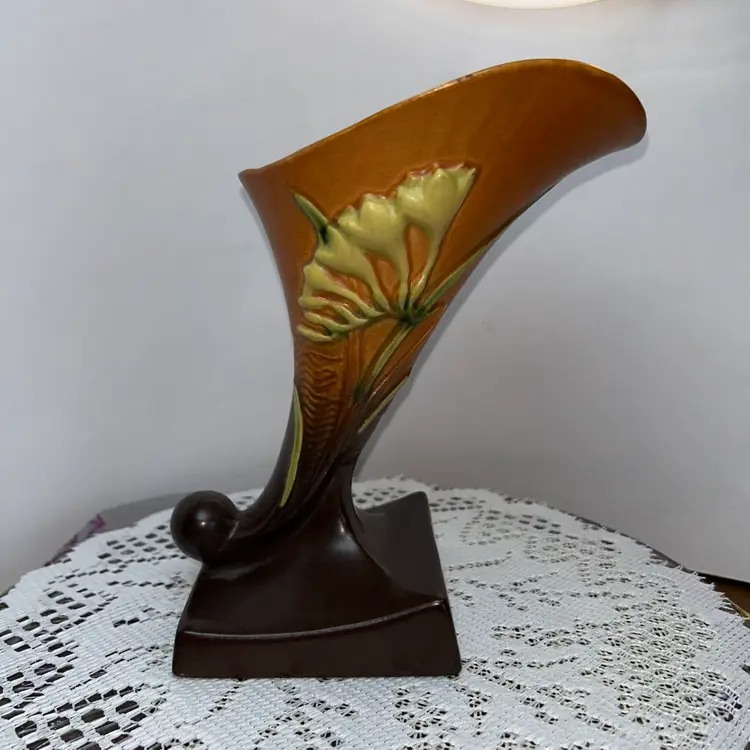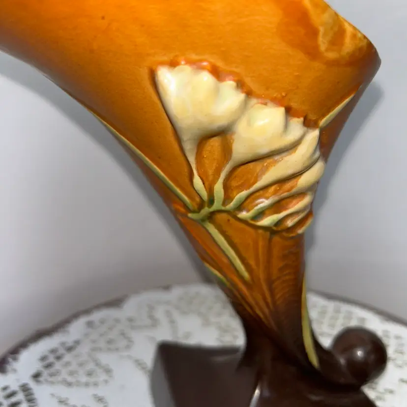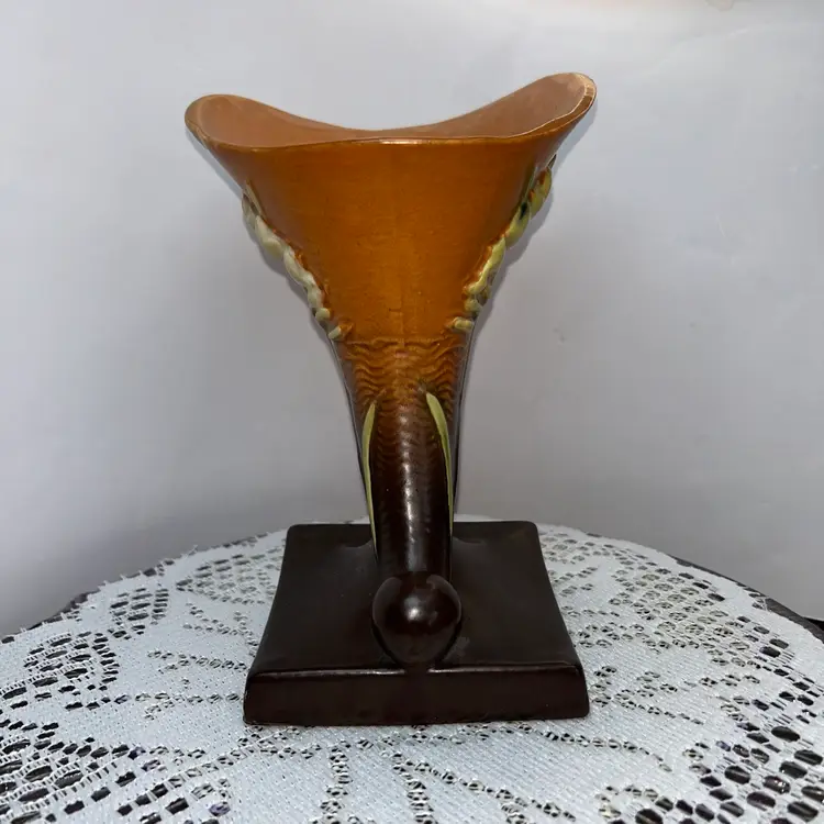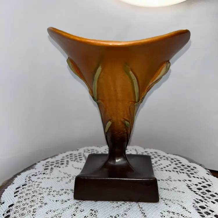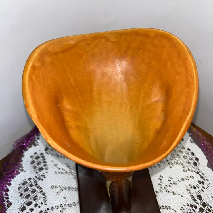 This is the 1946 version in Tangerine and Autumn Brown. It is 8” tall, 5 wide across the top, base is 4” wide. Excellent condition. No issues at all. Two available.