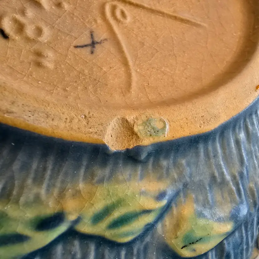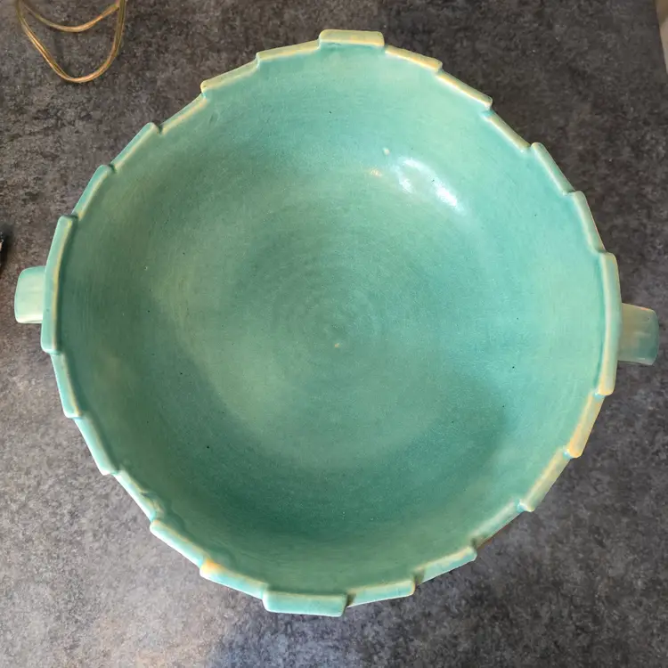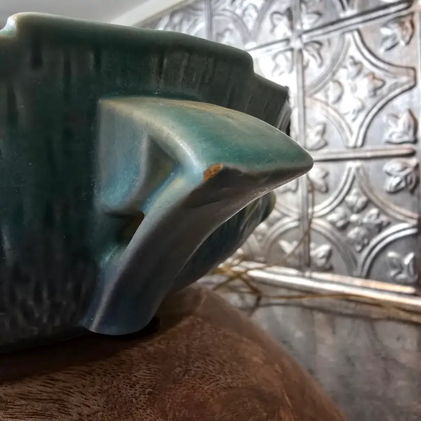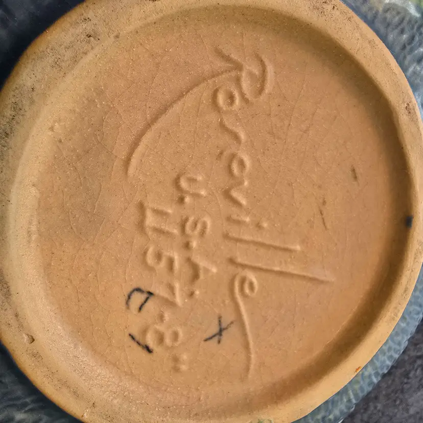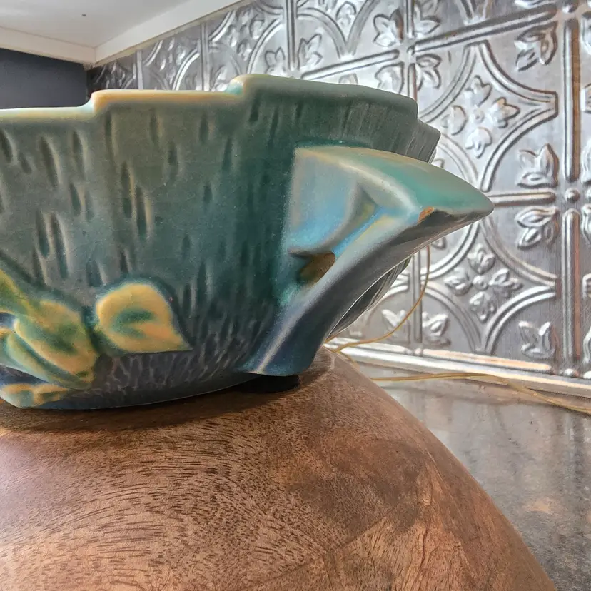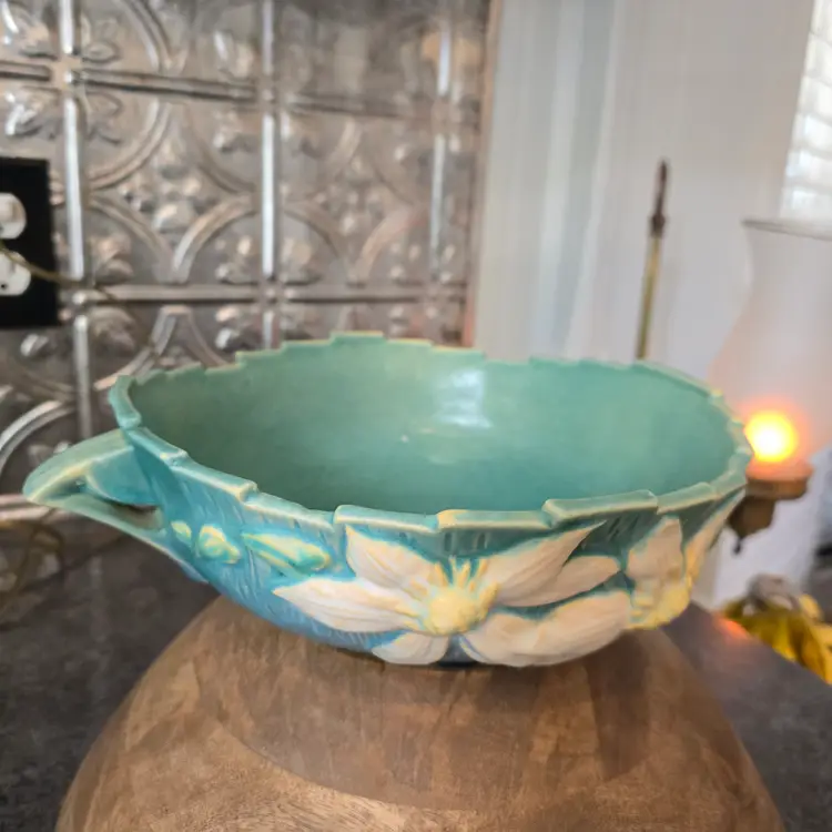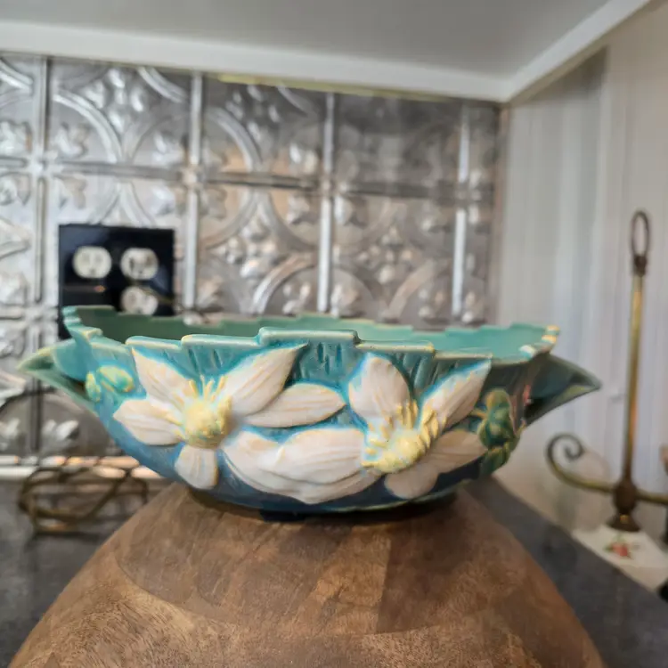 Listed here is a vintage Roseville console bowl featured in the Clematis flower pattern made in the 1940s. Pink clematis flowers adorn the exterior while a blue green background appears in a wooden like texture.