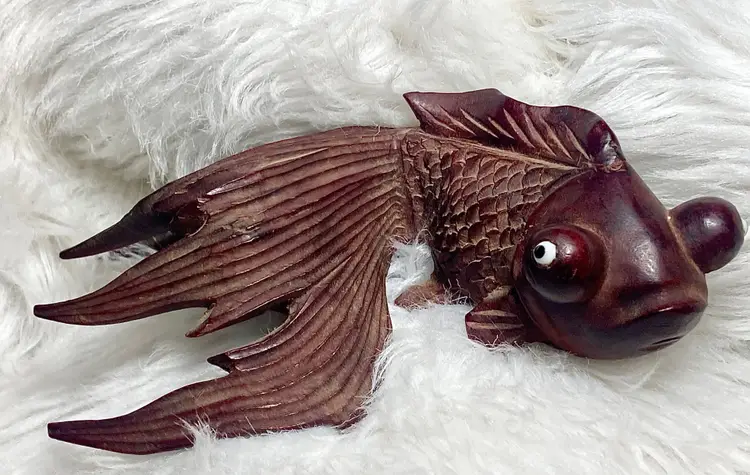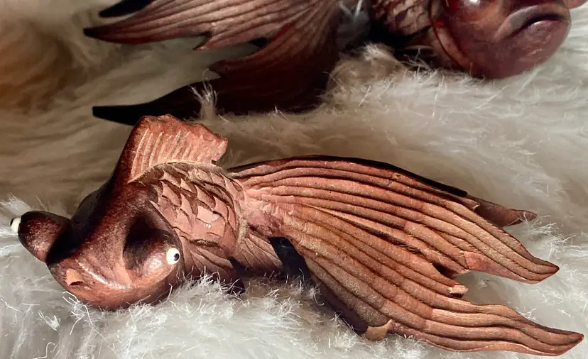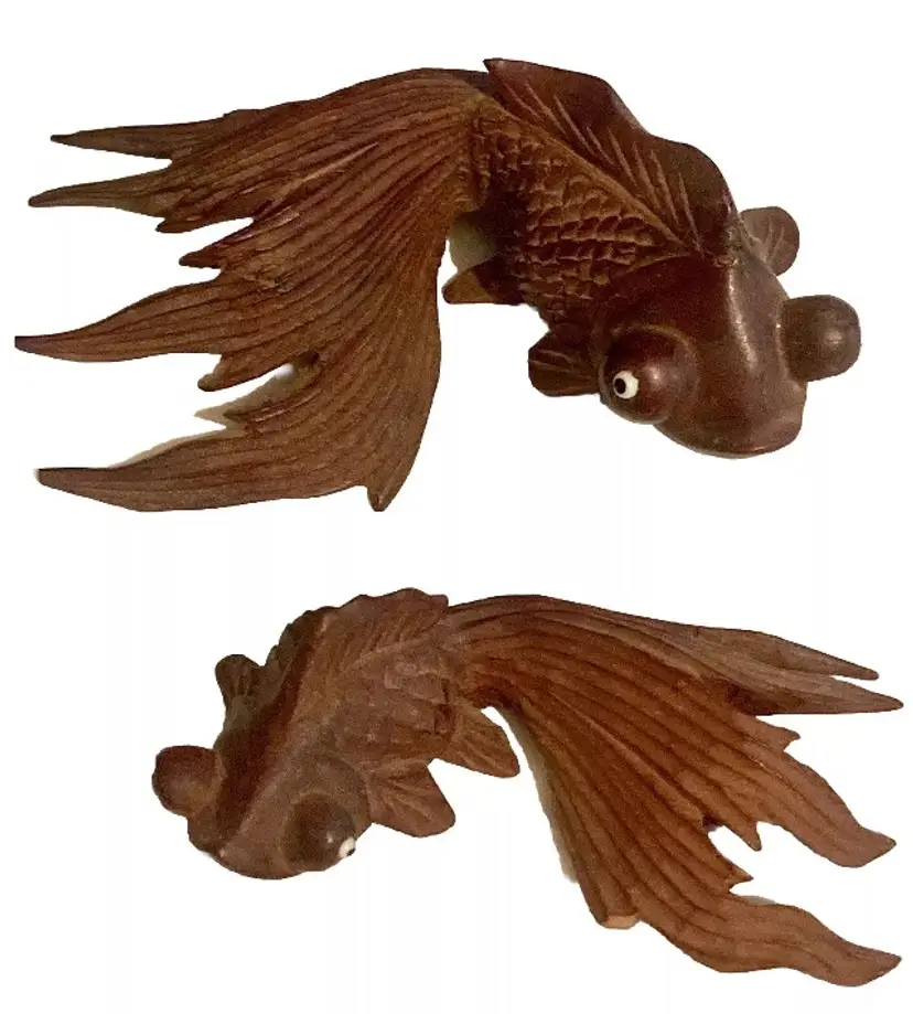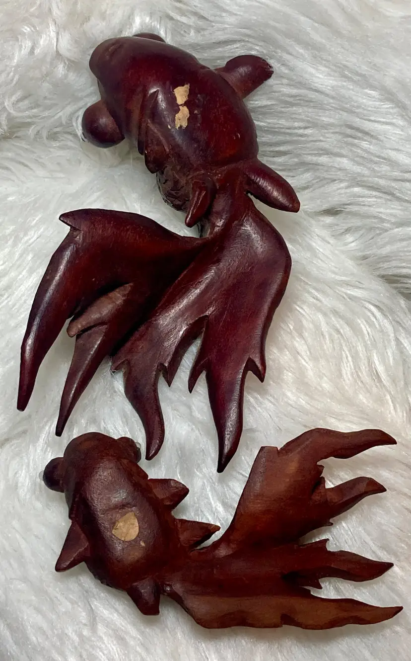 Offers encouraged Enhance your home decor with this exquisite vintage pair of rosewood Koi fish sculptures. The intricate carving and detailing of the fish is a true testament to the craftsmanship of the Chinese culture. These sculptures are handmade and showcase the beauty and elegance of Asian art.