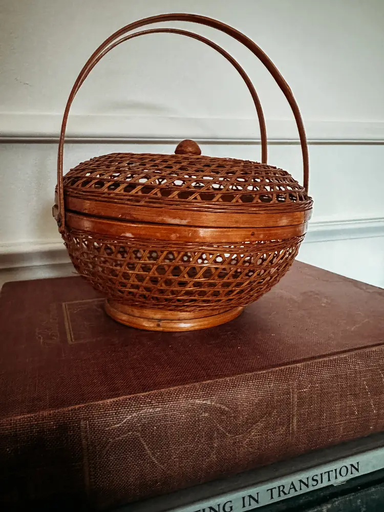 Nicely hand woven small lidded basket with two bent wood handles for sewing items, shelf display or storage of all sorts.