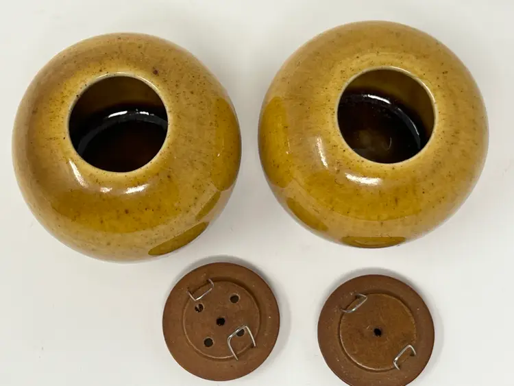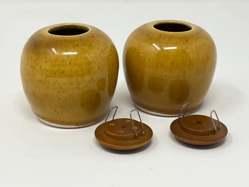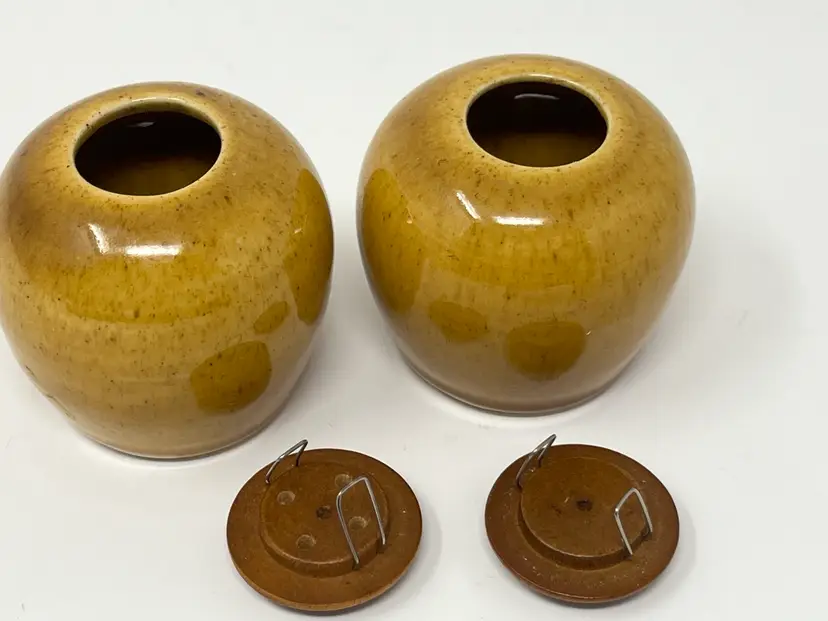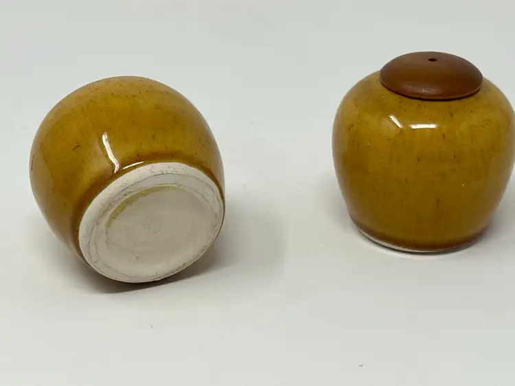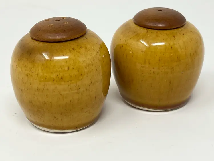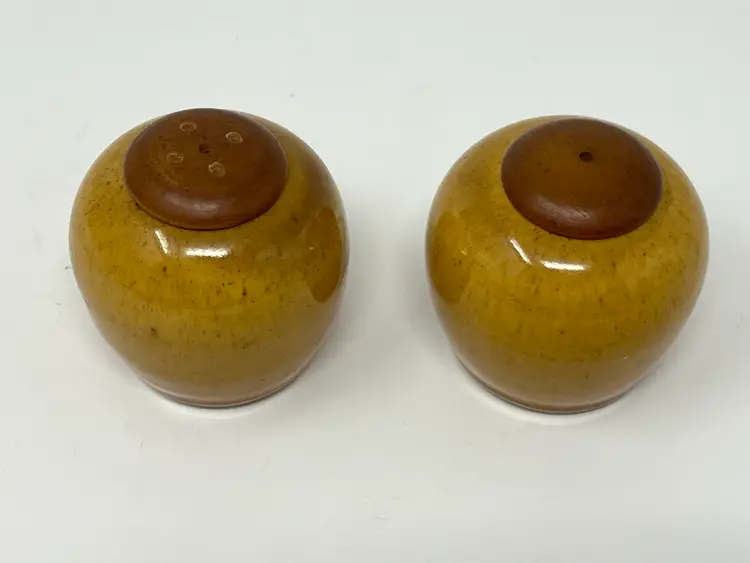 Vintage 1950s? Round Ceramic Salt & Pepper Shakers Wood Tops.