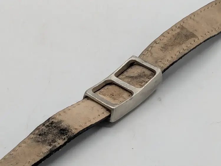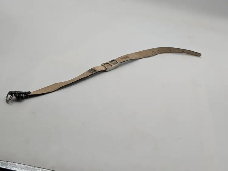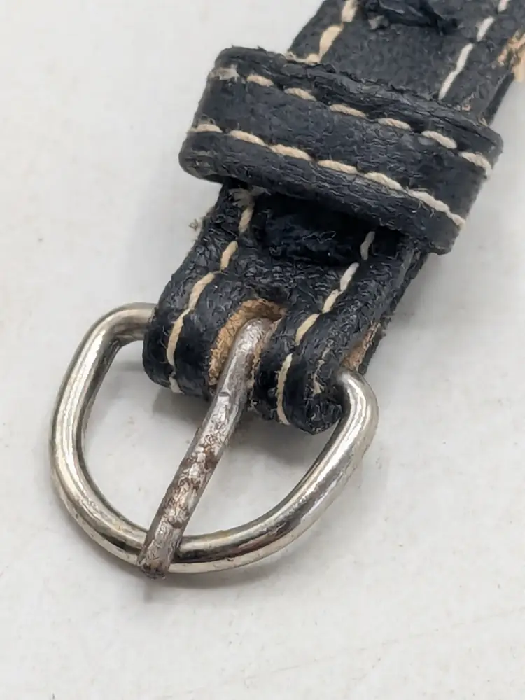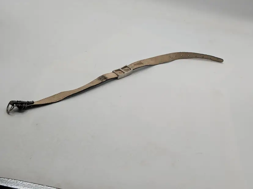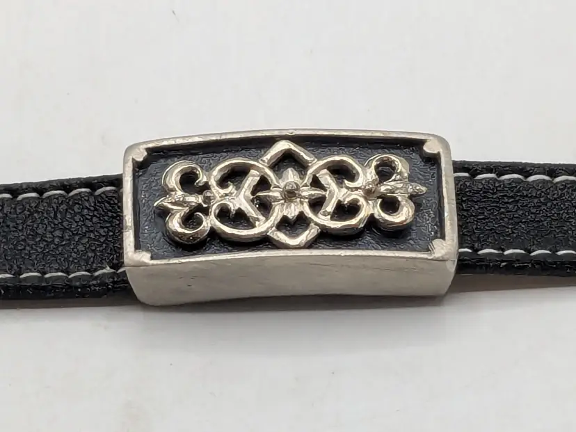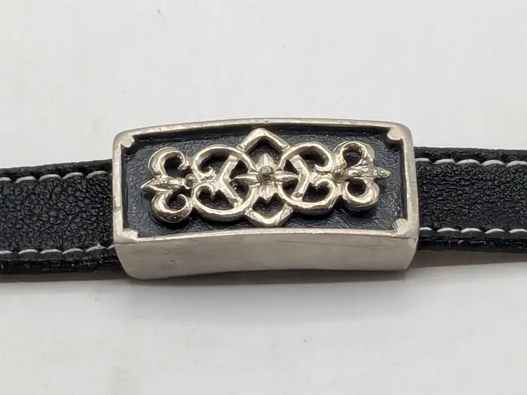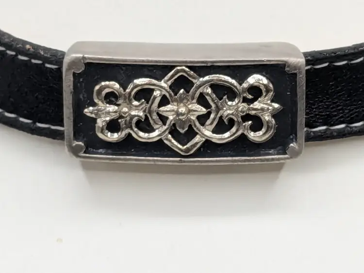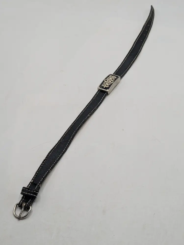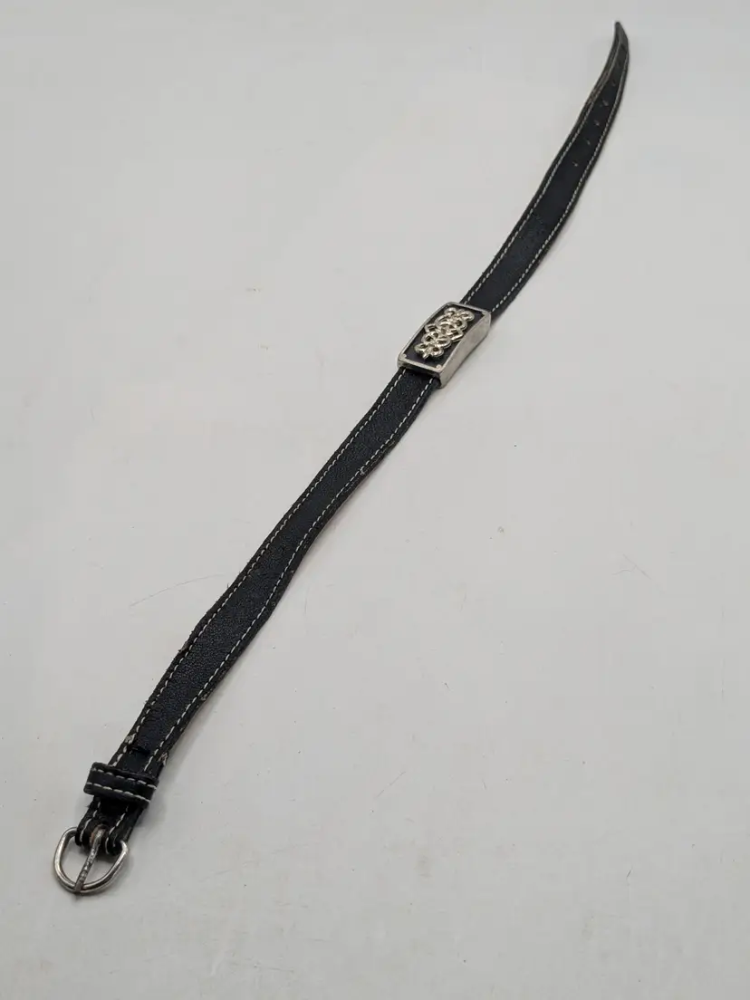 Good condition with some vintage wear on the back of leather strap. This is depicted in the last photo. Vintage Roxanne Assoulin black leather choker with silver tone Celtic knot. Size 12"-15"and 1/2" wide. Signed RA. wen