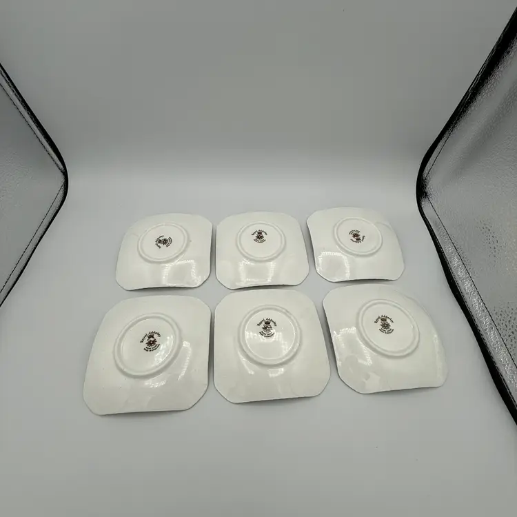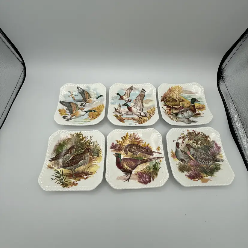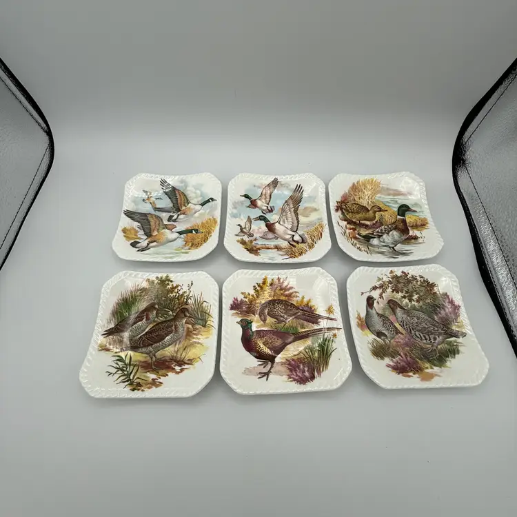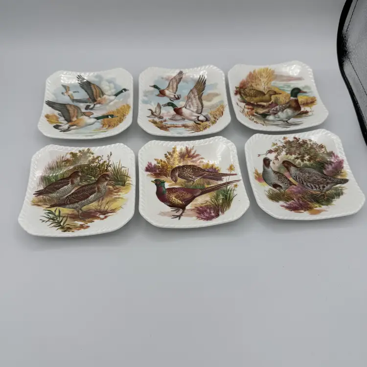 Vintage Royal Adderly English Bone China Game Bird Tea Bag Holders. Features various game birds such as ducks, quails, and pheasants. Measures 4" squares.