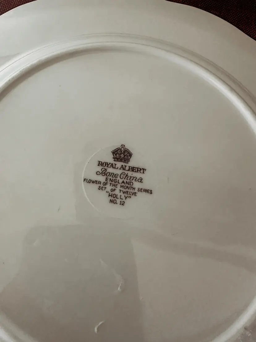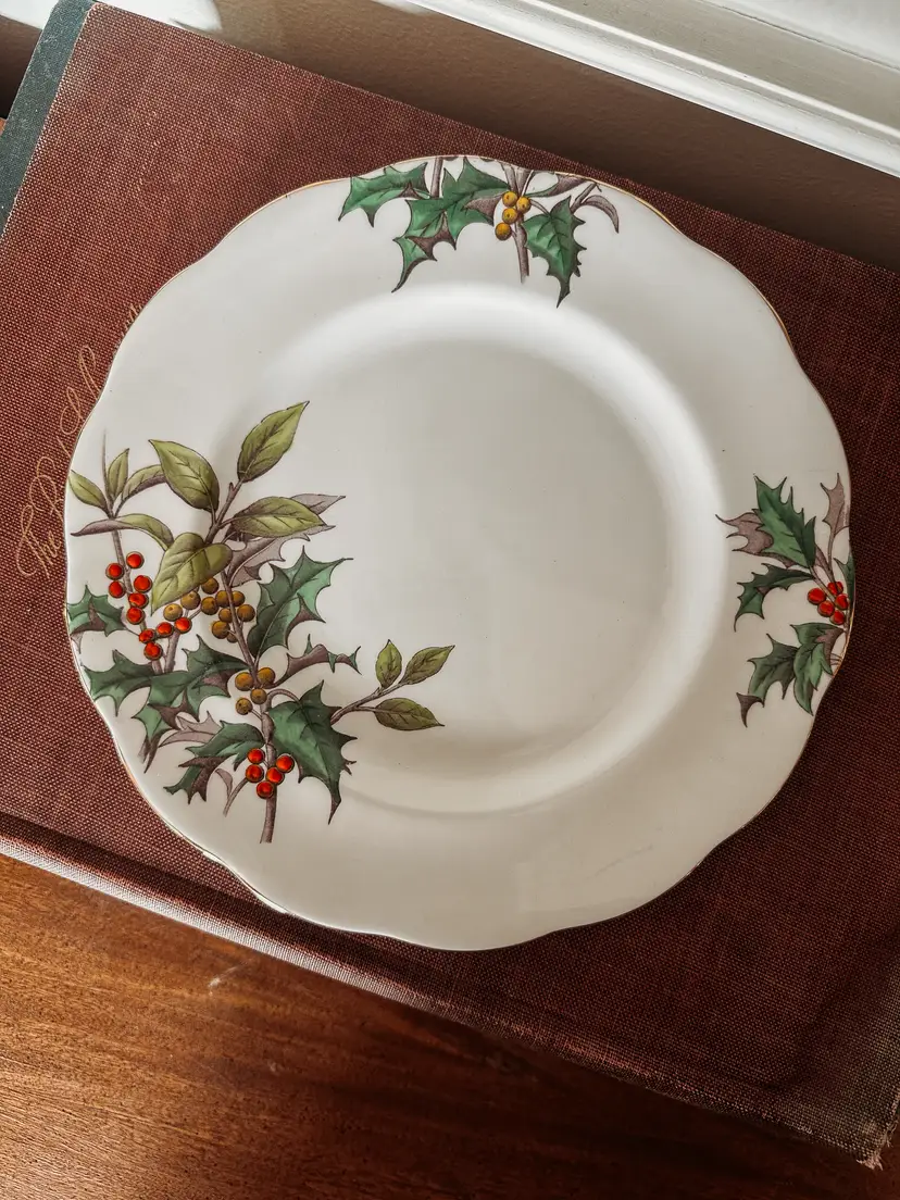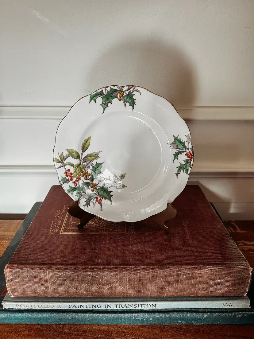 This is a vintage Royal Albert "Holly" plate from the "Flower of the Month" series. Pattern: "Holly," which represents December in the series. Material: Fine bone china. It has a scalloped rim with 22-carat gold accents and a hand-painted design of holly leaves and red and yellow berries. The "Flower of the Month" series, designed by Harold Holdcroft in 1962, is a popular and collectible pattern. No chips or cracks, some wear to the gold rim but in stunning vintage condition! 8.25" diameter