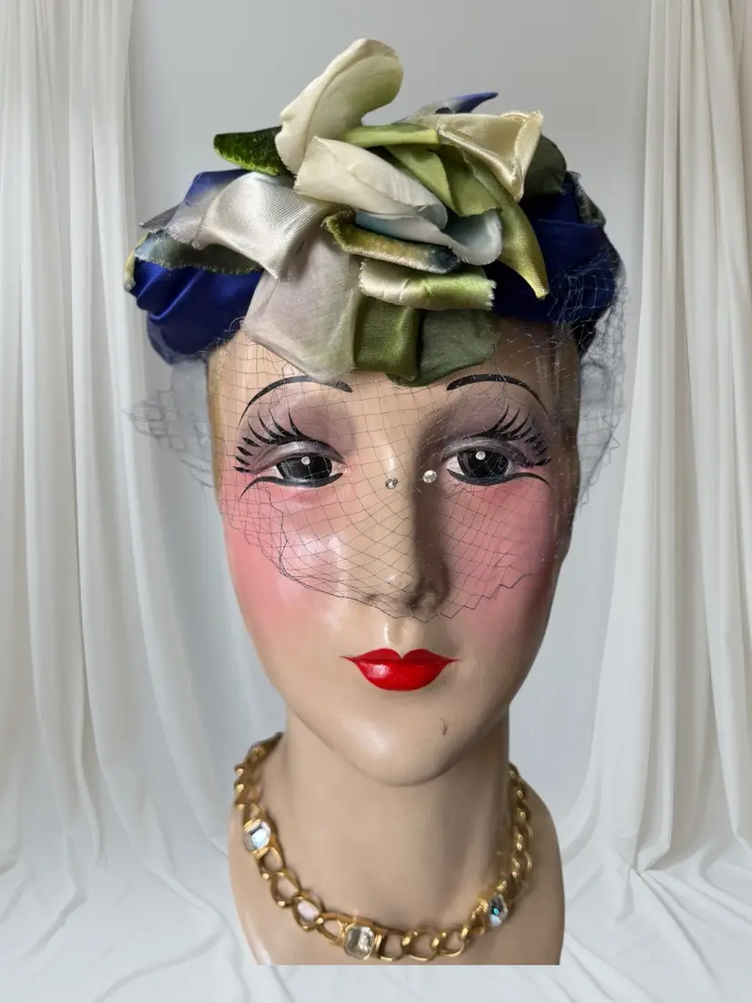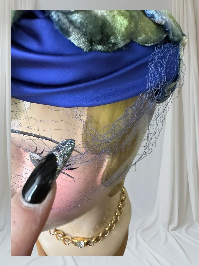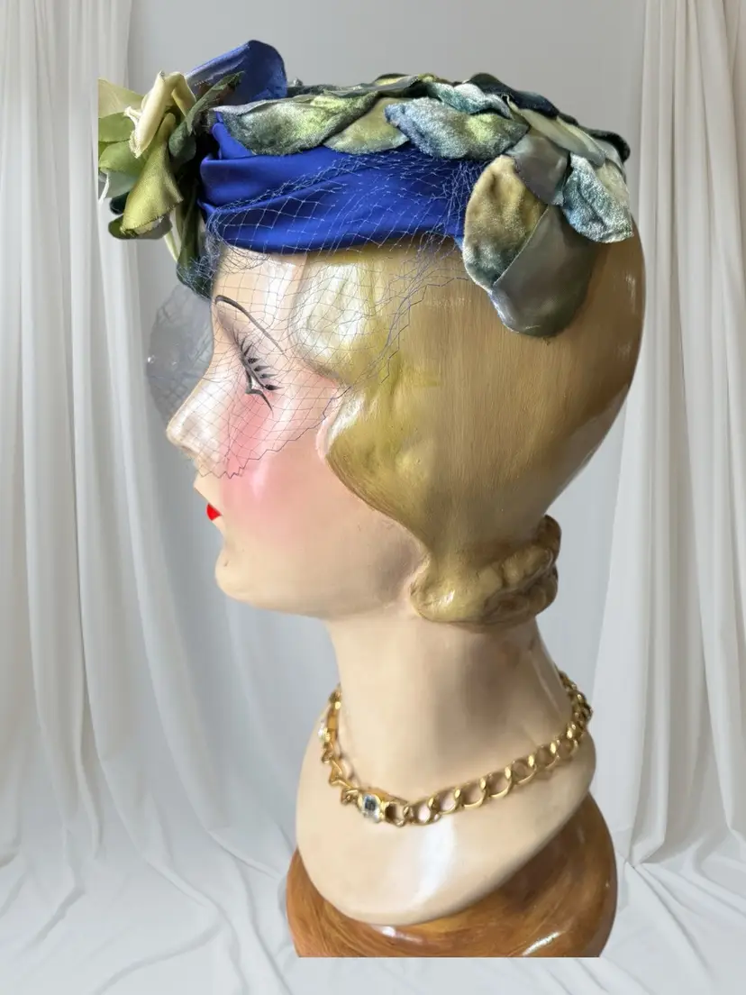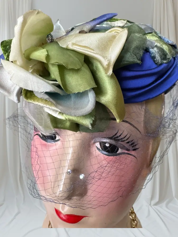 Vintage 1950s/60s blue and green organza and netting whimsy hat. It is 8" wide with 5" long netting in the front with 2 rhinestones to accent the face . . Stunning royal blue base with blended blue green flower petals covering the top .. has a large flower on the front with blue and green ribbon .. the netting is intact with one piece that’s come loose from the top on the left side .. has a Royal blue floral lace inside .. fits any size.. no label .. smoke and pet free