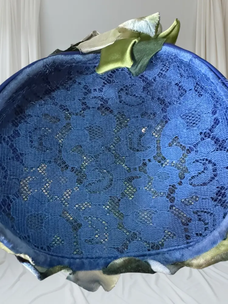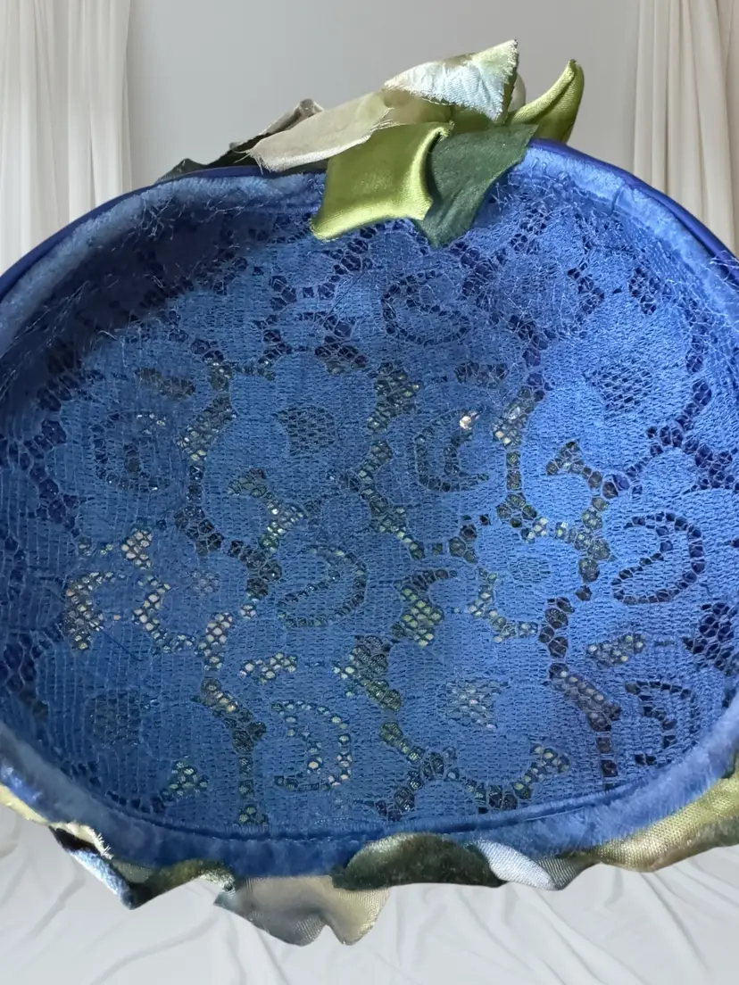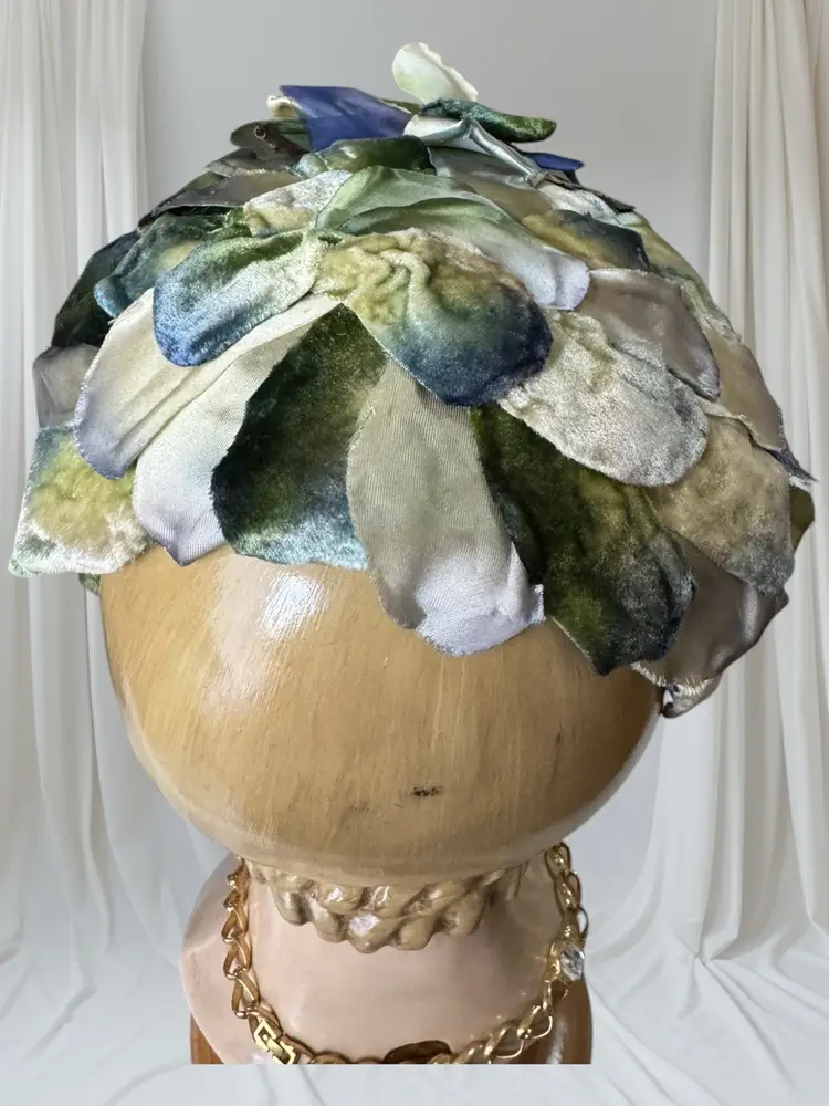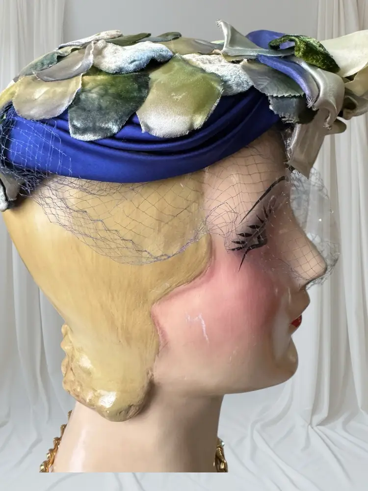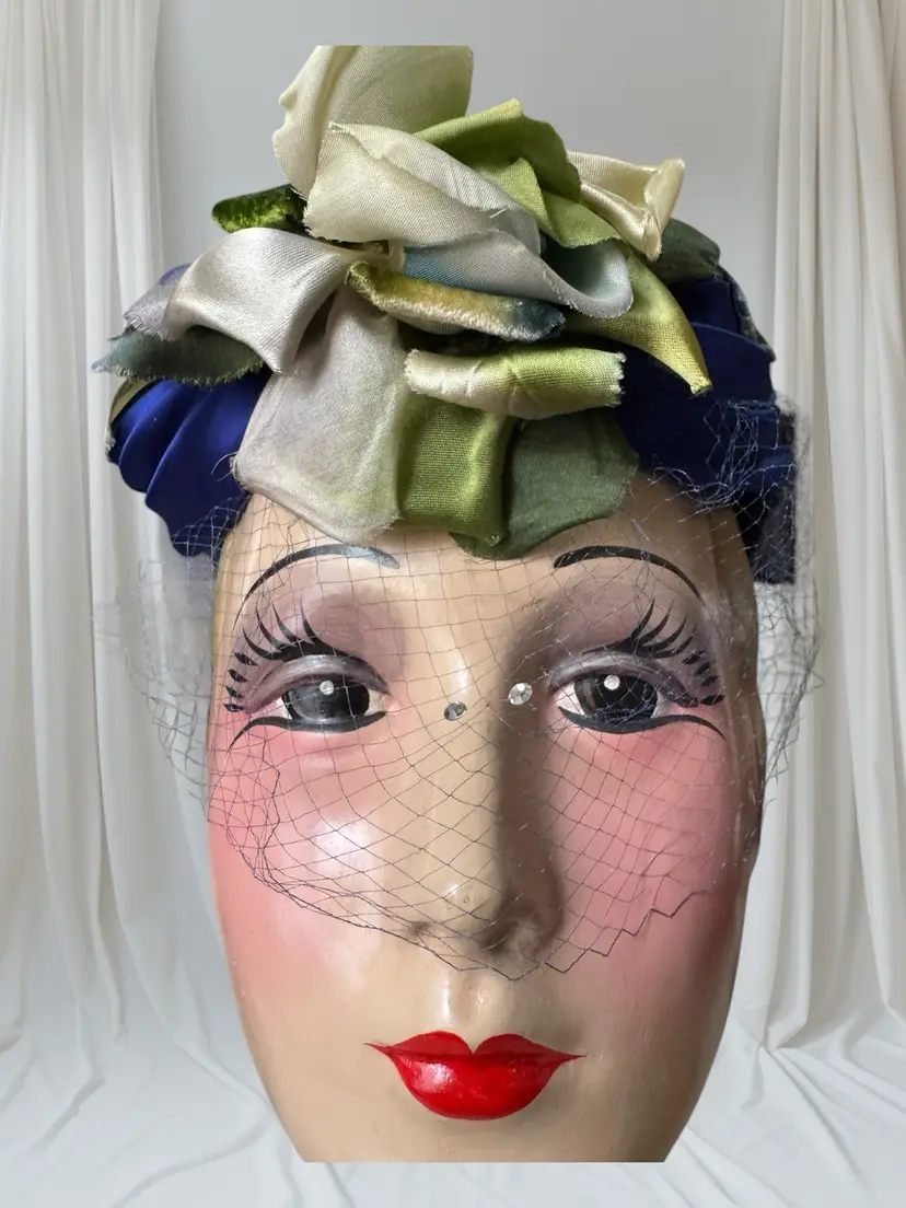 Vintage 1950s/60s blue and green organza and netting whimsy hat. It is 8" wide with 5" long netting in the front with 2 rhinestones to accent the face . . Stunning royal blue base with blended blue green flower petals covering the top .. has a large flower on the front with blue and green ribbon .. the netting is intact with one piece that’s come loose from the top on the left side .. has a Royal blue floral lace inside .. fits any size.. no label .. smoke and pet free
