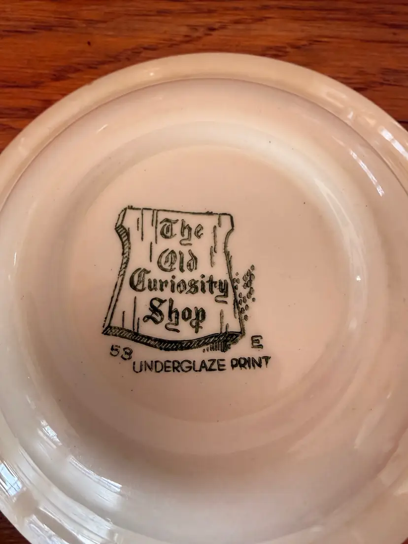 Charming vintage Royal China Company bowls featuring “The Old Curiosity Shop,” inspired by Charles Dickens’ classic novel. These beautifully illustrated bowls showcase a whimsical Dickensian character at center, surrounded by a rich green underglaze transferware border with storybook-style details.