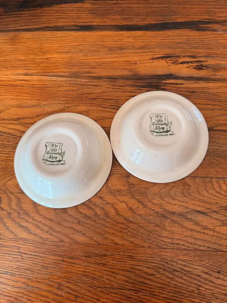 Details: Maker: Royal China Company (Sebring, Ohio, USA) Pattern: The Old Curiosity Shop Date: c. 1930s–1940s Material: Semi-vitreous ceramic Decoration: Green underglaze transfer print Size: Approx. 5.5 inches diameter Quantity: Set of 2 matching bowls