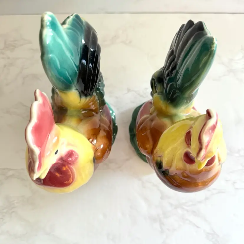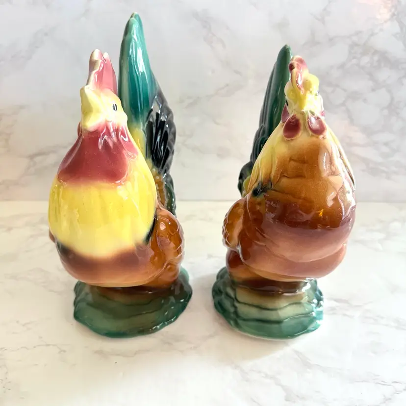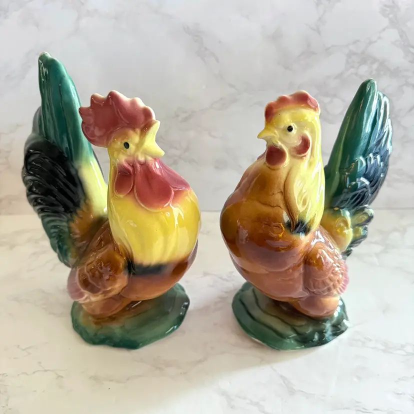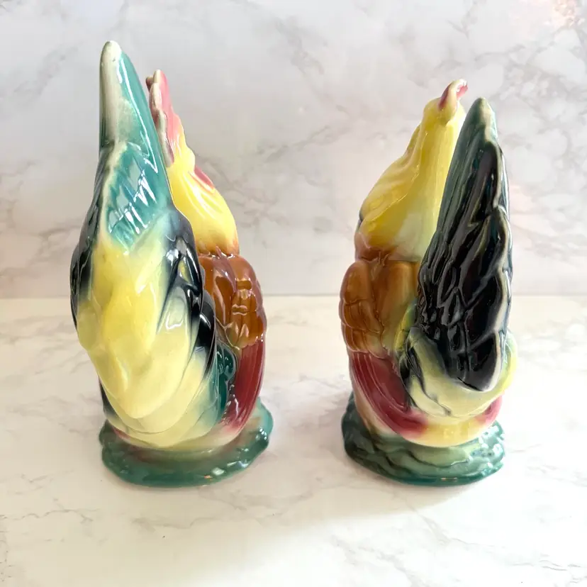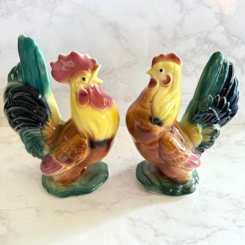 Excellent vintage condition with no chips or cracks. Rooster measures about 3-3/4” x 6” x 8”h and hen measures about 3-5/8” x 6” x 7”h