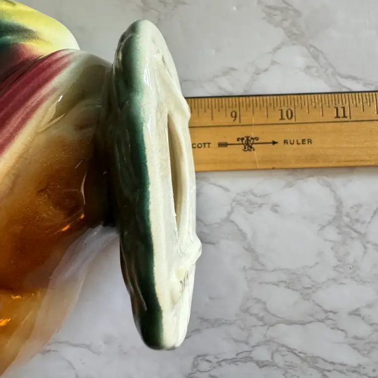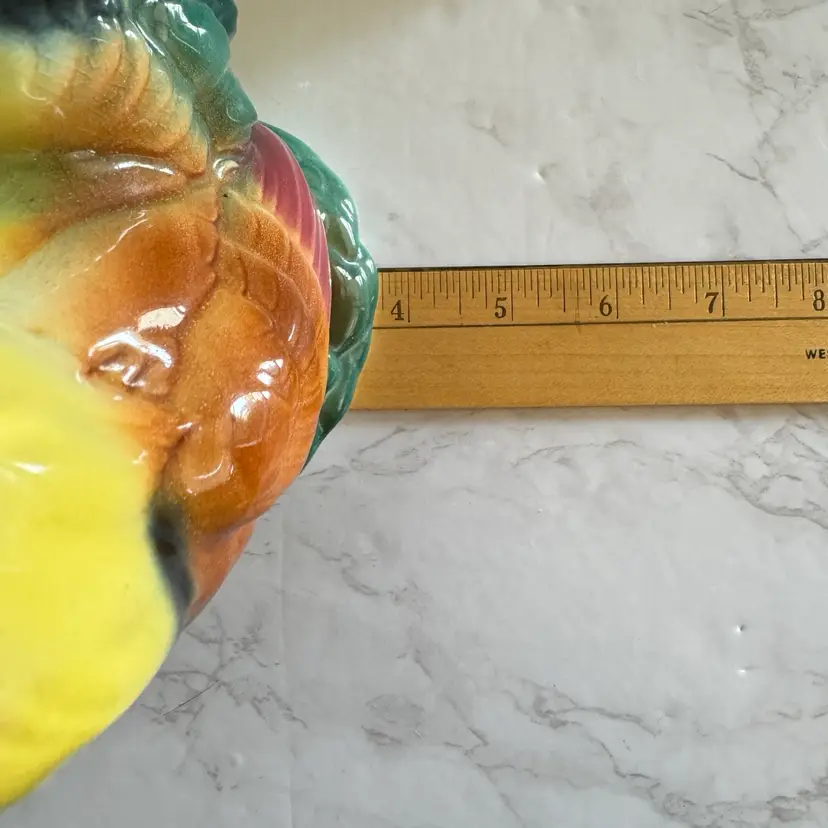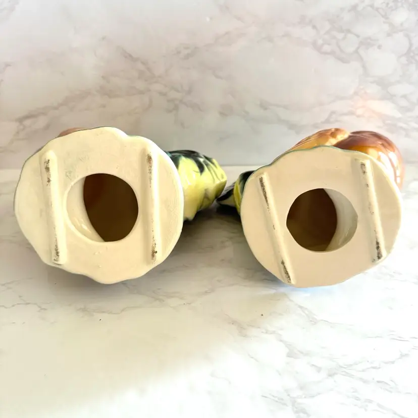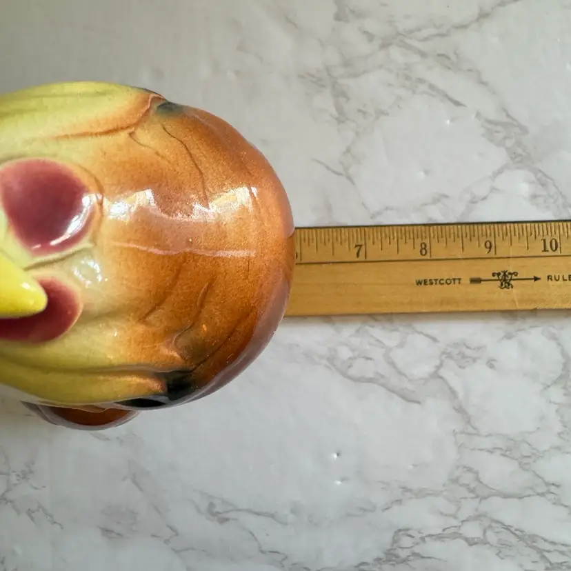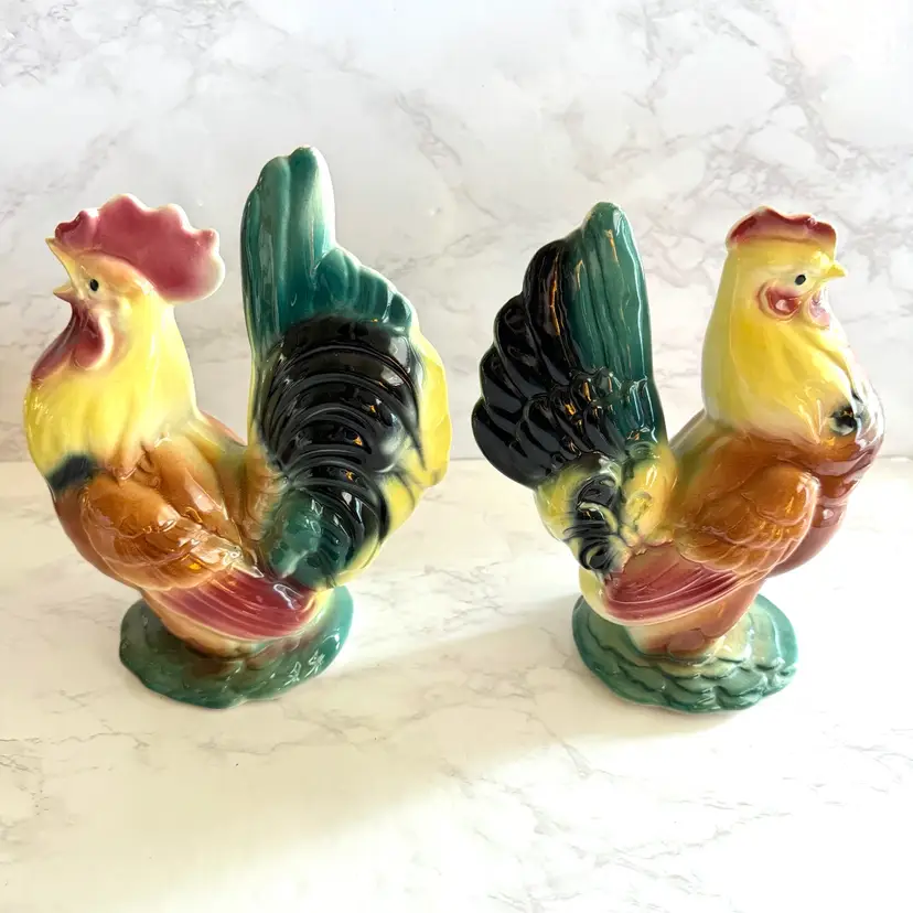 Excellent vintage condition with no chips or cracks. Rooster measures about 3-3/4” x 6” x 8”h and hen measures about 3-5/8” x 6” x 7”h