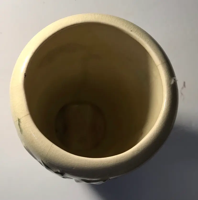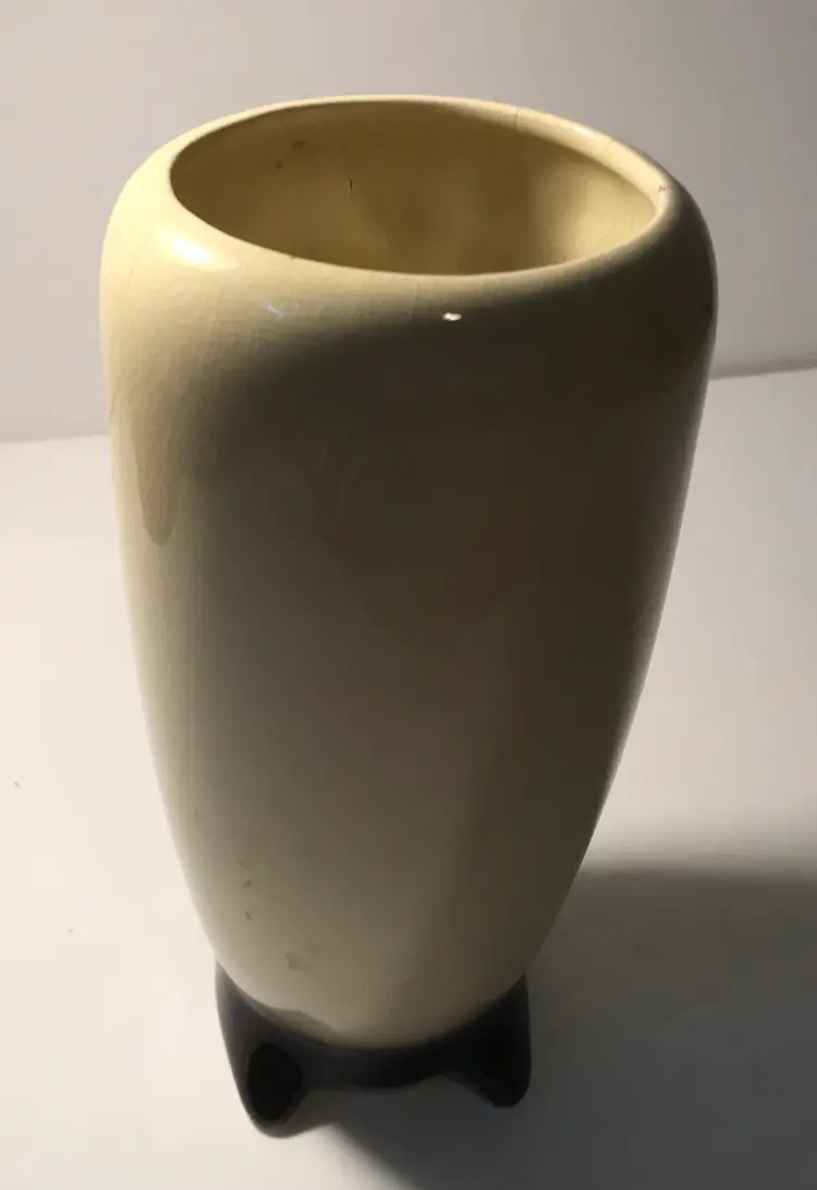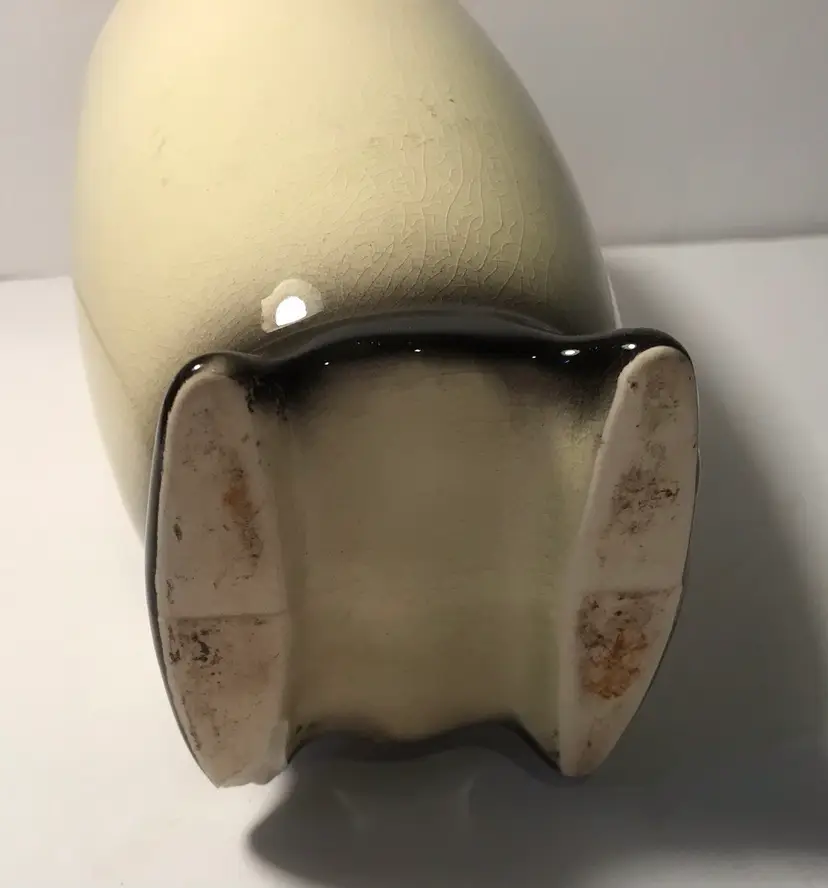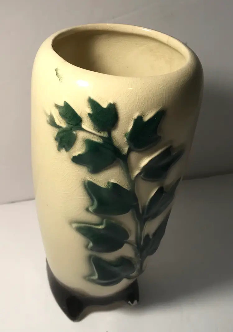 Vintage Royal Copley Vase Green Black Base Ivy Leaves. Does have a chip on foot as seen in picture and has crazing from age.